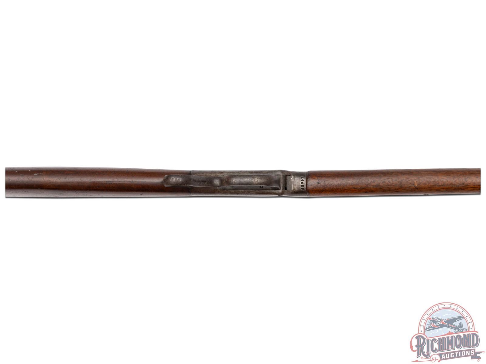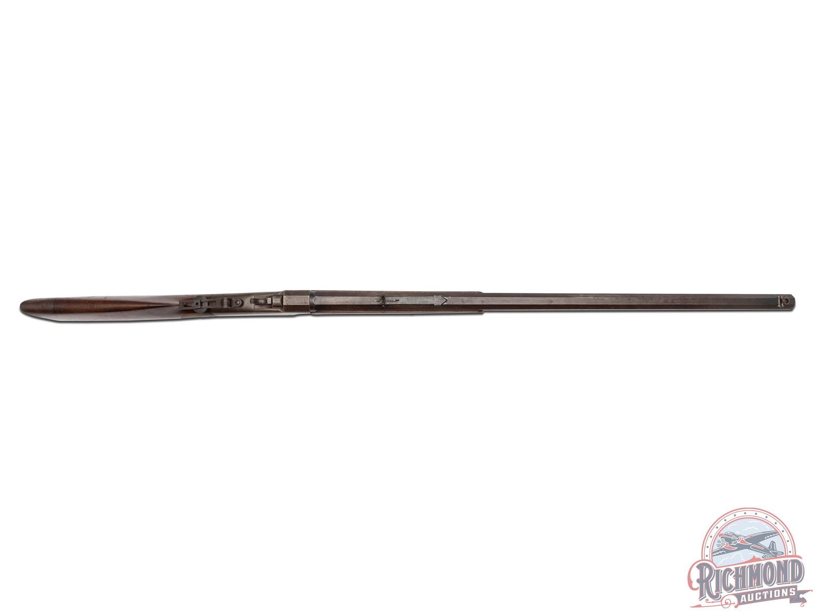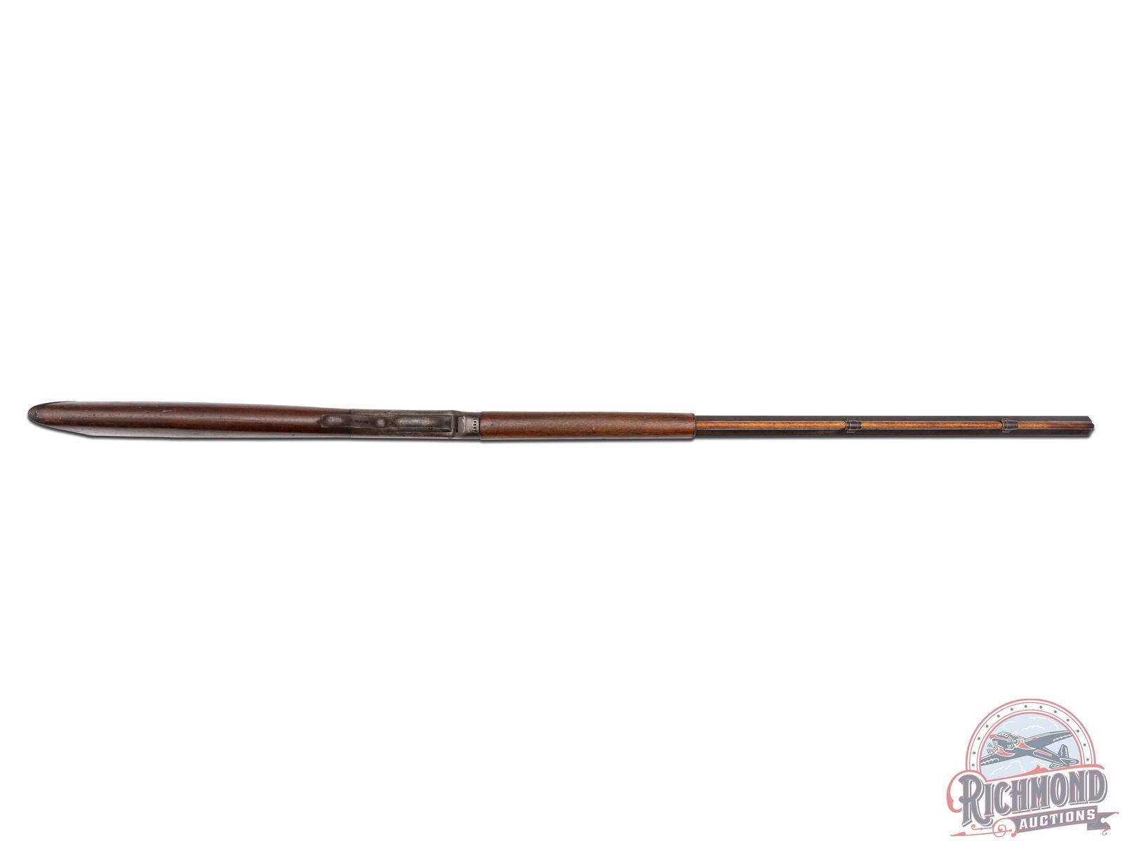 Made by the J.M. Marlin Company in 1890. Blued 30" octagon barrel with Beech front sight and Rocky Mountain rear adjustable sight in 38-55 caliber. Comes with under barrel mounted hardwood ramrod. Case-hardened Marlin two address marked action with factory double set triggers and ring loop lever. Tang has Ballard Vernier sight. Walnut plain standard stocks with steel crescent butt plate. J.T. Livengood Collection. CALIBER: 38-55. S/N: 16837. FFL STATUS: Antique.