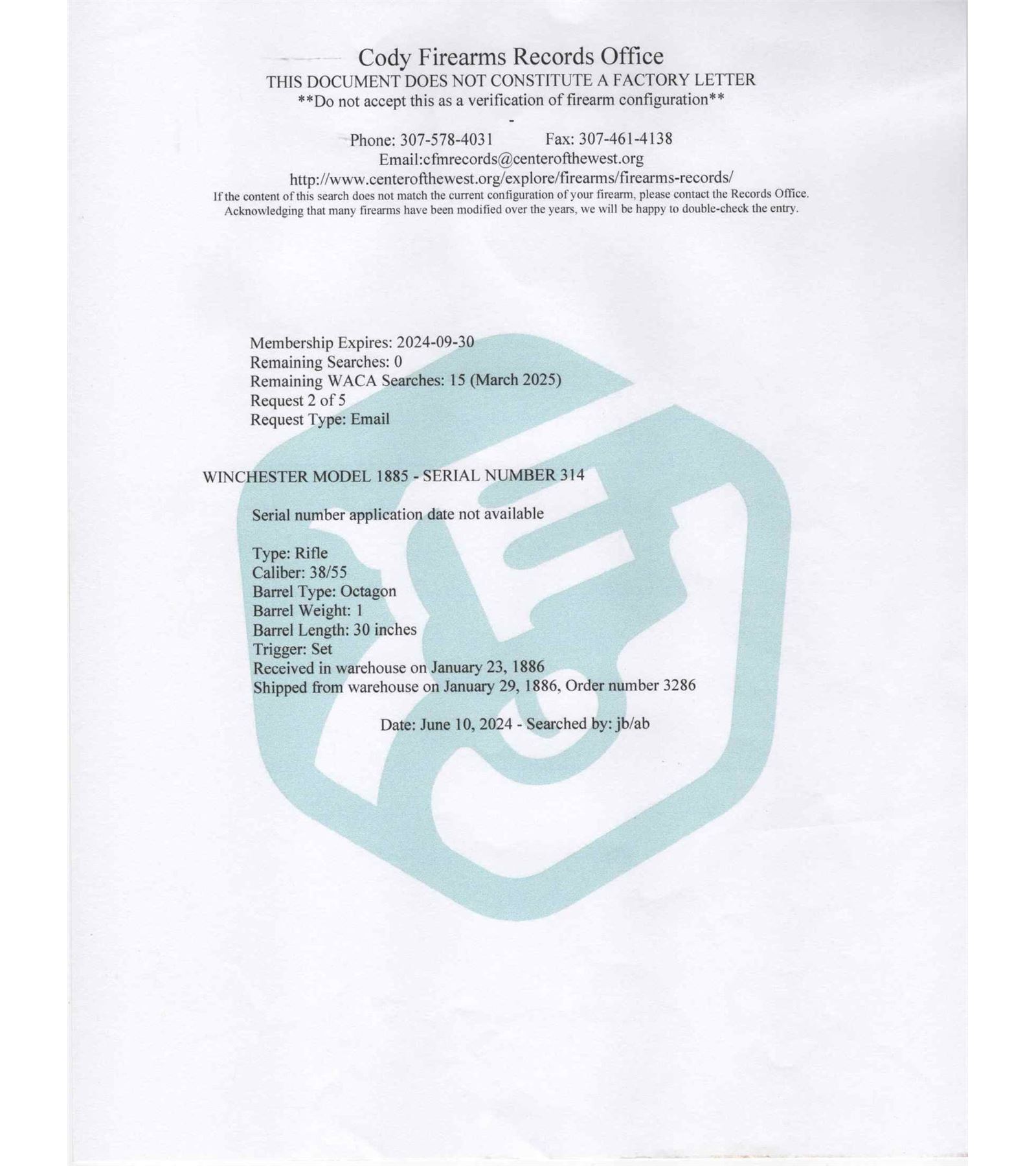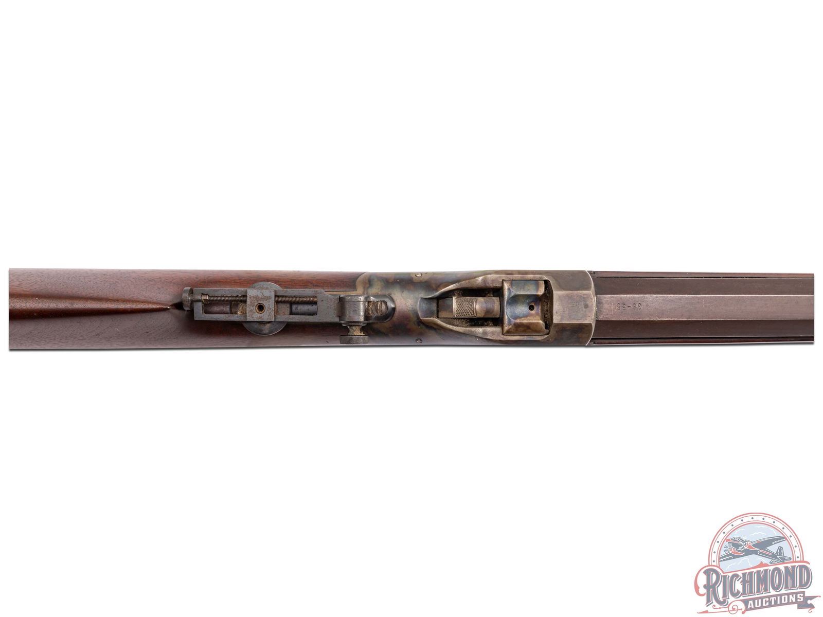 Made by Winchester Repeating Arms in 1886. 30" blued full octagon No. 3 barrel with Winchester two line address in 38-55 caliber. Has Globe front sight and plugged rear sight with reproduction Vernier tang sight. Case-hardened "Thickside" action with faceted receiver and factory single set trigger. Standard plain walnut stock with case-hardened steel crescent butt plate and matching plain walnut splinter forearm with diamond ebony Schnabel inlay. Cody research confirms all options but barrel weight which was listed as a "1". J.T. Livengood Collection. CALIBER: 38-55. S/N: 314. FFL STATUS: Antique.