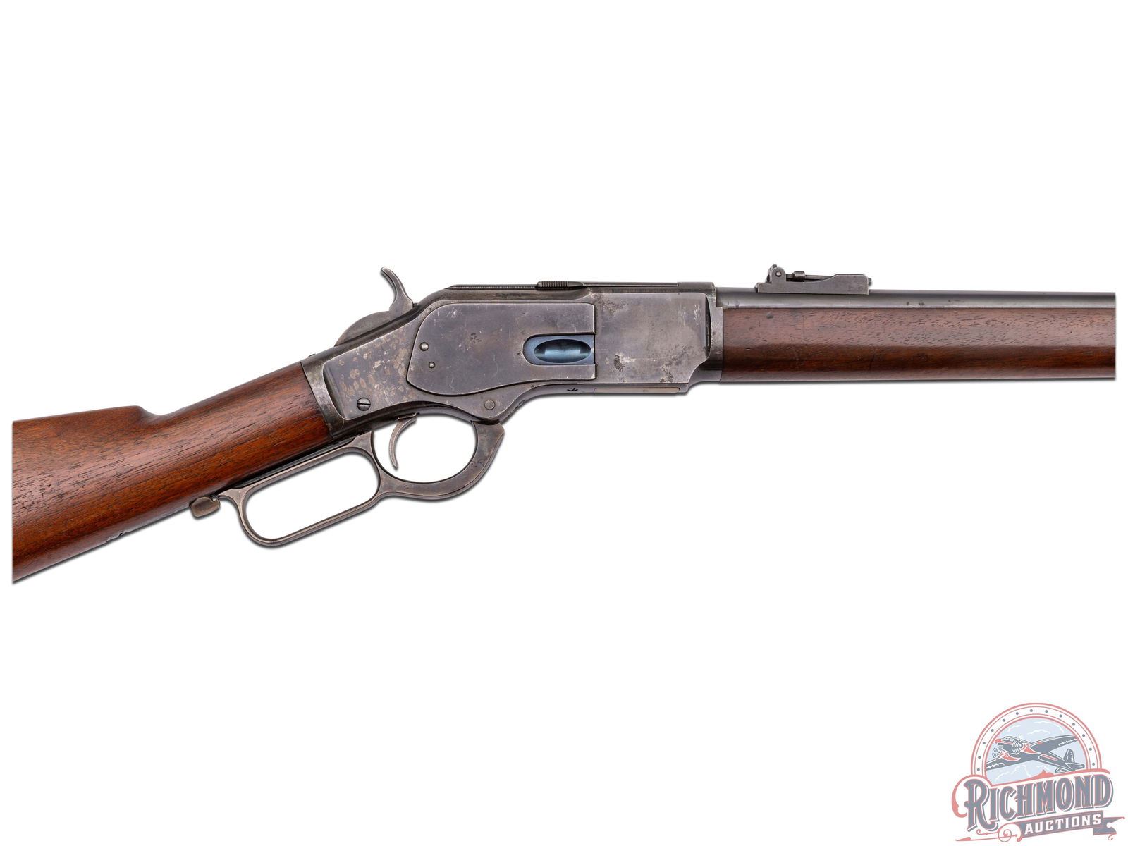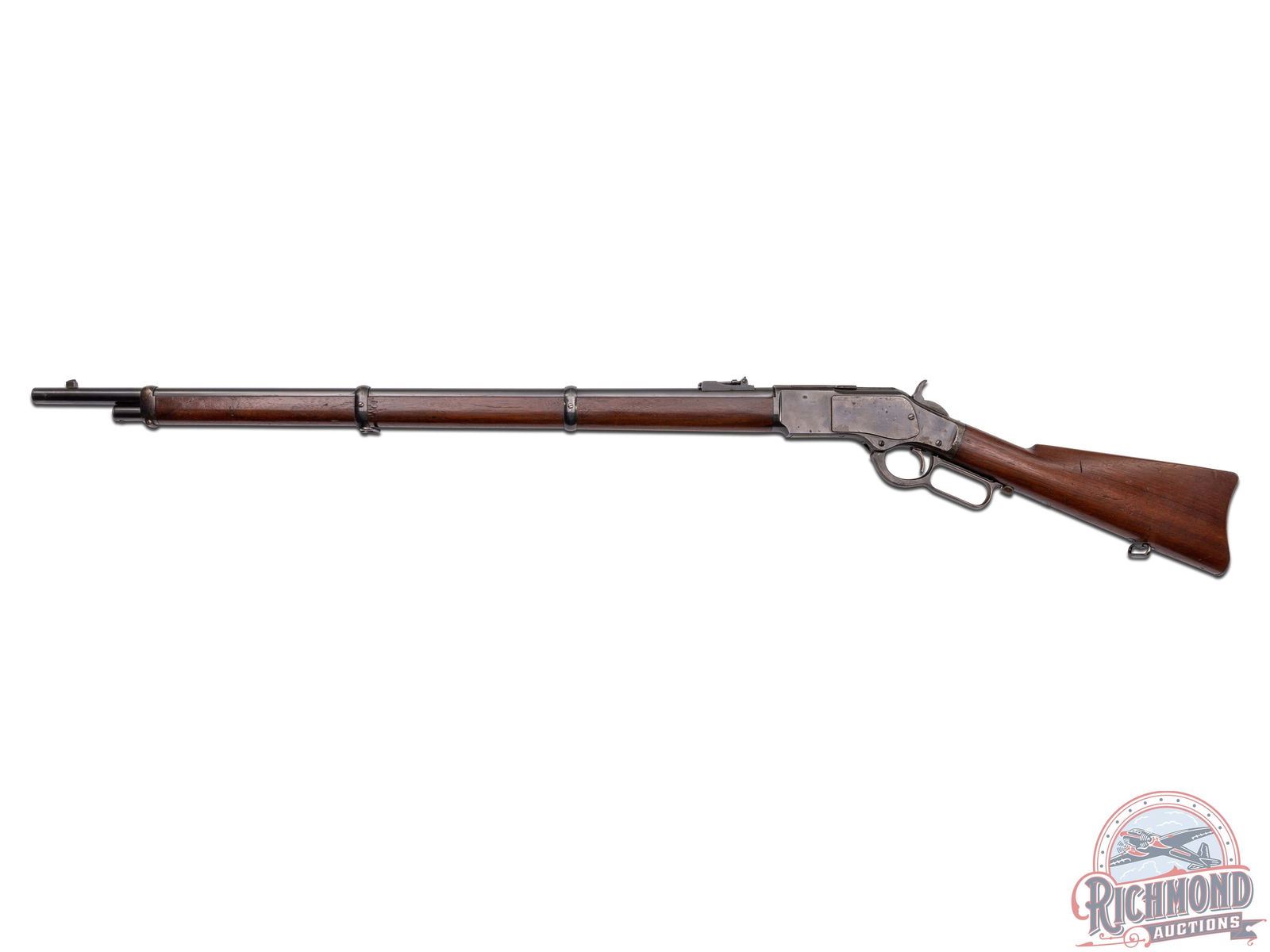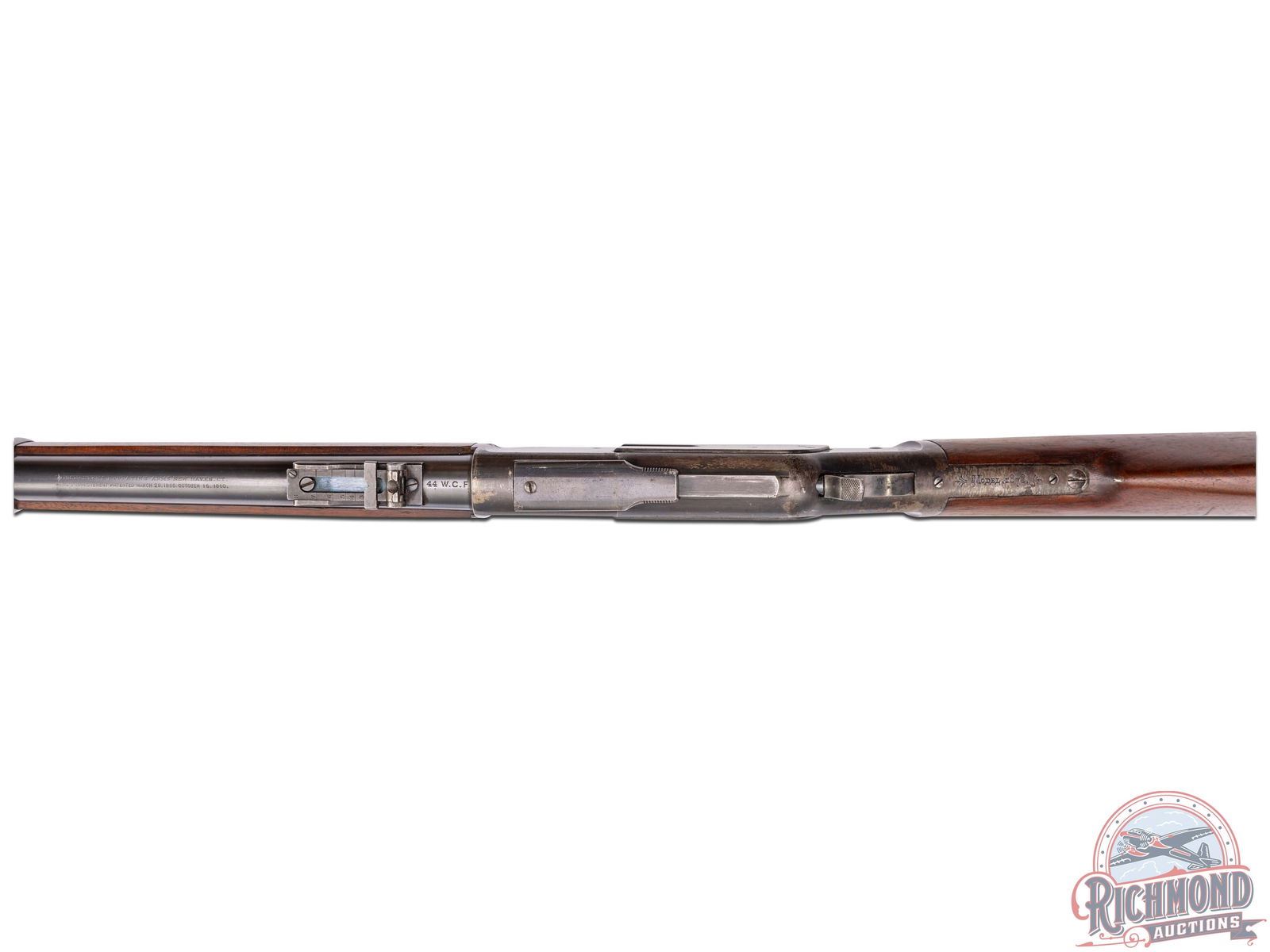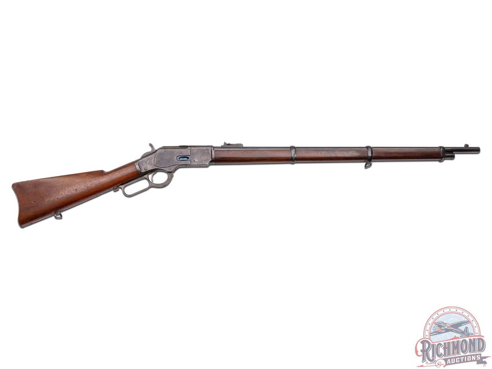 Manufactured in 1902. Features a 30" blued barrel with three barrel rings, factory rear ladder adjustable sight and post blade front sight. Near full length magazine tube. The top of the barrel is stamped "WINCHESTER'S REPEATING ARMS, NEW HAVEN, CT / KING'S-IMPROVEMENT-PATENTED-MARCH 29, 1866. OCTOBER 16, 1860" and "44 WCF" stamped near the receiver. Third model receiver with dust cover, side loading gate, lever lock and the iconic brass follower. Tang is stamped ">MODEL 1873<". Walnut straight stock with steel butt plate with brass gate for field cleaning storage. Near full length wood musket style forearm. Equipped with factory sling rings. Factory letter indicates that it shipped from the factory as a musket model. LOP: 13". CALIBER: 44 WCF. S/N: 571500B. FFL STATUS: Curio & Relic.