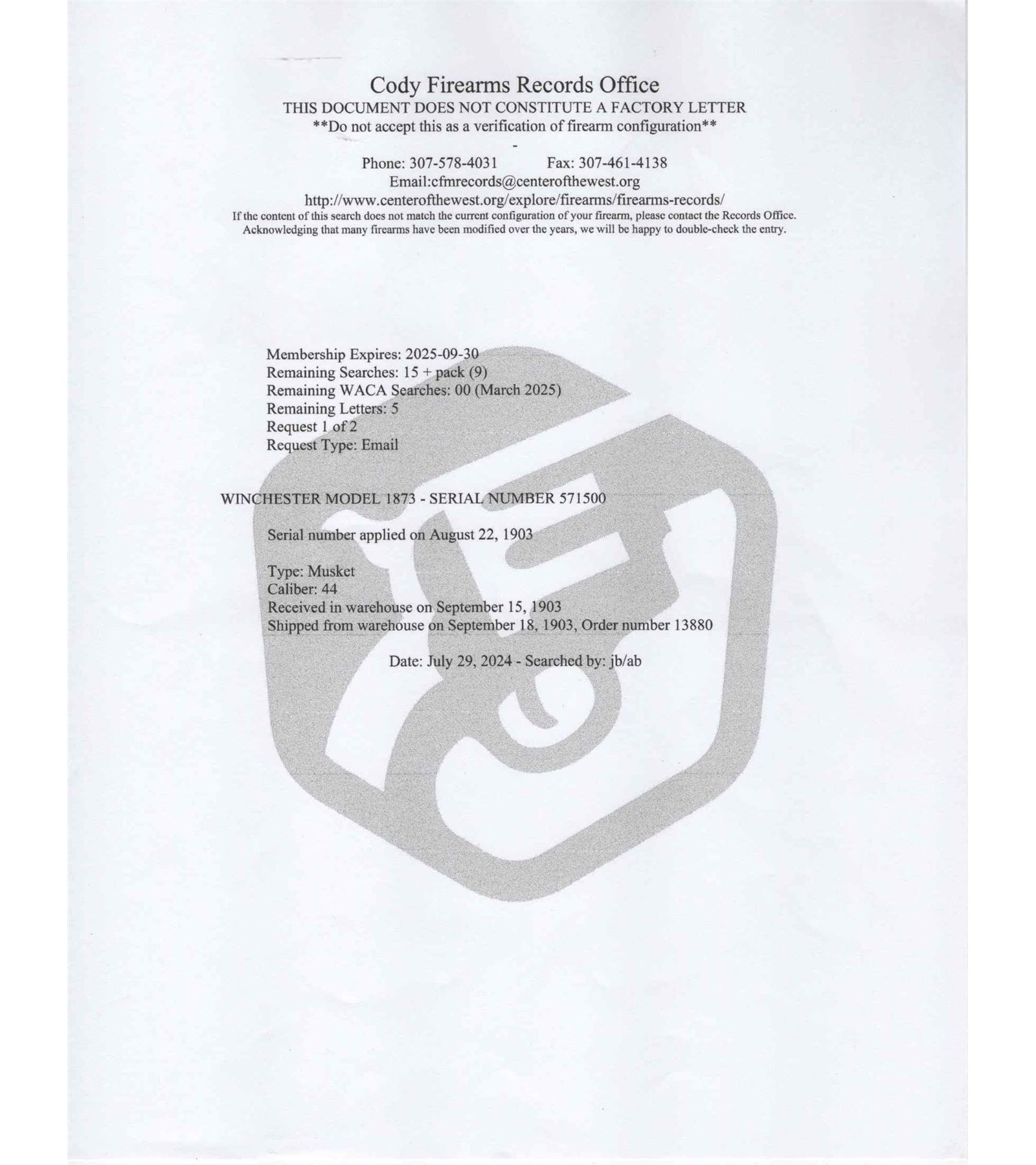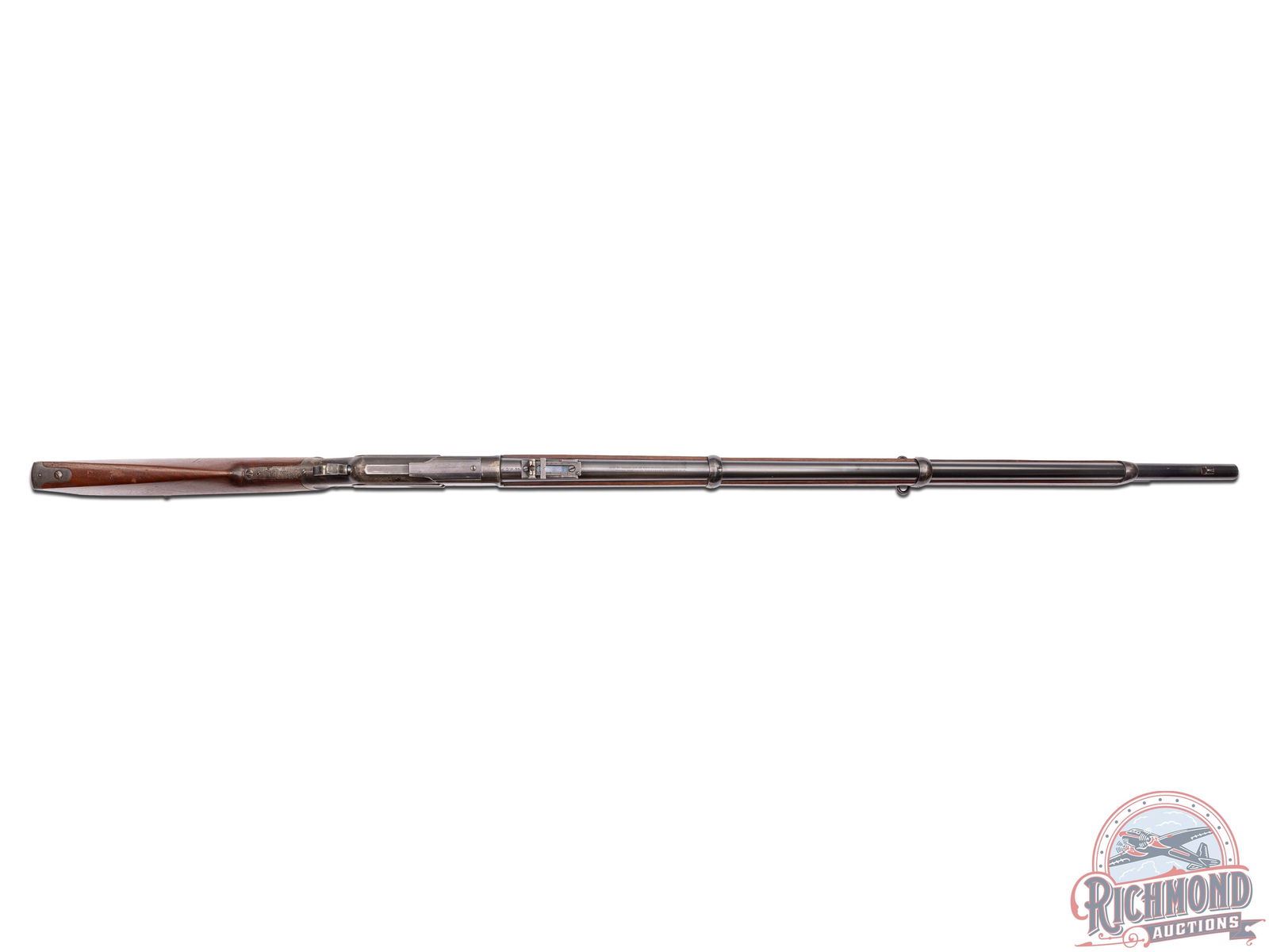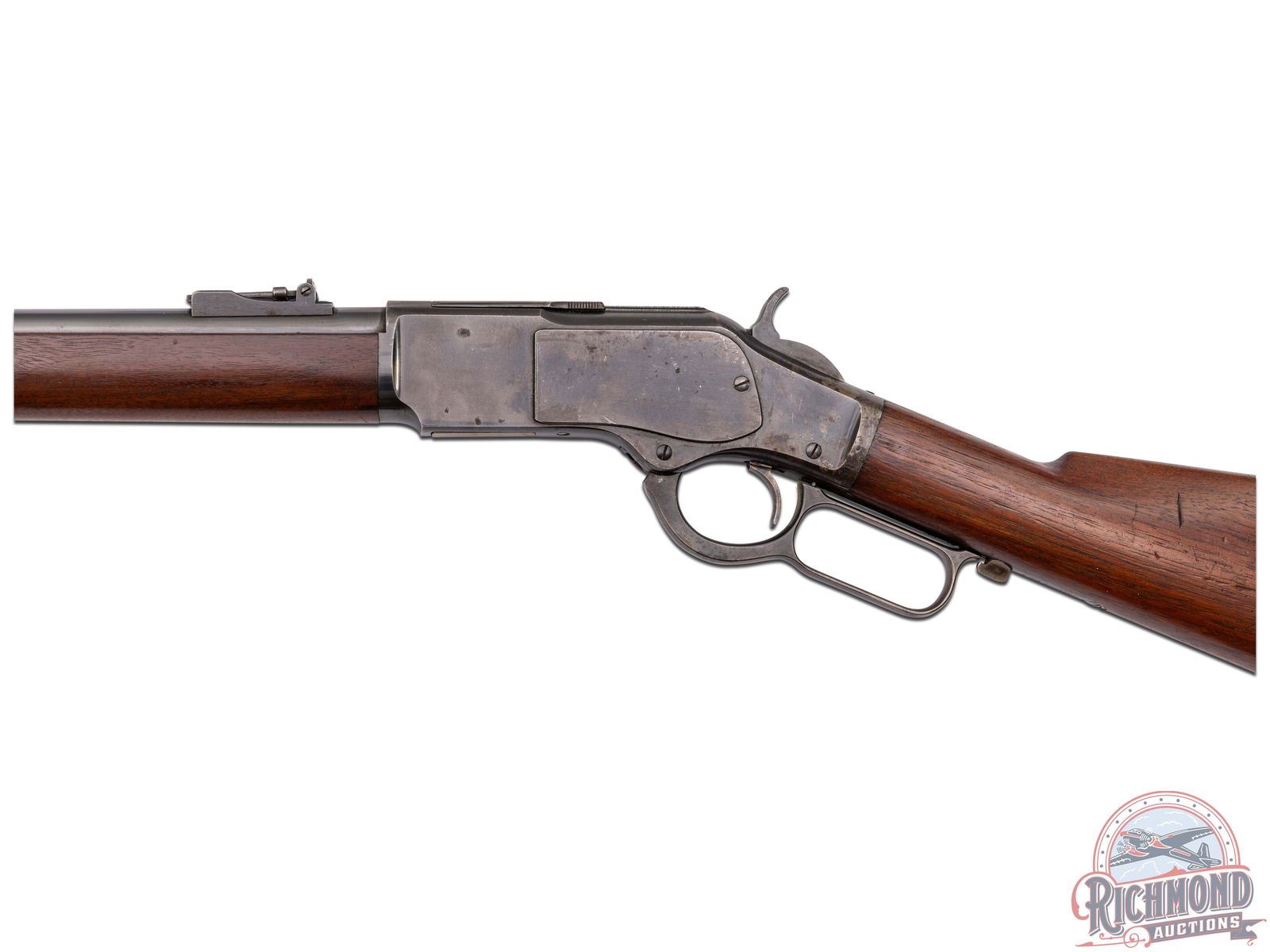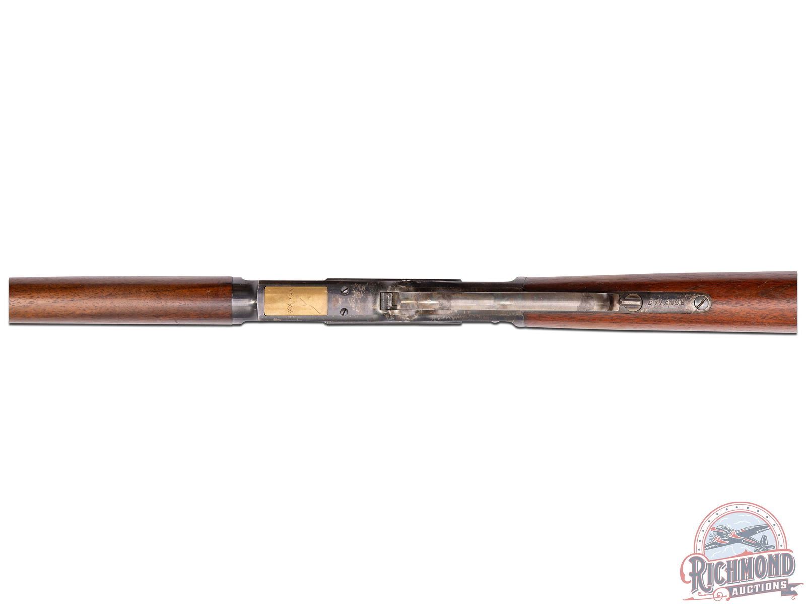 Manufactured in 1902. Features a 30" blued barrel with three barrel rings, factory rear ladder adjustable sight and post blade front sight. Near full length magazine tube. The top of the barrel is stamped "WINCHESTER'S REPEATING ARMS, NEW HAVEN, CT / KING'S-IMPROVEMENT-PATENTED-MARCH 29, 1866. OCTOBER 16, 1860" and "44 WCF" stamped near the receiver. Third model receiver with dust cover, side loading gate, lever lock and the iconic brass follower. Tang is stamped ">MODEL 1873<". Walnut straight stock with steel butt plate with brass gate for field cleaning storage. Near full length wood musket style forearm. Equipped with factory sling rings. Factory letter indicates that it shipped from the factory as a musket model. LOP: 13". CALIBER: 44 WCF. S/N: 571500B. FFL STATUS: Curio & Relic.