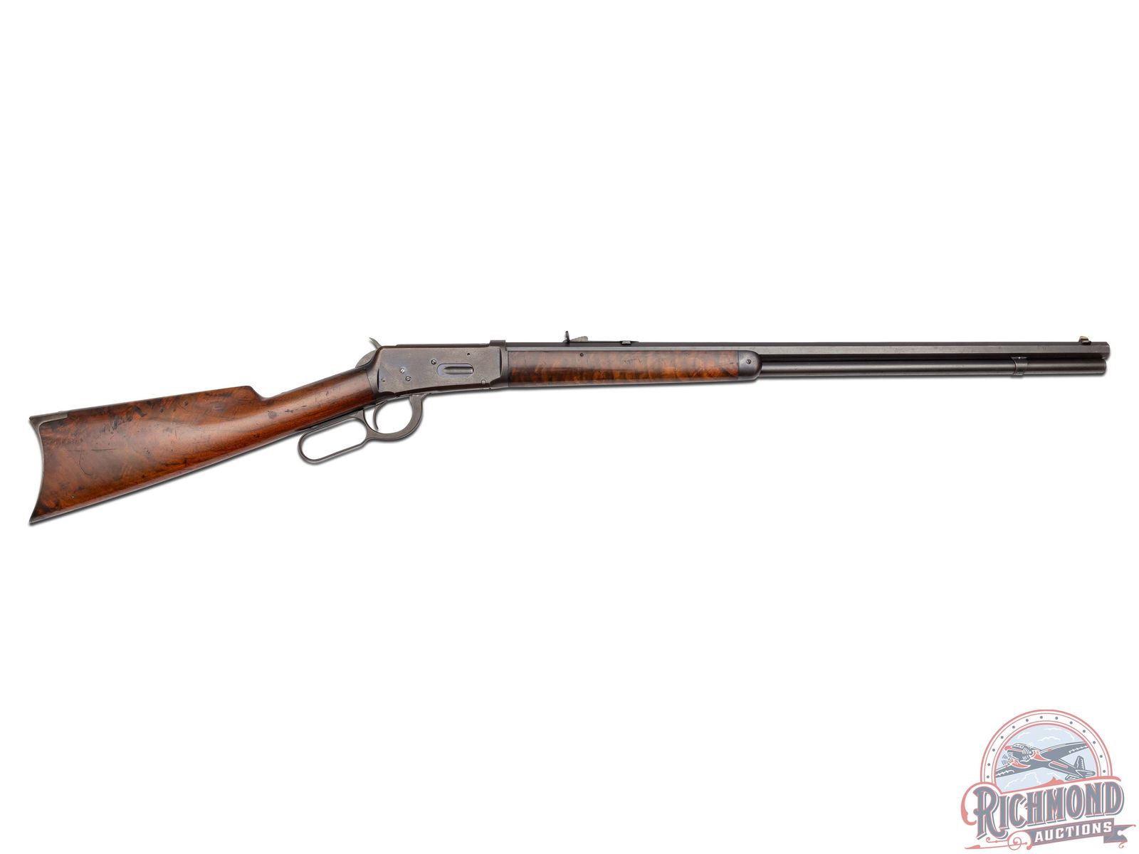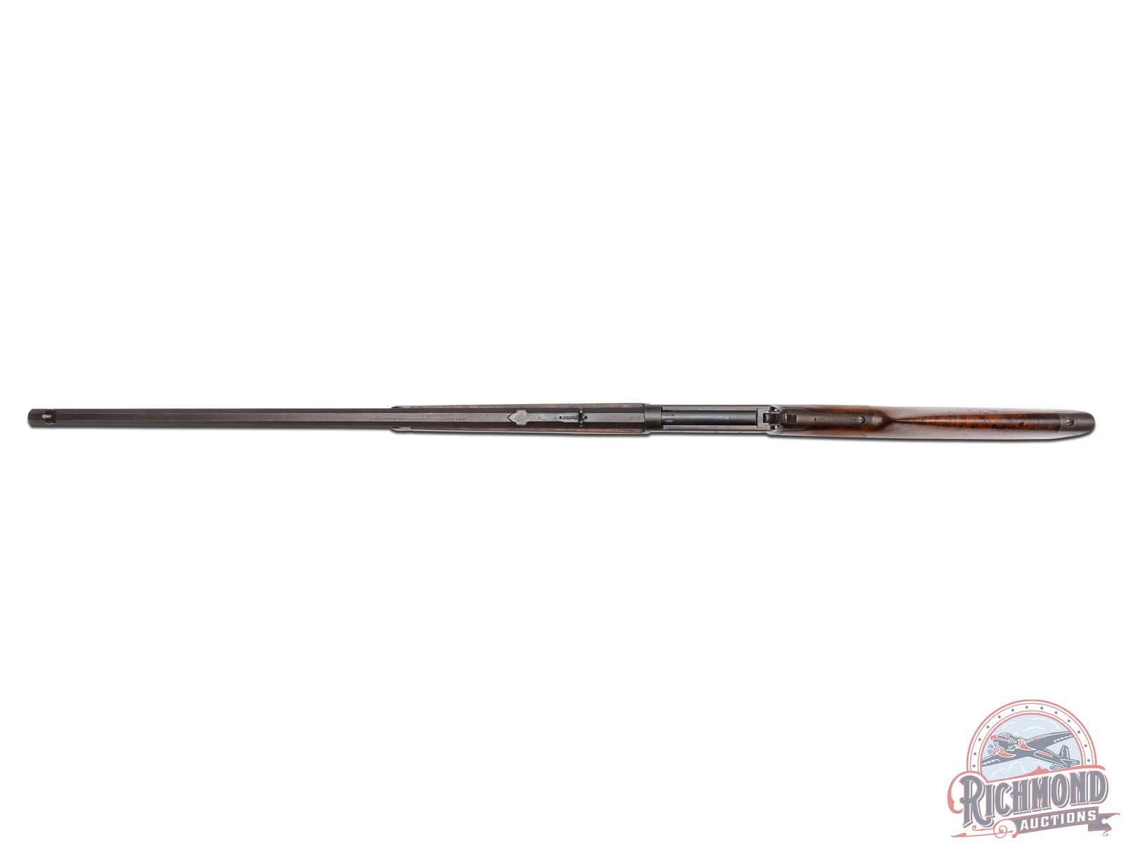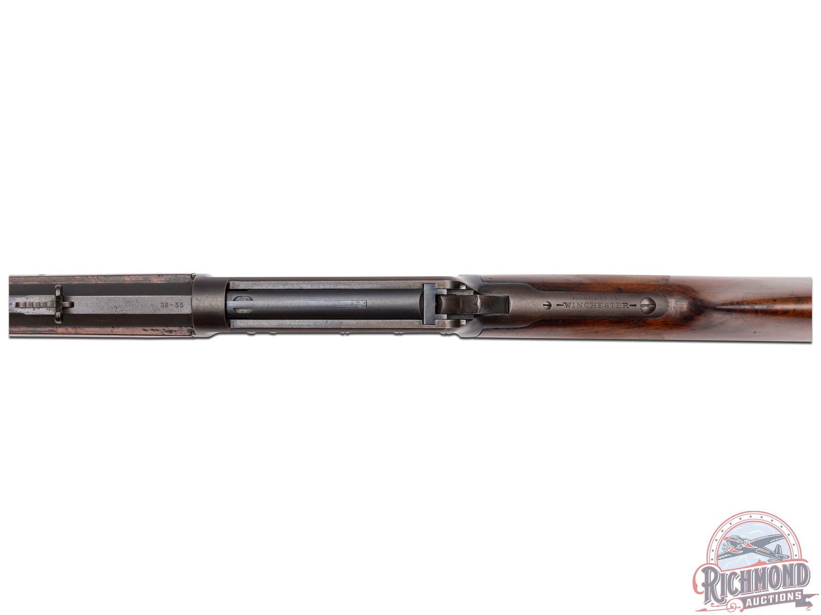 Manufactured in 1894, first year production for the model 1894. This nice rifle features a 26" blued octagon barrel with full length magazine. Period correct rear semi-buckhorn and front nickel blade sight. Period correct barrel stampings. Side loading gate action with case-hardened lever and hammer. Nicely figured walnut straight grip stock and matching forearm with blued forearm. Fitted with a steel crescent butt plate. LOP: 13". CALIBER: 38-55. S/N: 3355. FFL STATUS: Antique.