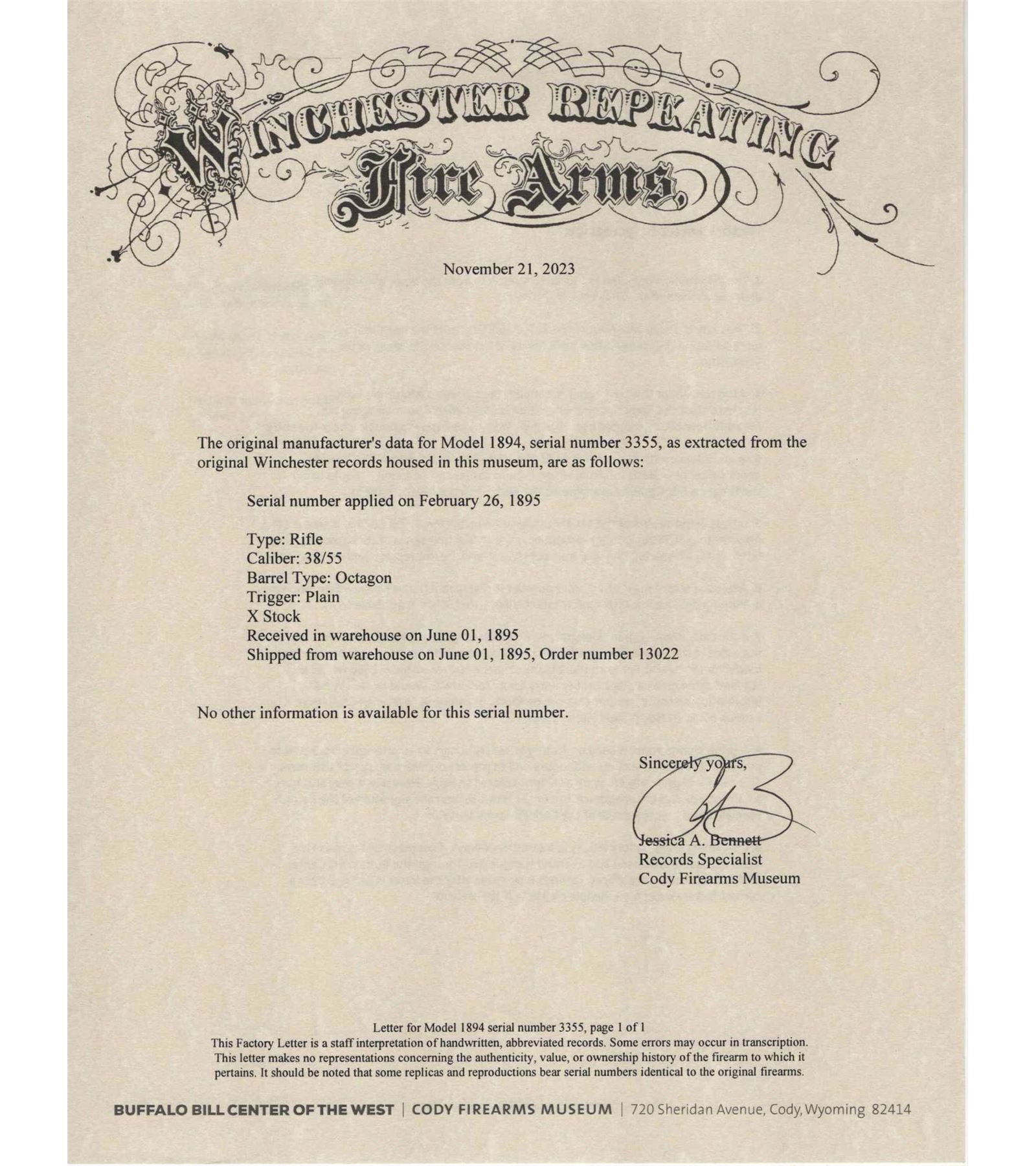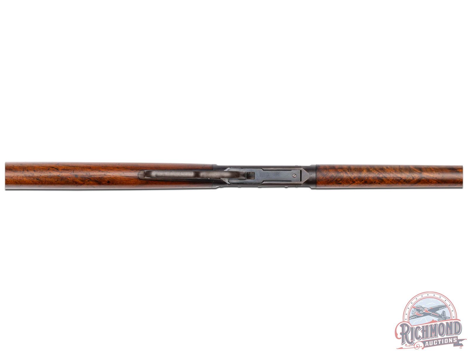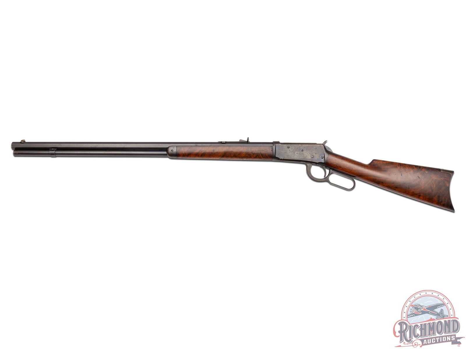 Manufactured in 1894, first year production for the model 1894. This nice rifle features a 26" blued octagon barrel with full length magazine. Period correct rear semi-buckhorn and front nickel blade sight. Period correct barrel stampings. Side loading gate action with case-hardened lever and hammer. Nicely figured walnut straight grip stock and matching forearm with blued forearm. Fitted with a steel crescent butt plate. LOP: 13". CALIBER: 38-55. S/N: 3355. FFL STATUS: Antique.