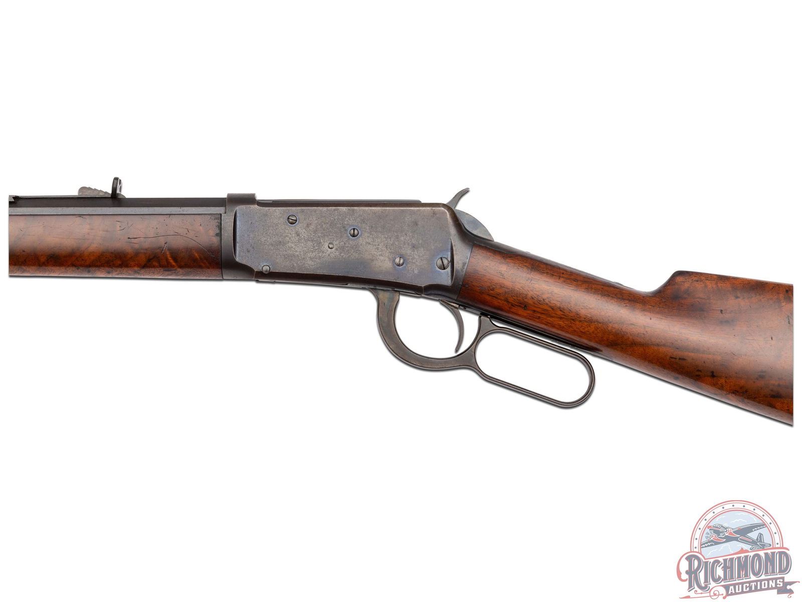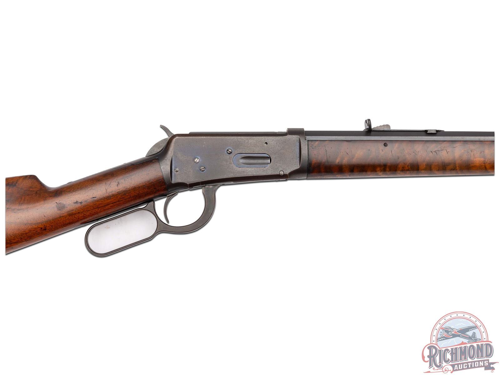 Retains 80% condition with some areas turning a brown patina. Case hardening still visible on lever and hammer. Stock shows several "clamp" marks near the top edge likely from a rack. Forearm has a 1 scribed on the left side and shows other light dings. Nice bore and great mechanics.