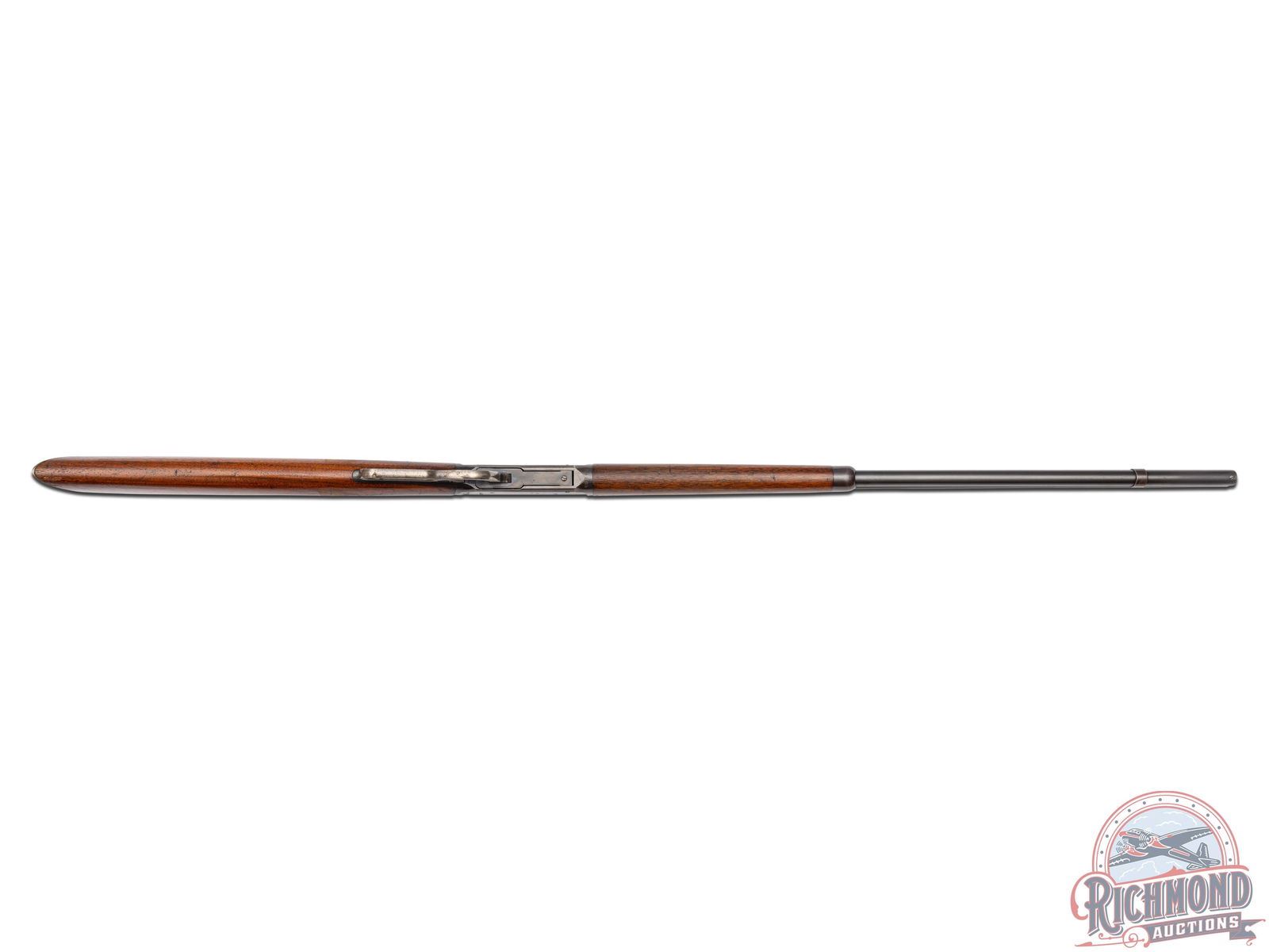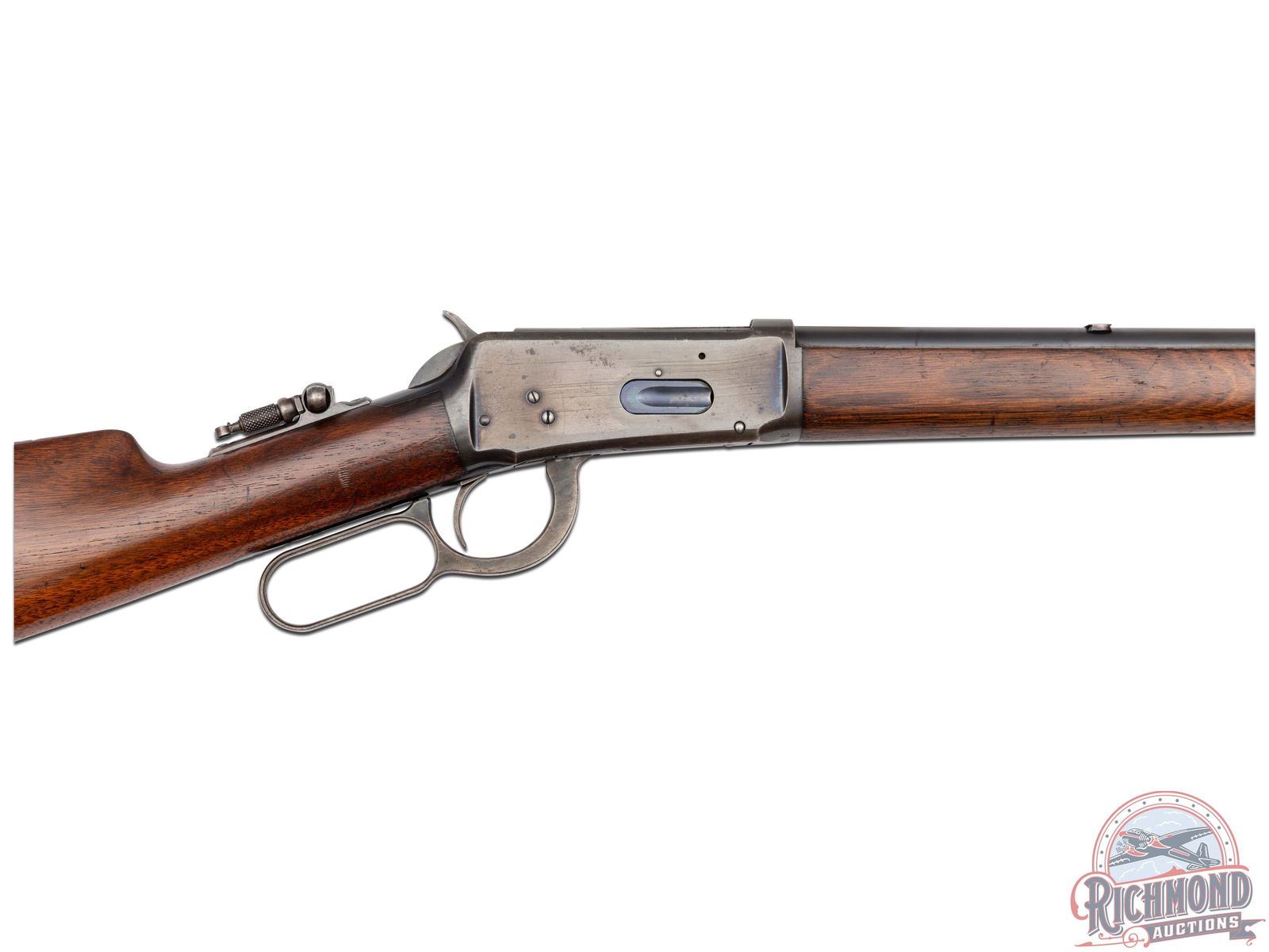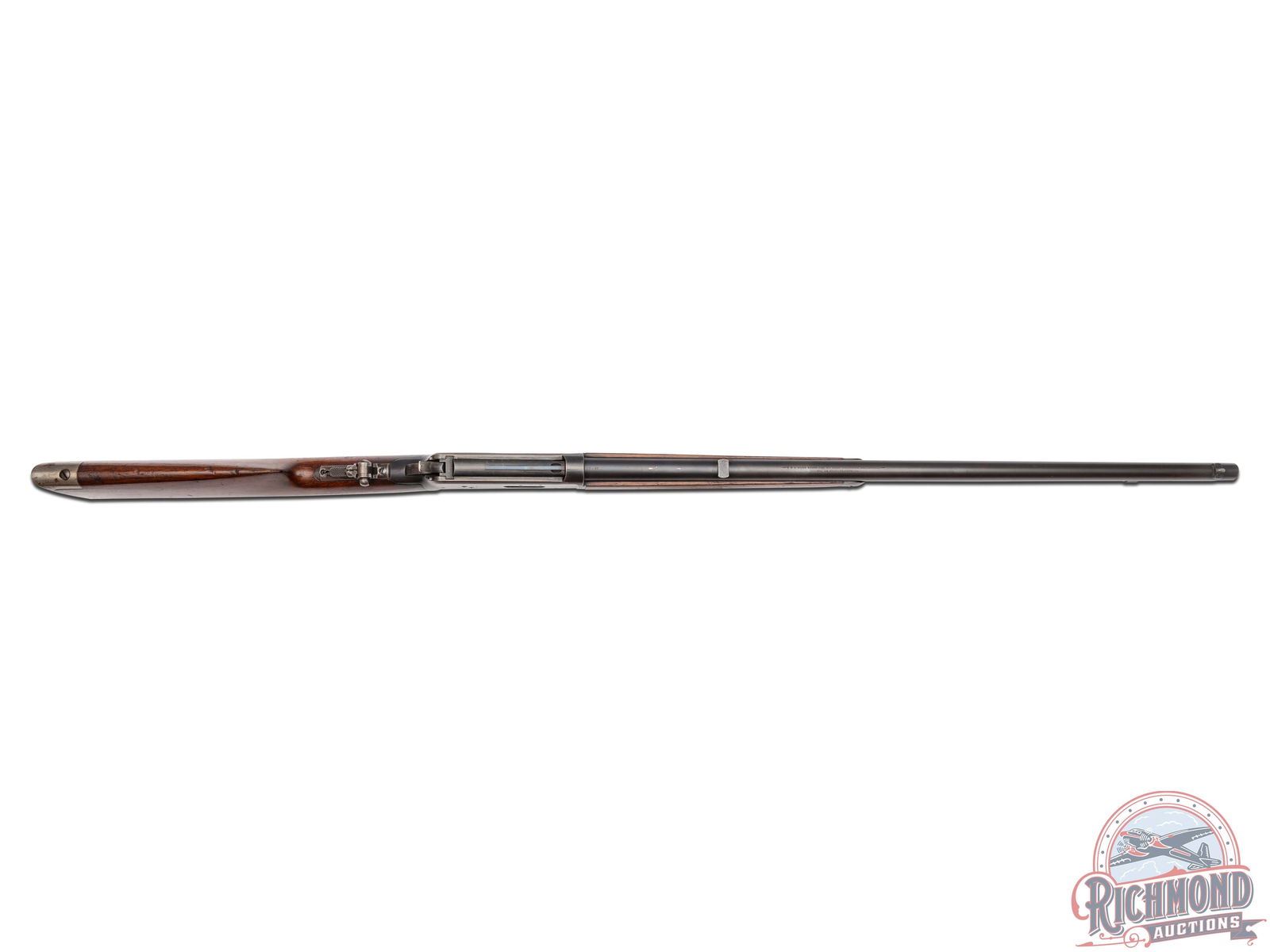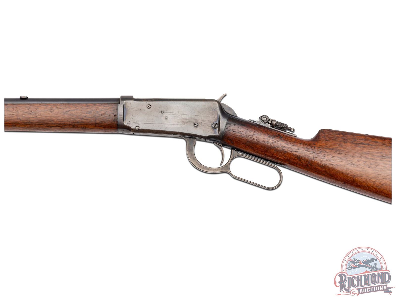Manufactured in 1907. This nice model 1894 features a 26" blued round barrel with full length magazine. Lyman tang mounted adjustable peep sight, rear plate for sight only and nickel front blade sight. Period correct barrel stampings with Winchester proof marks. Walnut straight grip stock and matching forearm with blued endcap. Fitted with a steel crescent butt plate. LOP: 13". CALIBER: 38-55. S/N: 39205. FFL STATUS: Curio & Relic.