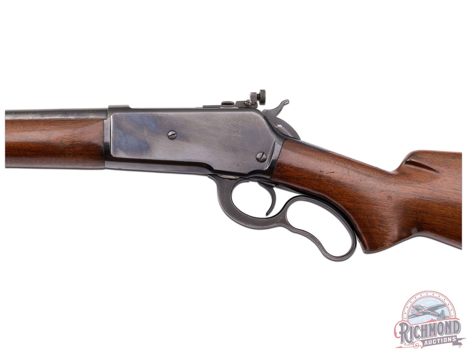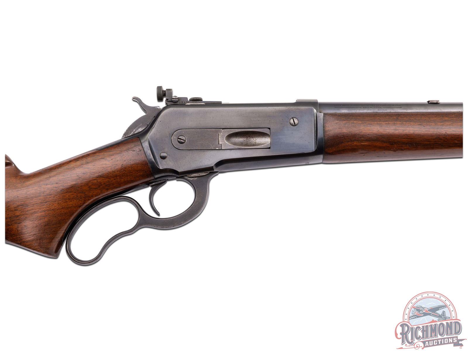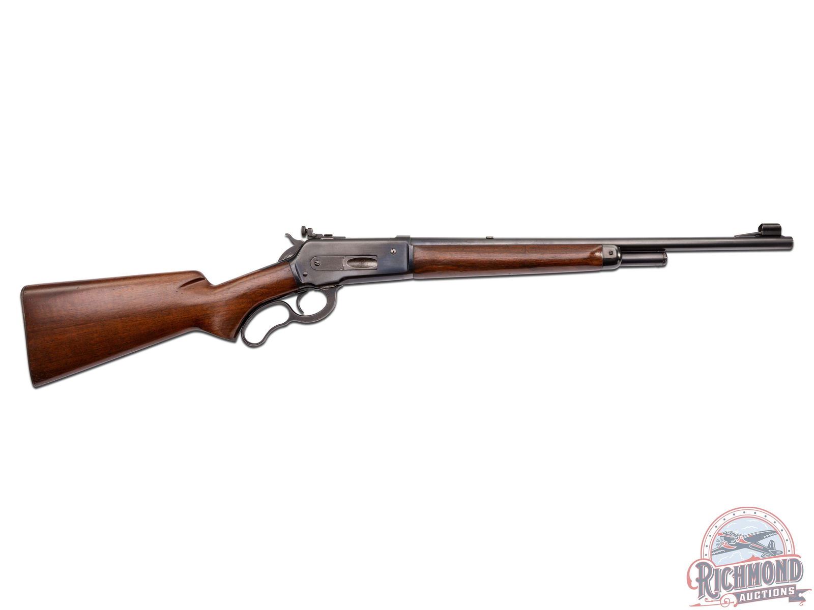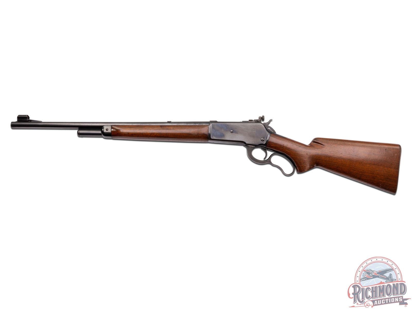 Manufactured in 1936 with all clear and standard Winchester roll marks and proof marks. Features a carbine 20" blued barrel hooded ramp blade front sight with brass bead and bolt mounted rear adjustable peep sight. Blued receiver with side loading gate. Smooth walnut long tang stock with pistol grip. Fitted with a factory checkered metal butt plate. LOP: 13-1/4". CALIBER: 348 WCF. S/N: 6343. FFL STATUS: Curio & Relic.