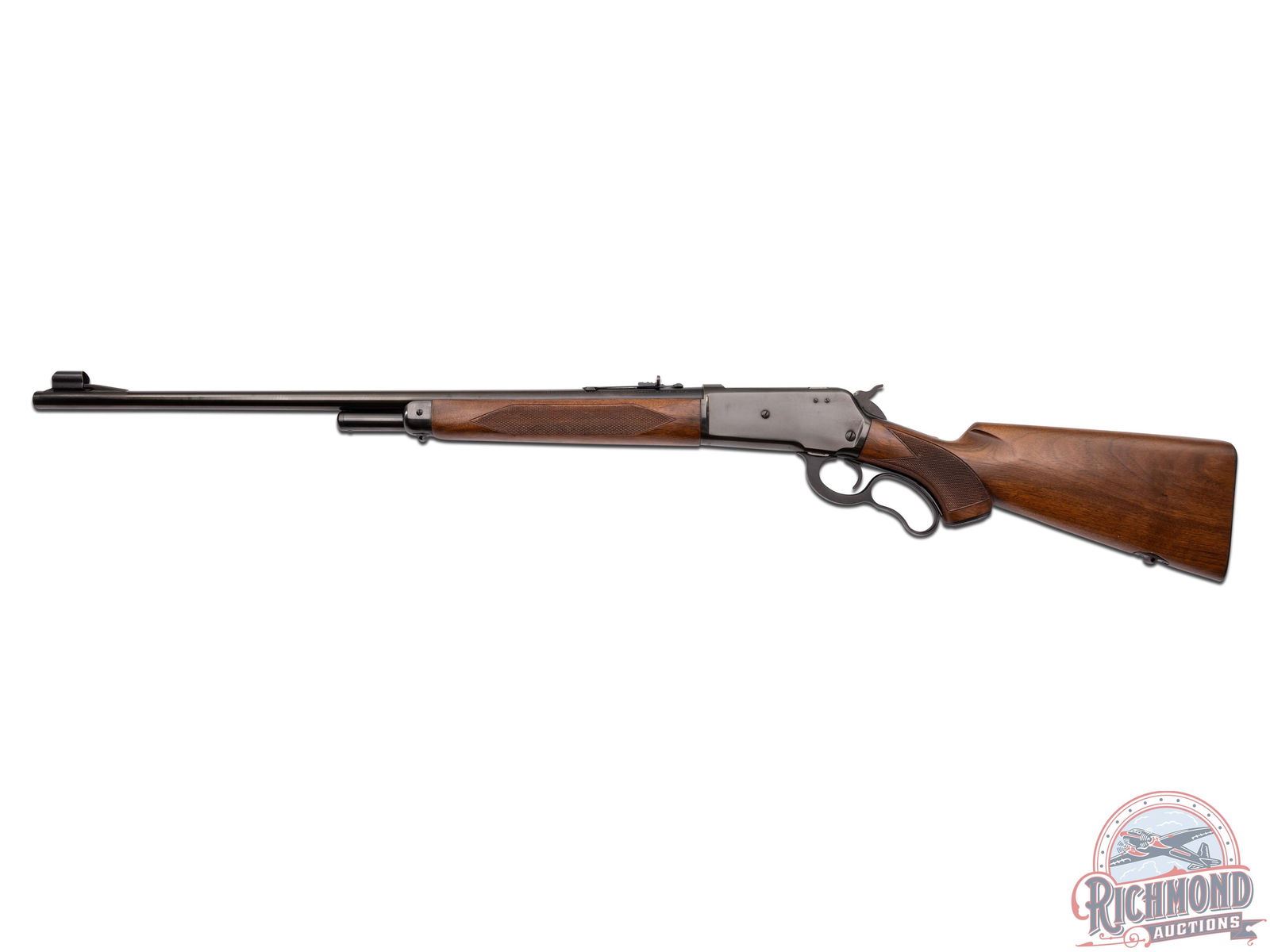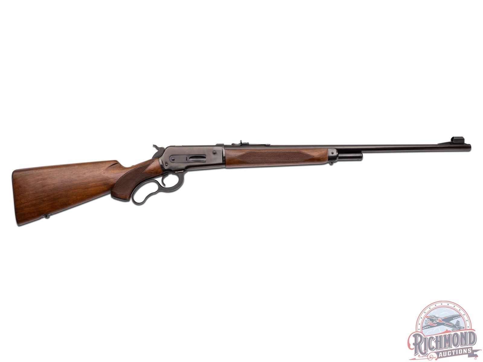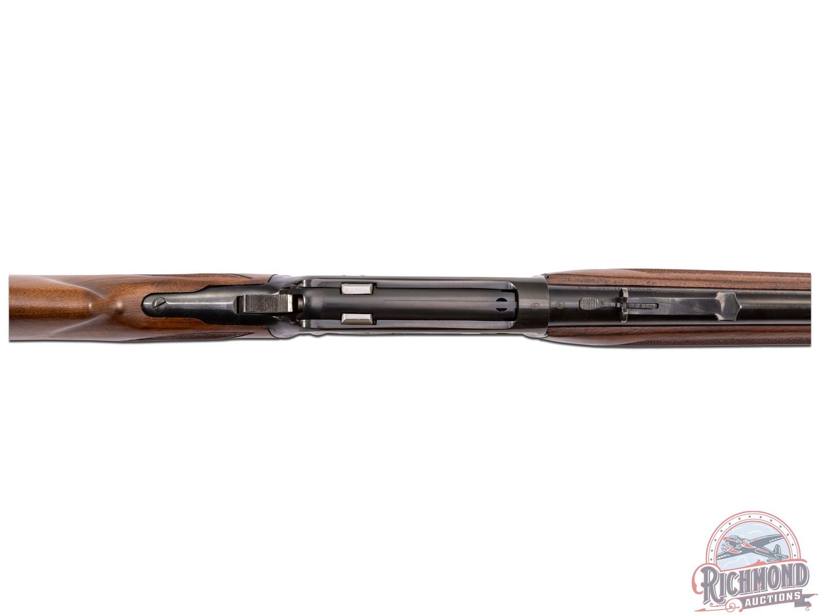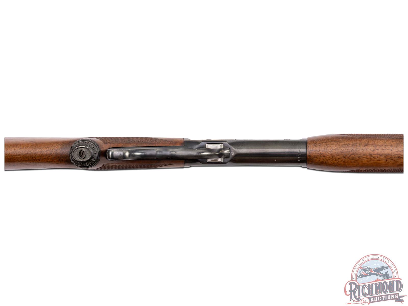 Manufactured in 1957 with clear standard Winchester roll marks and proof marks. Features a 24" blued barrel with hooded ramp blade front sight and rear adjustable buckhorn sight. Blued receiver with side loading gate. Deluxe walnut short tang stock with pistol grip and hand-checkering 18 LPI. Includes factory swivel mounts on the forearm tip and under the stock. Pistol grip is fitted with a factory metal pistol grip cap and metal checkered butt plate. Comes in the original factory box with original sling swivels, factory hanging tag and safety brochure. LOP: 13-1/4". CALIBER: 348 WCF. S/N: 46873. FFL STATUS: Curio & Relic.