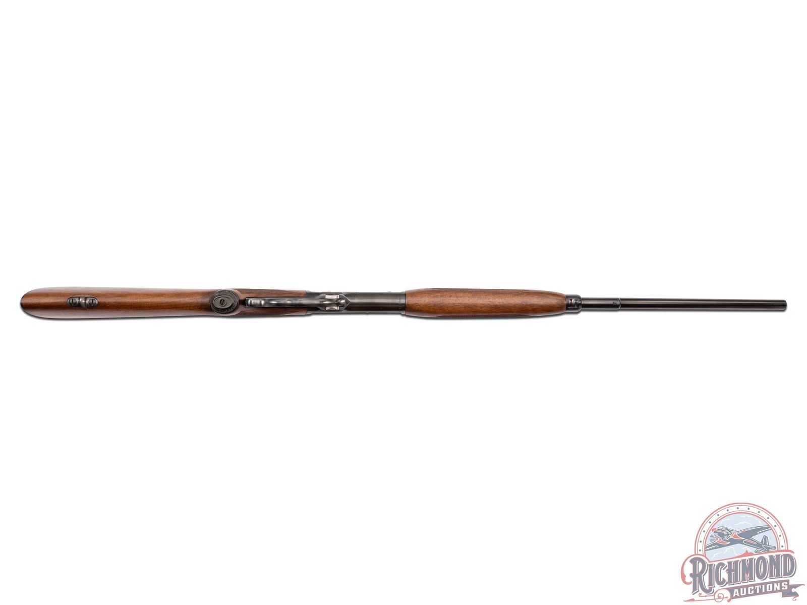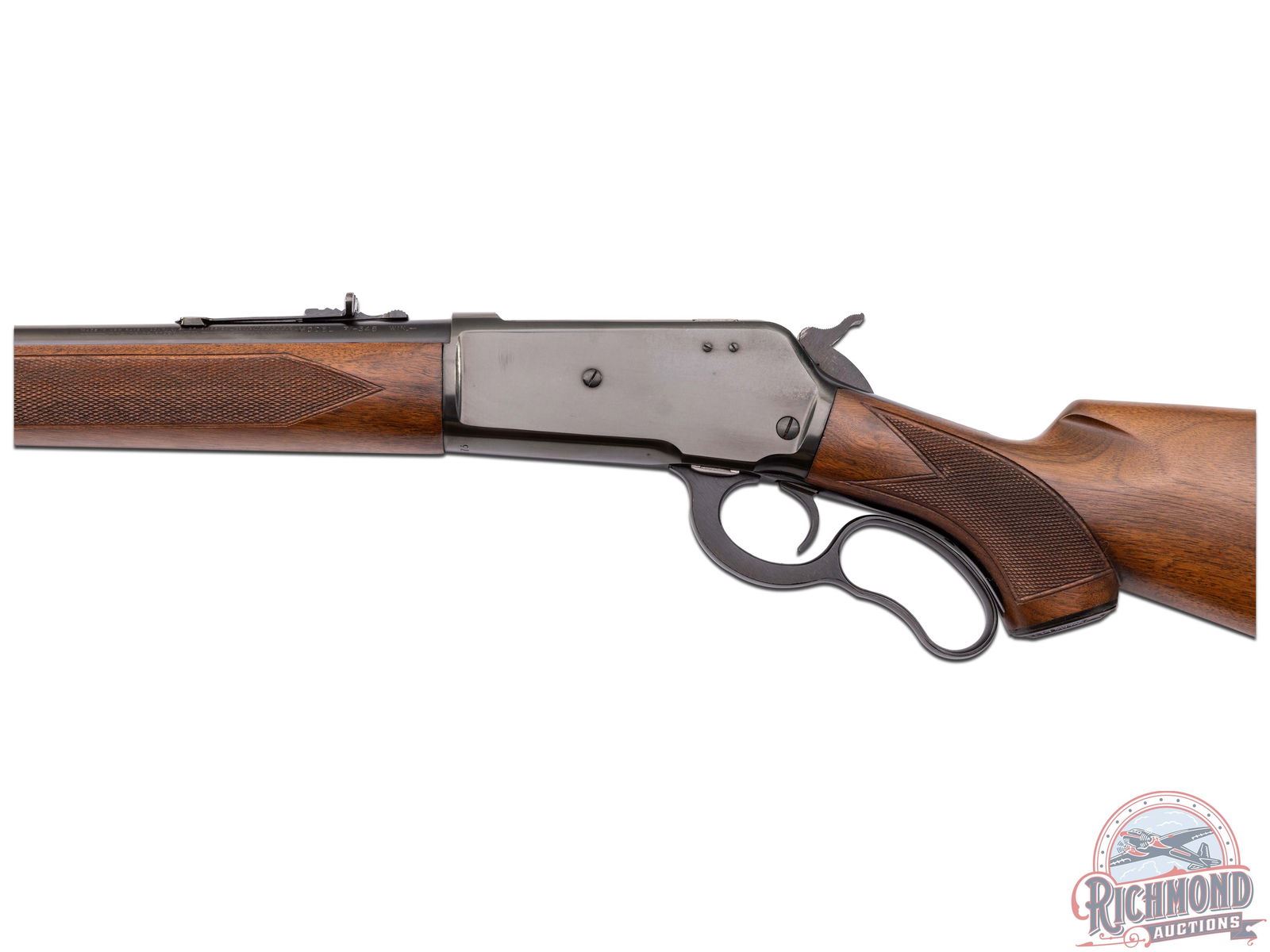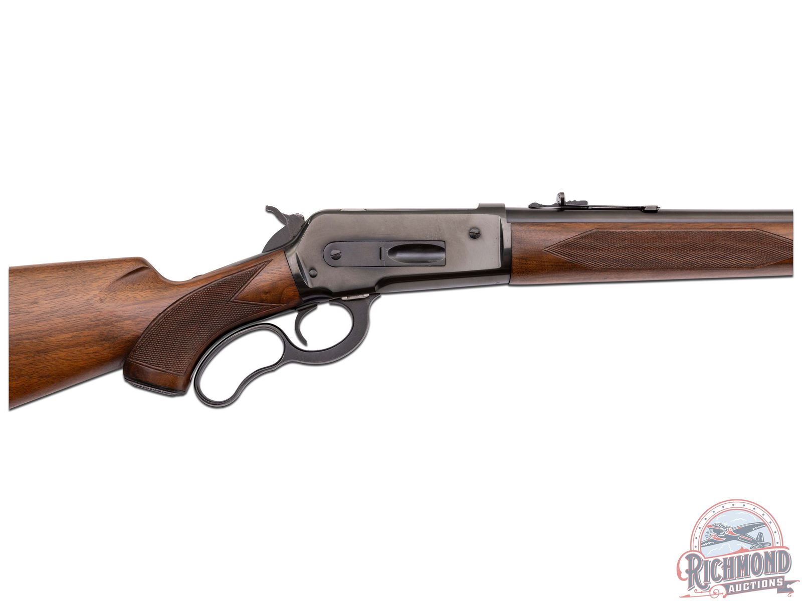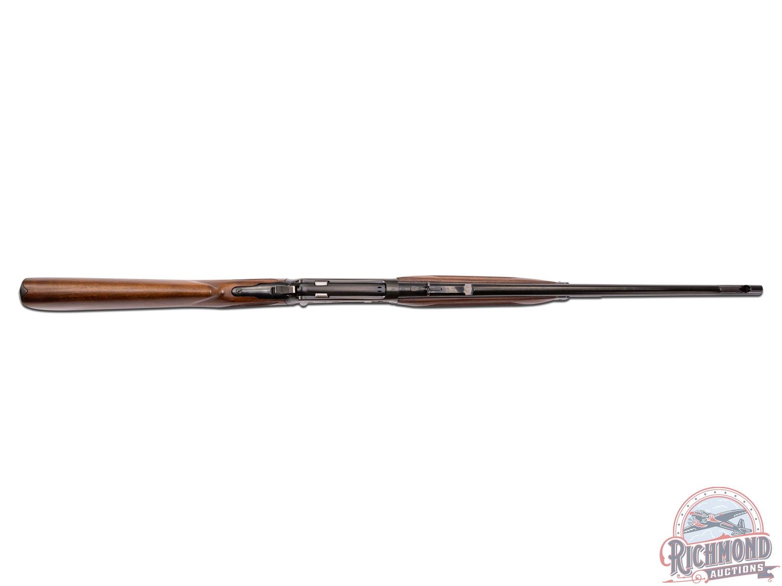 Manufactured in 1957 with clear standard Winchester roll marks and proof marks. Features a 24" blued barrel with hooded ramp blade front sight and rear adjustable buckhorn sight. Blued receiver with side loading gate. Deluxe walnut short tang stock with pistol grip and hand-checkering 18 LPI. Includes factory swivel mounts on the forearm tip and under the stock. Pistol grip is fitted with a factory metal pistol grip cap and metal checkered butt plate. Comes in the original factory box with original sling swivels, factory hanging tag and safety brochure. LOP: 13-1/4". CALIBER: 348 WCF. S/N: 46873. FFL STATUS: Curio & Relic.