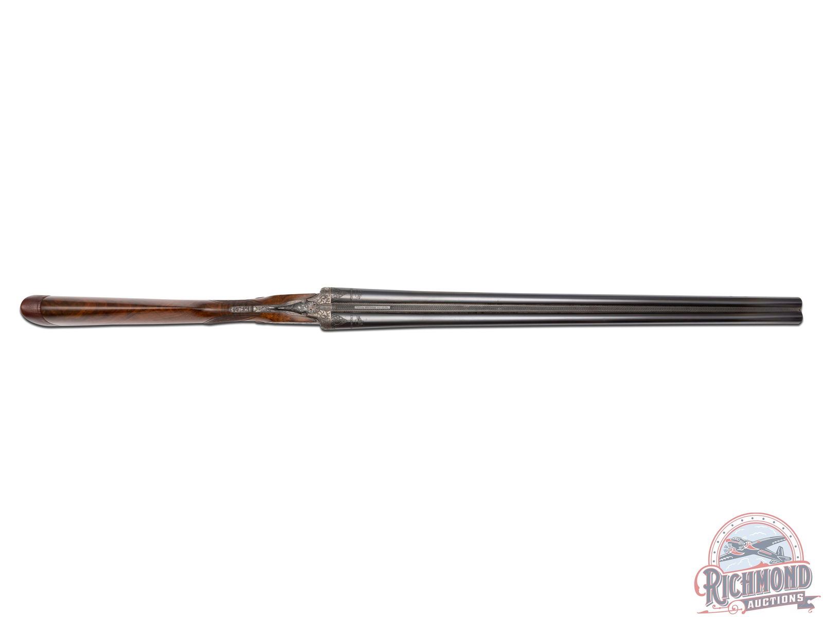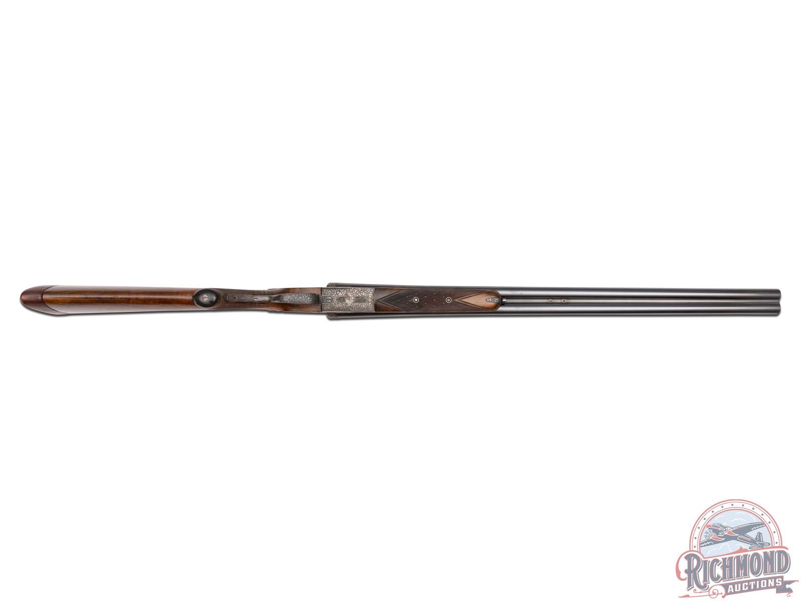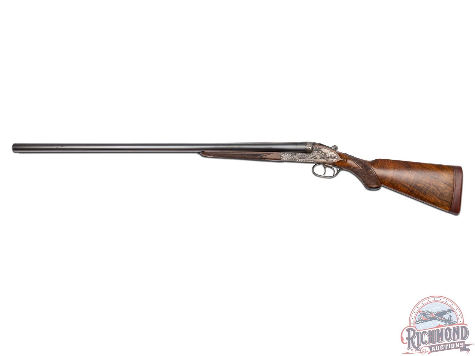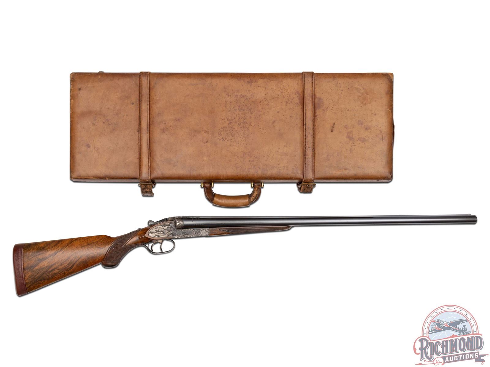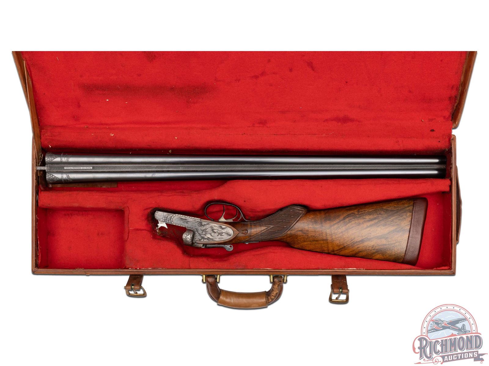 90% original barrel blue with missing sling swivel stud. Small areas of pitting with usage marks. 80% fading action finish with sharp engraving. Wood has been cleaned with small handling marks. Good bores and crisp mechanics. Case is in good condition. Stock has plugged sling swivel hole in toe.