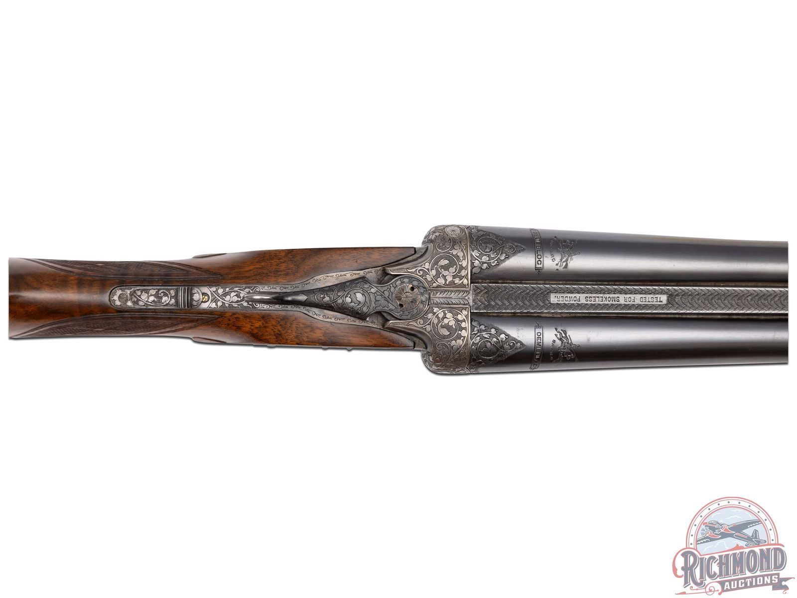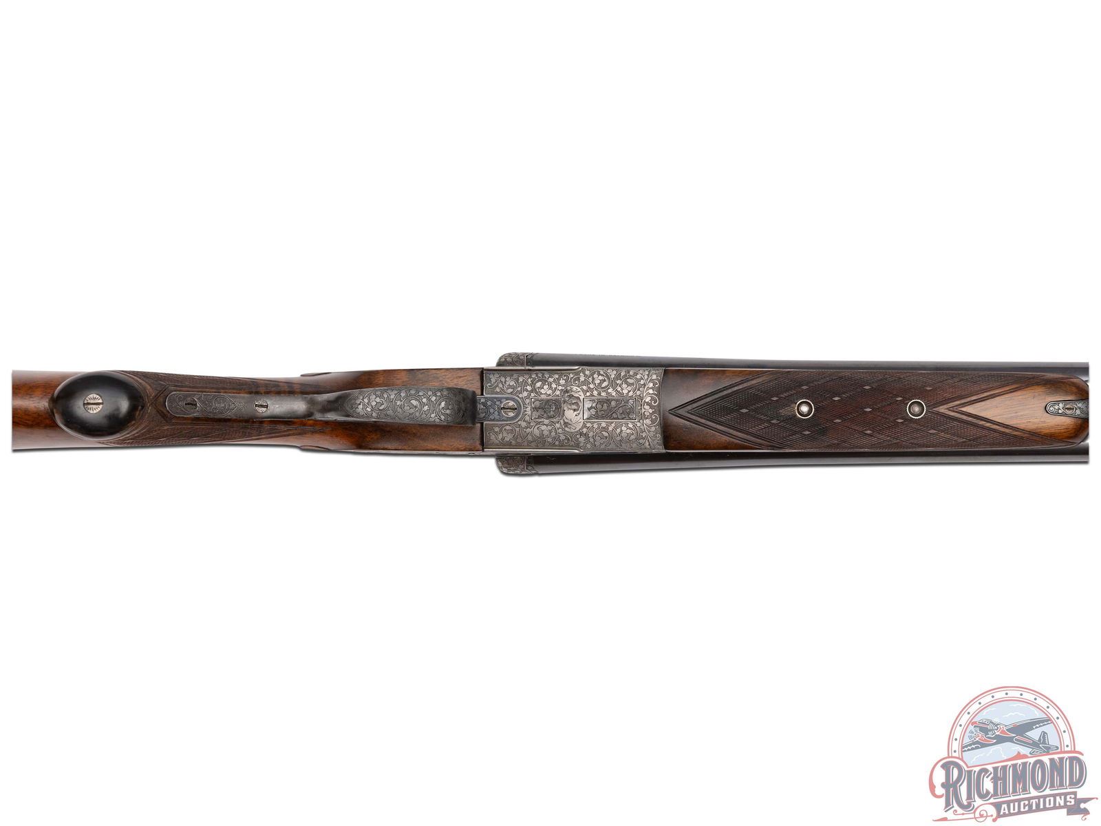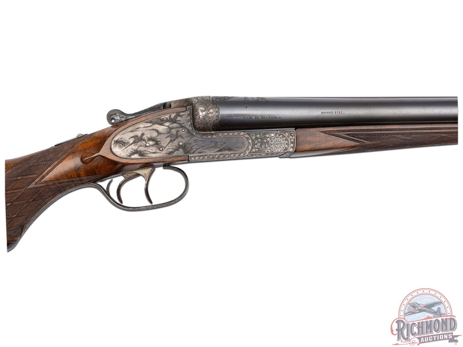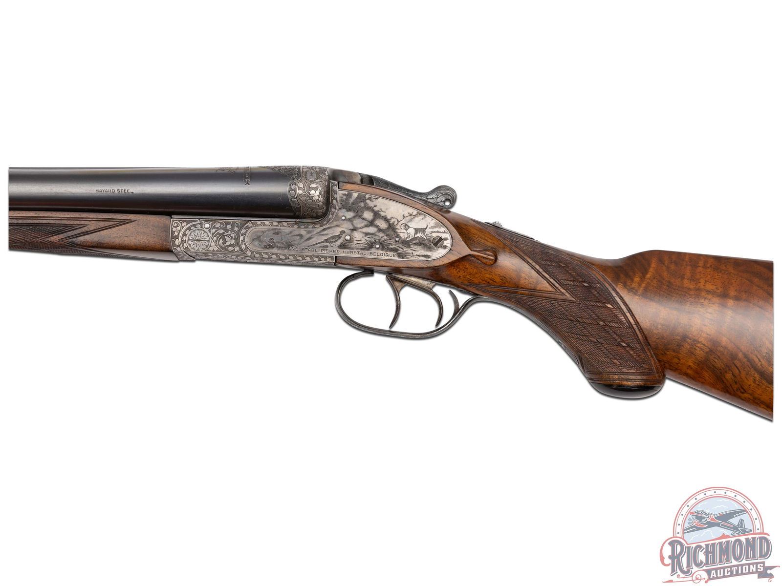 Made in Herstal, Belgium, circa 1920 by Bayard. 27-1/2" Demi-Bloc blued Bayard steel barrels with ejectors, bead front sight, and matted rib marked "Tested for Smokeless Powder". Barrels are 12 gauge with full and modified chokes and 2-3/4" chambers. Barrel breeches are chisel engraved with sideclips. Case-hardened full sidelock with full coverage engraved action with pheasant and dog scene on left and flying pheasant scene on right. Action is marked on left "ANC. ETABL. PIEPER HERSTAL BELCIQUE". Action has Greener style crossbolt with automatic safety, pierced opening lever, and double triggers. Circassian walnut pistol grip stock with skip-line checkering and leather covered recoil pad. Gun has matching walnut skip-line checkered splinter forearm with push button release. Comes with Bayard information and trunk case. Highest grade available at the time. LOP: 14". DAC: 1-1/2". DAH: 2". CALIBER: 12 GA. S/N: 35219. FFL STATUS: Curio & Relic.