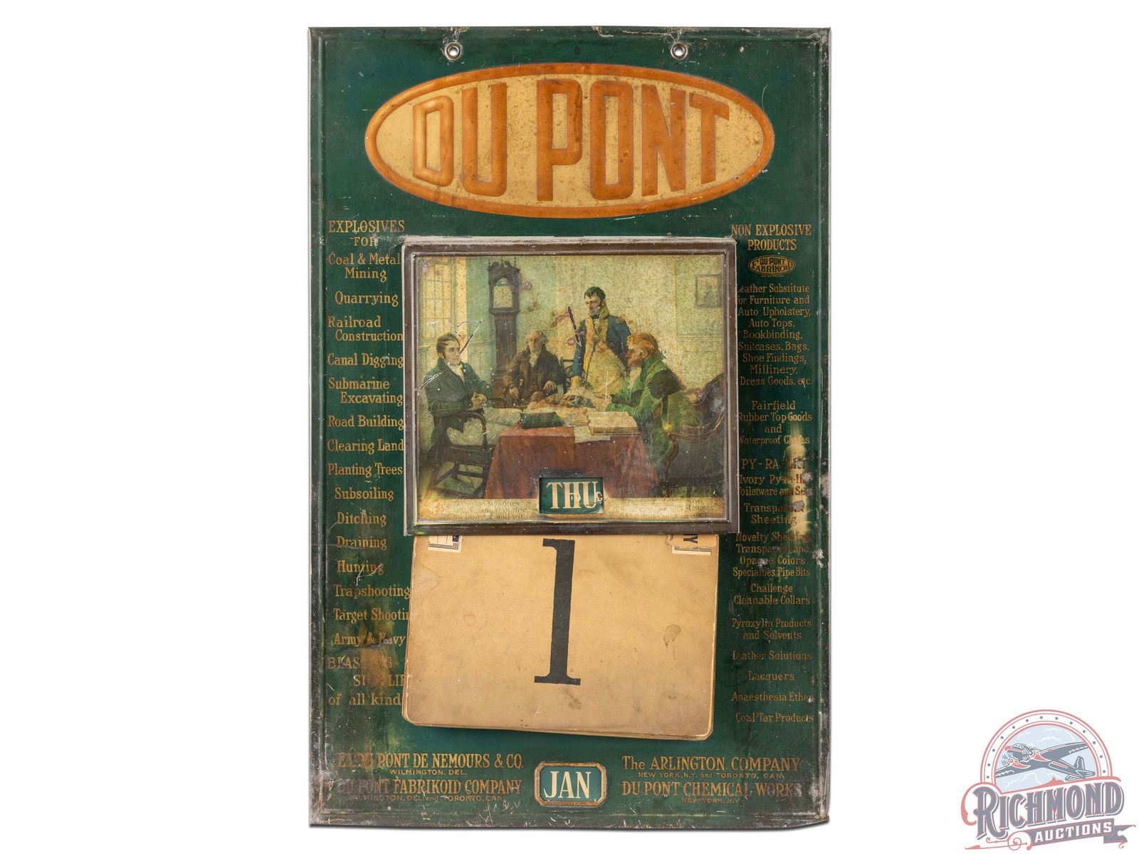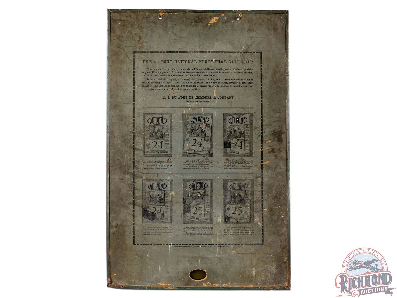 Single sided tin adjustable metal calendar with rotating day of week, rotating month, and daily calendar page. Calendar pages appears complete and include single, yearly calendar pages in the back from 1917 through 1926. Day of week and month spinners turn freely. The metal frame has great patina and exhibits general wear, scratches, and oxidation as shown. E.I. DuPont De Nemours & Company Explosive and Non-Explosives uses are listed on the front. Instructions and visuals are listed on the reverse. 29" H x 18.75" W.