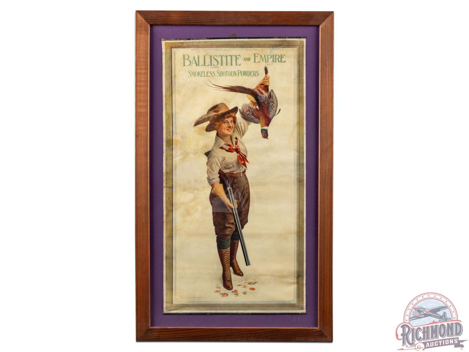 Framed paper poster featuring a female hunter holding her side-by-side shotgun and ringneck pheasant with fallen leaves at her feet. Excellent graphics and imagery. The poster has large areas of restoration/touch-ups with creasing, tears with loss and discoloration throughout. Includes top and bottom bands with modern frame. The poster's actual measurements are 26.75" H x 13.5" W. Marked Copyright 1910 By Nobel's Explosive Co. Ltd. 31.75" H x 19" W.