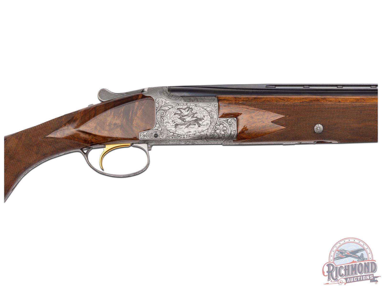 Made in 1959, this 20 gauge shotgun features 26-1/2" barrels with narrow ventilated rib with double beads. The top barrel is choked improved cylinder and bottom barrel is choked modified. Barrels are marked 2-3/4" and 3". Both barrels are equipped with automatic ejectors. The coin finished action is fully engraved by master engraver, Felix Funken, featuring floral designs and game scenes in deep relief. The left side of the receiver shows five pheasants in a woodland setting; the right side features four ducks in a woodland pond. The underside shows a pair of grouse in flight and a hare engraved on the trigger guard. Both the right and left sides of the receiver are signed Felix Funken. Double signed receivers are exceptionally rare. Receiver features a gold-plated single selective trigger and non-automatic safety. Forearm and butt stock feature 3X walnut; both with fine factory checkering with 22 lines per inch. The semi pistol grip butt stock has a round knob long tang. butt stock is finished with factory Browning hard black plastic butt plate. The shotgun is housed in a factory Browning hard case with owner's manual, instruction booklet, and envelope with keys to the case. LOP: 14-1/2". DAC: 1". DAH: 2". CALIBER: 20 GA. S/N: 14582. FFL STATUS: Curio & Relic.