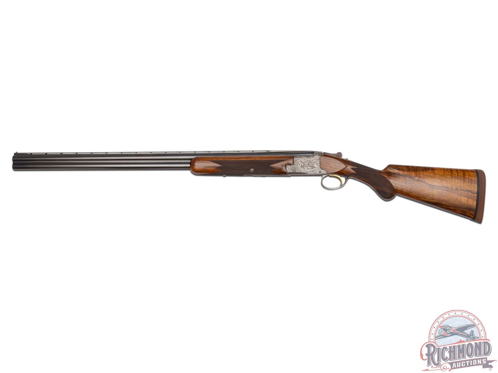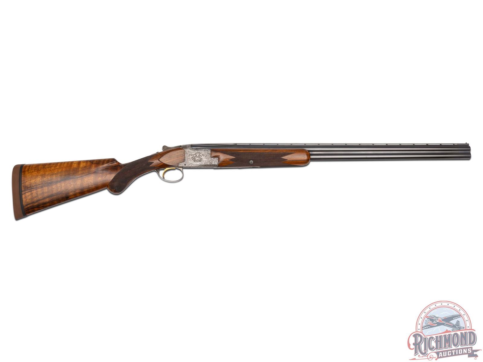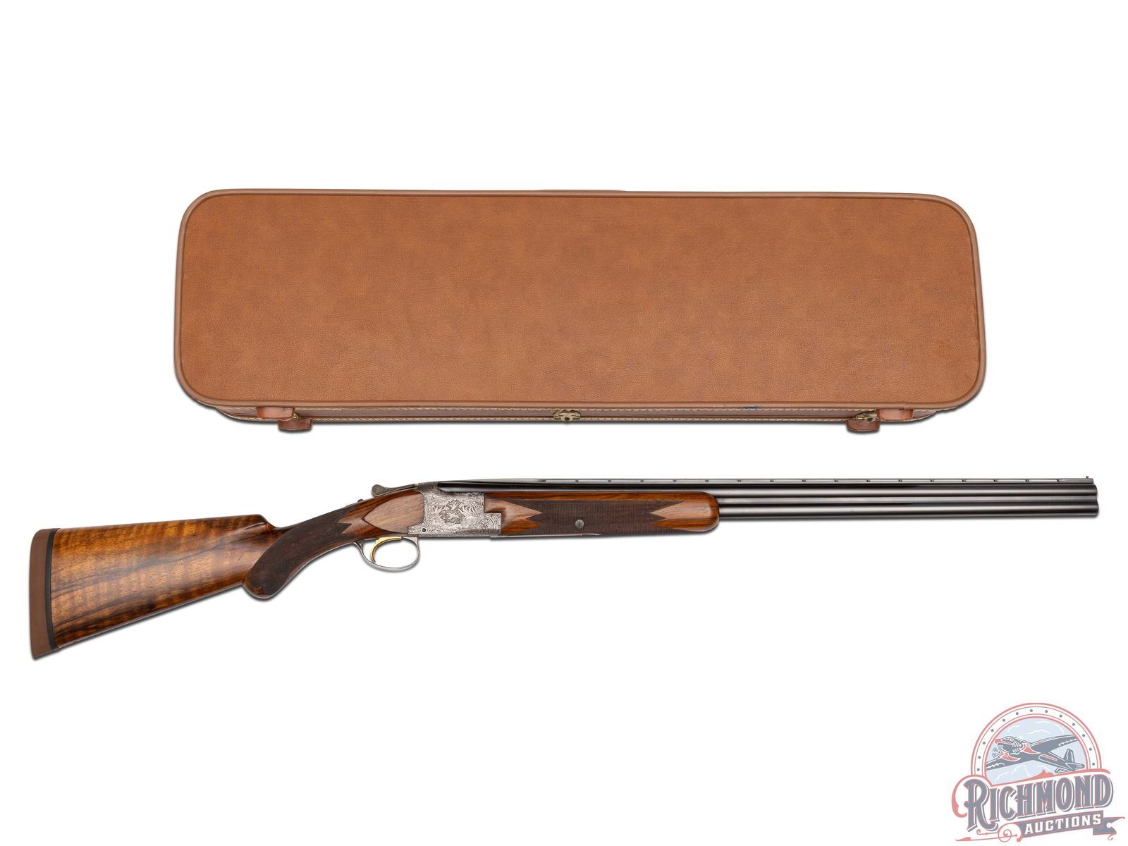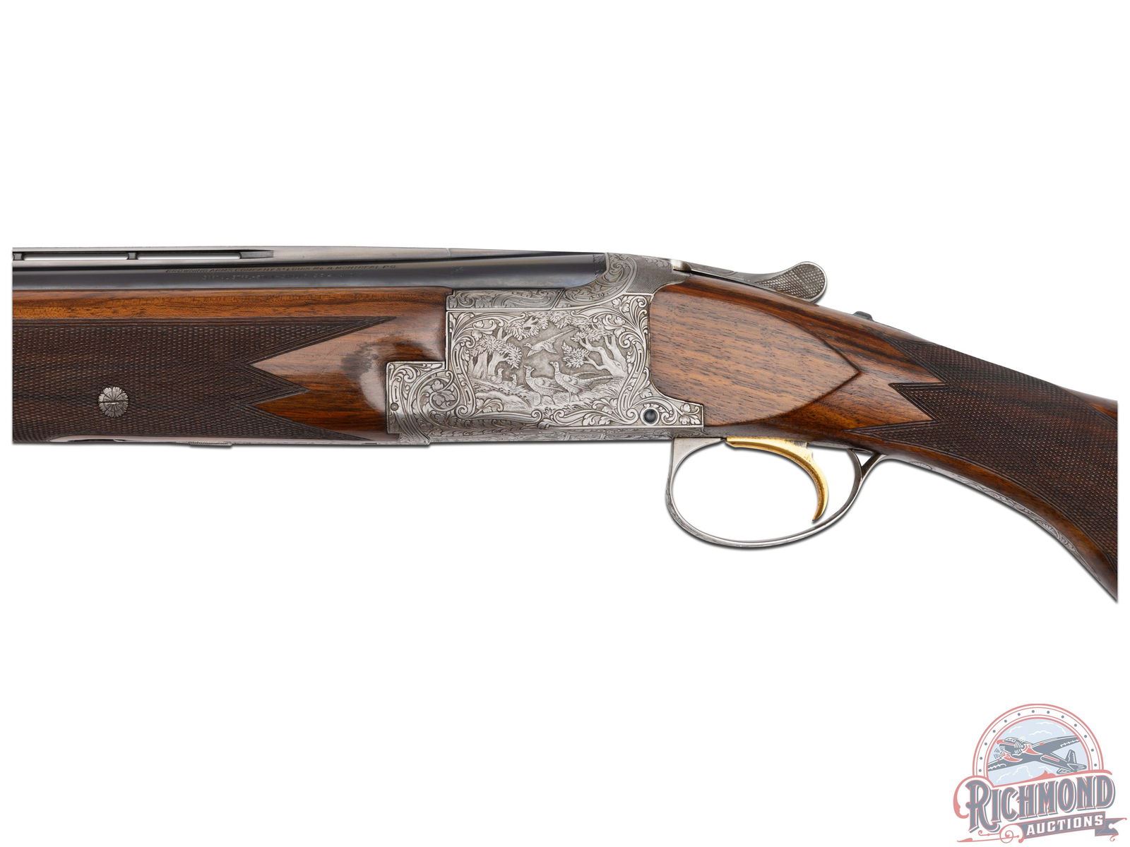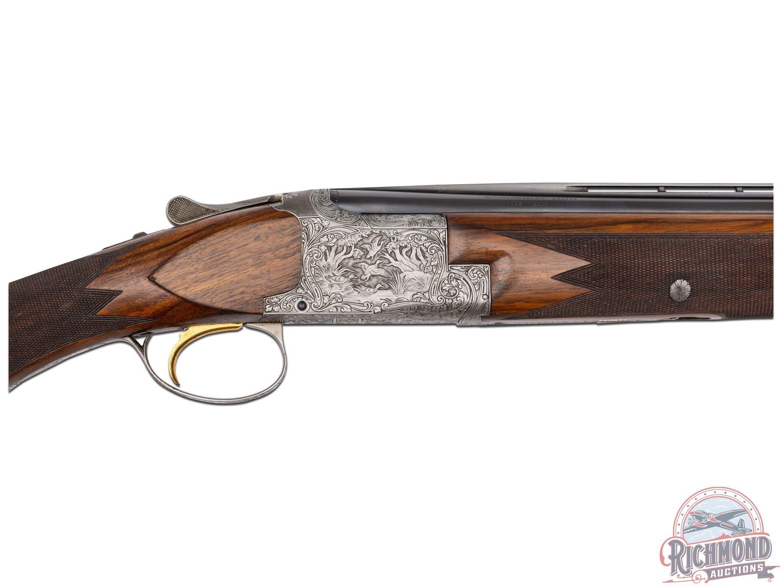 Made in Herstal, Belgium by Browning in 1960. Very fine gun engraved and double signed by Peter Marachal. 28" blued Special Steel barrels in 20 gauge with ventilated rib, bead sight, 3" chambers, ejectors, and Modified and Improved cylinder chokes. Barrels marked with Browning Patents and St. Louis and Montreal addresses. Satin finished action with gold washed single trigger and top tang barrel selector. Action is chisel engraved with "Diana" grade floral and pheasant scene on left and duck scene on right with bottom having birds in flight with both action panels signed "P. Marachal". Walnut checkered round knob long tang pistol grip stock with added Pachmayr Dee-Celerator pad. Matching walnut checkered sporting attached forearm with latch release. Comes in tan Browning luggage case. LOP: 14-1/8". DAC: 1-1/2". DAH: 2-1/4". CALIBER: 20 GA. S/N: 20033. FFL STATUS: Curio & Relic.
