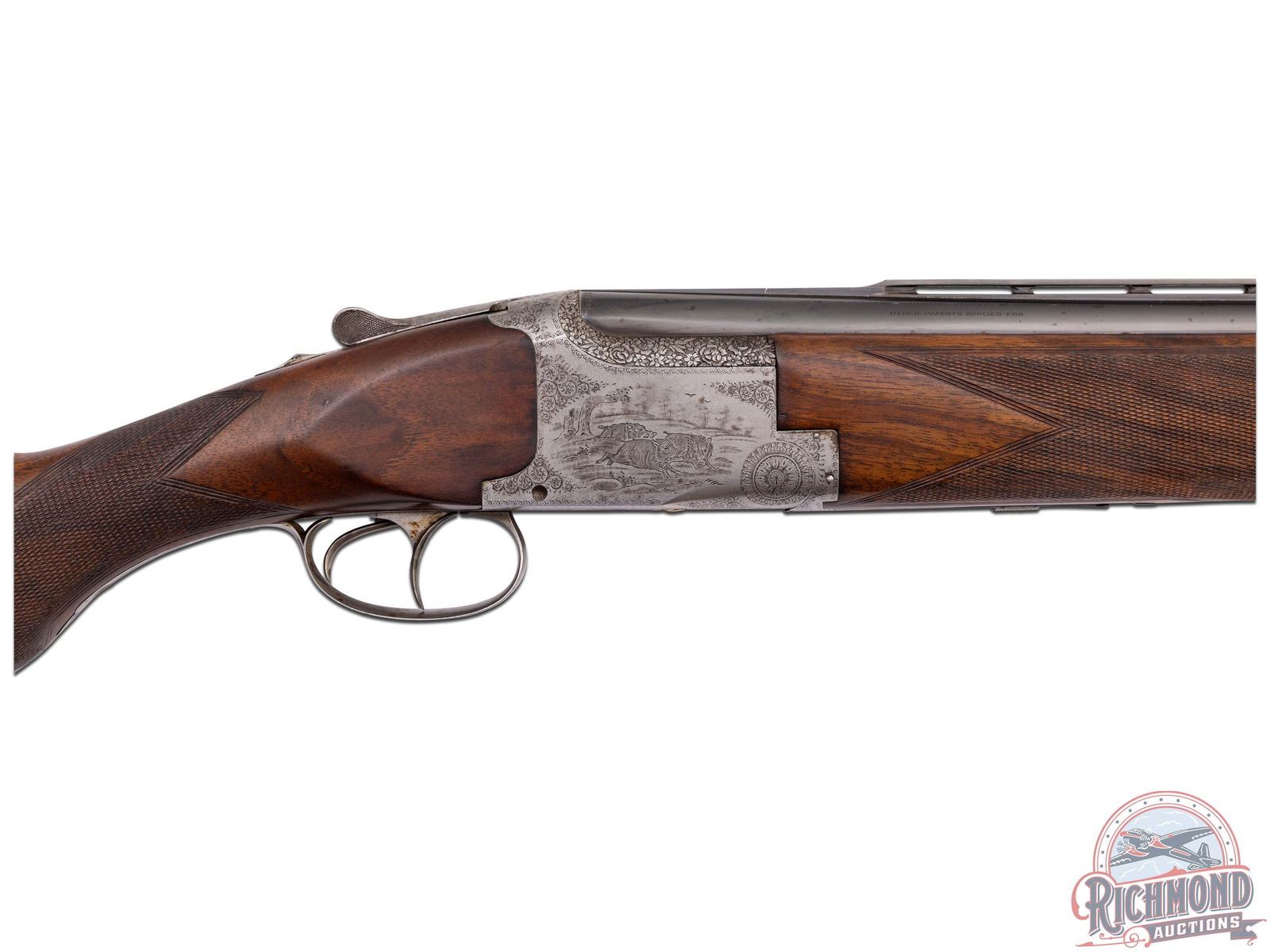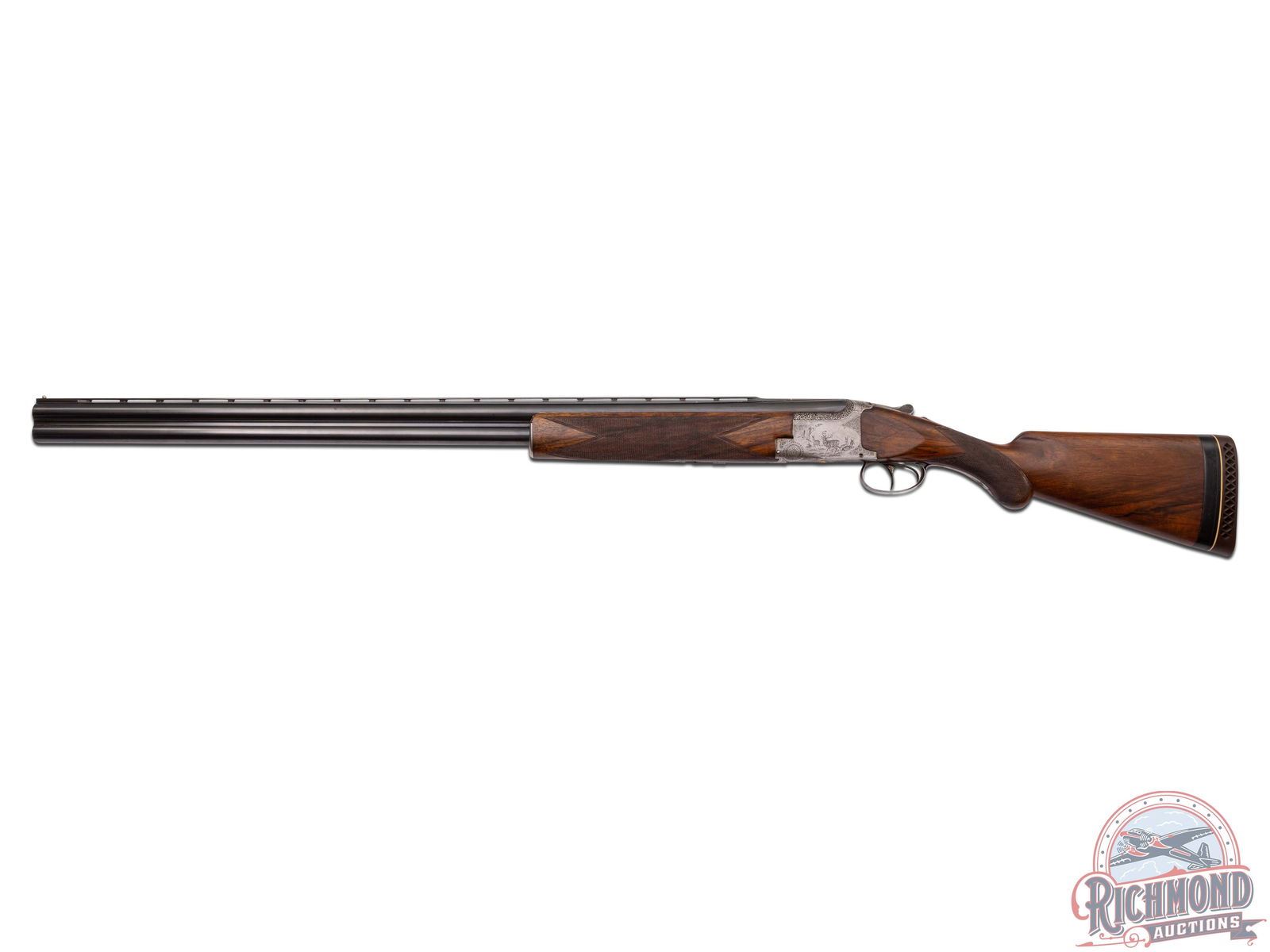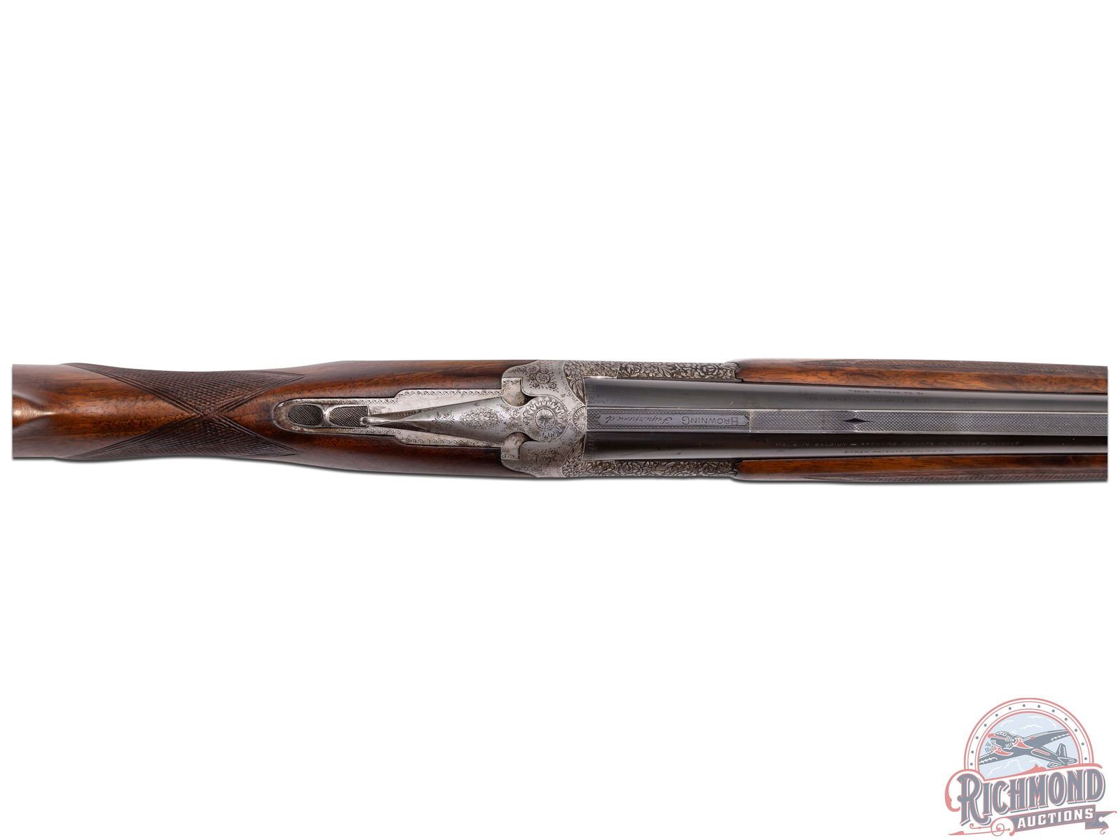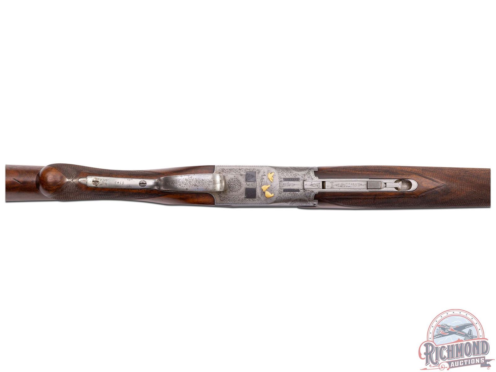 Made in Belgium by Browning in 1933. These Pre-World II guns are hard to find, especially in high grades. 32" blued Special Steel 12 gauge barrels with stepped ventilated rib ejectors with 2-3/4" chambers and full and full chokes. Rib is fitted with bead front sight and bead mid sight with barrel marked with Gauge and Browning, St. Louis, Missouri address and Browning Patents. Satin finish boxlock action with double triggers and non-automatic safety with "S" in gold. Action is engraved with standard Diana or C-2 Grade boar scene on right and hirsch on left. Bottom is vignette engraved with three gold quail. This is considered a factory special order as gold is not listed as an option. Breeches have the usual chiseled floral pattern. Walnut checkered round knob, pistol grip, long tang stock, with added spacer and Pachmayr pad. Matching walnut checkered latch release attached forearm with horseshoe plate. LOP: 14". DAC: 1-1/2". DAH: 1-3/4". CALIBER: 12 GA. S/N: 5149. FFL STATUS: Curio & Relic.