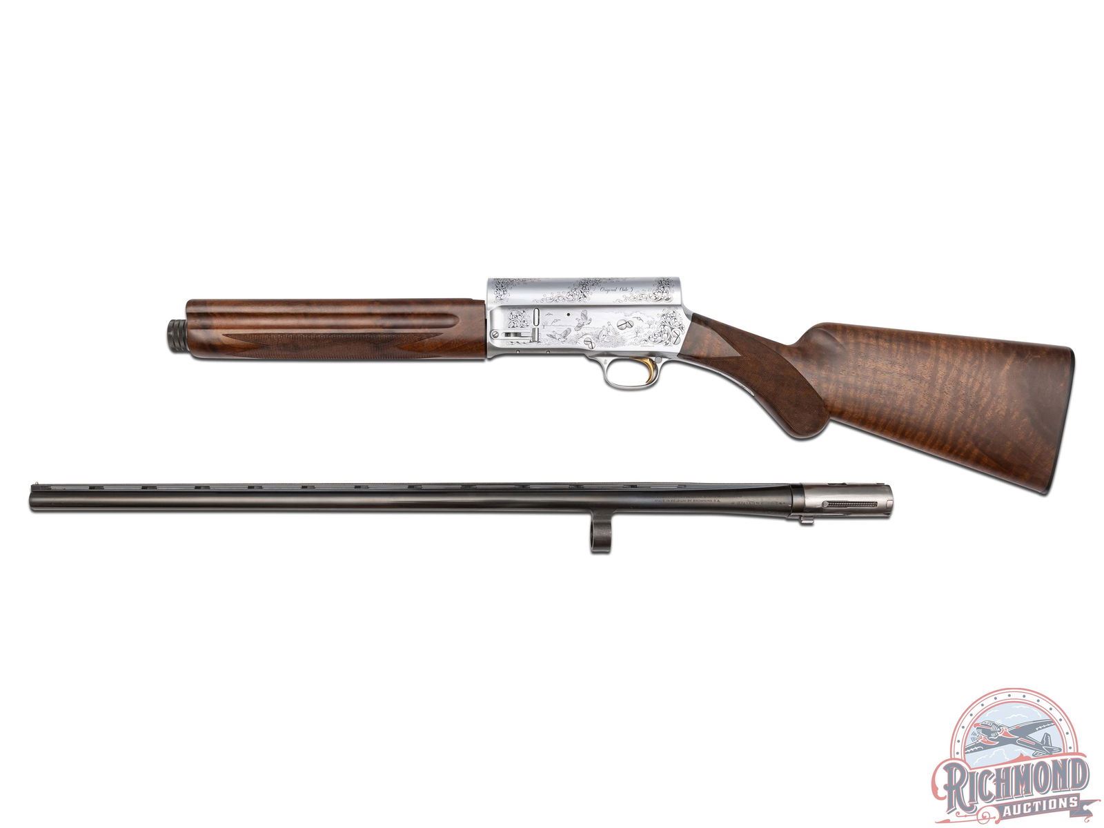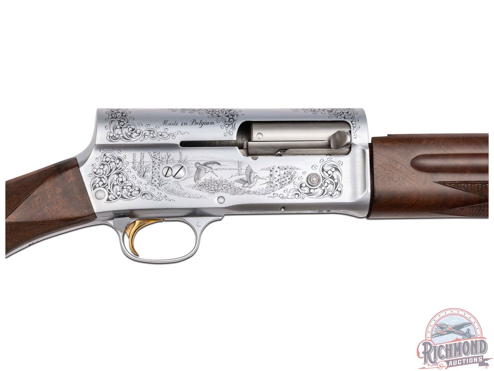 Manufactured in Belgium FN Custom Shop for Browning. Features a 28" blued ventilated rib barrel chambered for 3" shells with Cylinder choke and nickel bead front sight. Coin finished receiver with Browning Custom Shop engraving. Top of the receiver features floral scroll designs with the left stamped "ORIGINAL AUTO 5" and right "MADE IN BELGIUM". Left side features several grouse in a field scene with floral scroll design on each side and signed by engraver at the bottom "ROMAINVILLE B.". Right side features two woodcocks in flight in a woodland scene with floral scroll design on each side. Crossbolt safety and gold washed trigger. Grade IV walnut round knob, long tang stock with checkered pistol grip and matching skeet style forearm with checkering. Fitted with a factory butt plate. Comes in a nice Emmebi burgundy velvet lined leather Browning Custom Shop take-down case with factory paperwork and cable lock. Includes original Browning box as well. LOP: 14". DAC: 1-1/2". DAH: 2-1/4". CALIBER: 20 GA. S/N: 161CS01745. FFL STATUS: Modern.