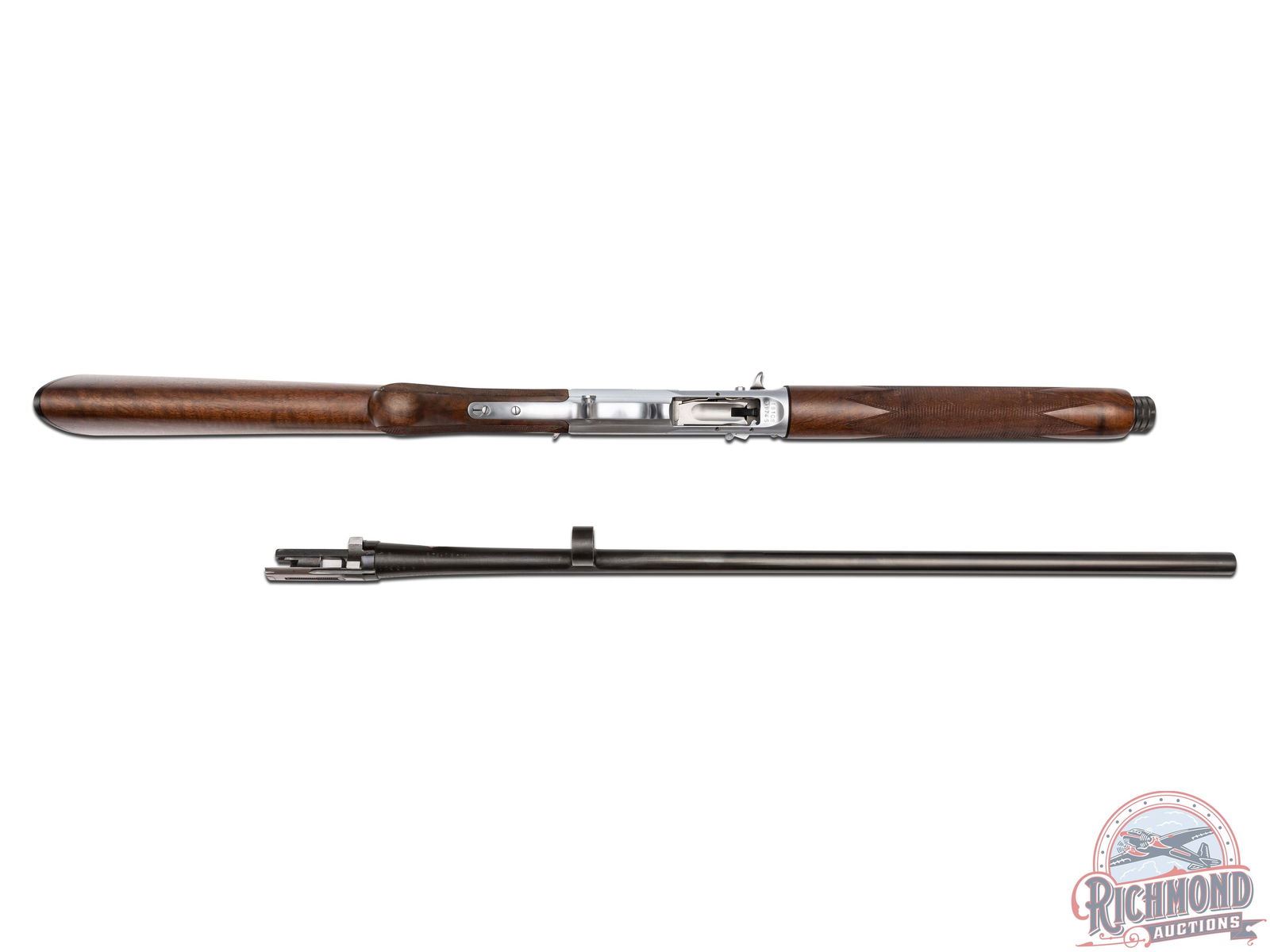 Lots 590 through 596 are scarce and mysterious examples of one of the company’s most legendary shotguns, the Auto-5, which John Browning even called his greatest achievement. After A5 production ended in 1998, it is believed that some spare parts were uncovered, leading Browning’s Custom Shop to create a very limited quantity of these A5 models. The only known examples are in 20 Gauge and 12 Gauge, each available in a Light and Magnum variation. To add more mystery, these variations were engraved with B3 and B4 patterns. While exact production numbers remain uncertain and are a topic of discussion among serious collectors, it is rumored that some of the gauge and engraving patterns featured here may have fewer than five known existing examples. If only eight total gauge and engraving patterns were produced, this offering of seven presents the most complete collection to hit the market at one time.