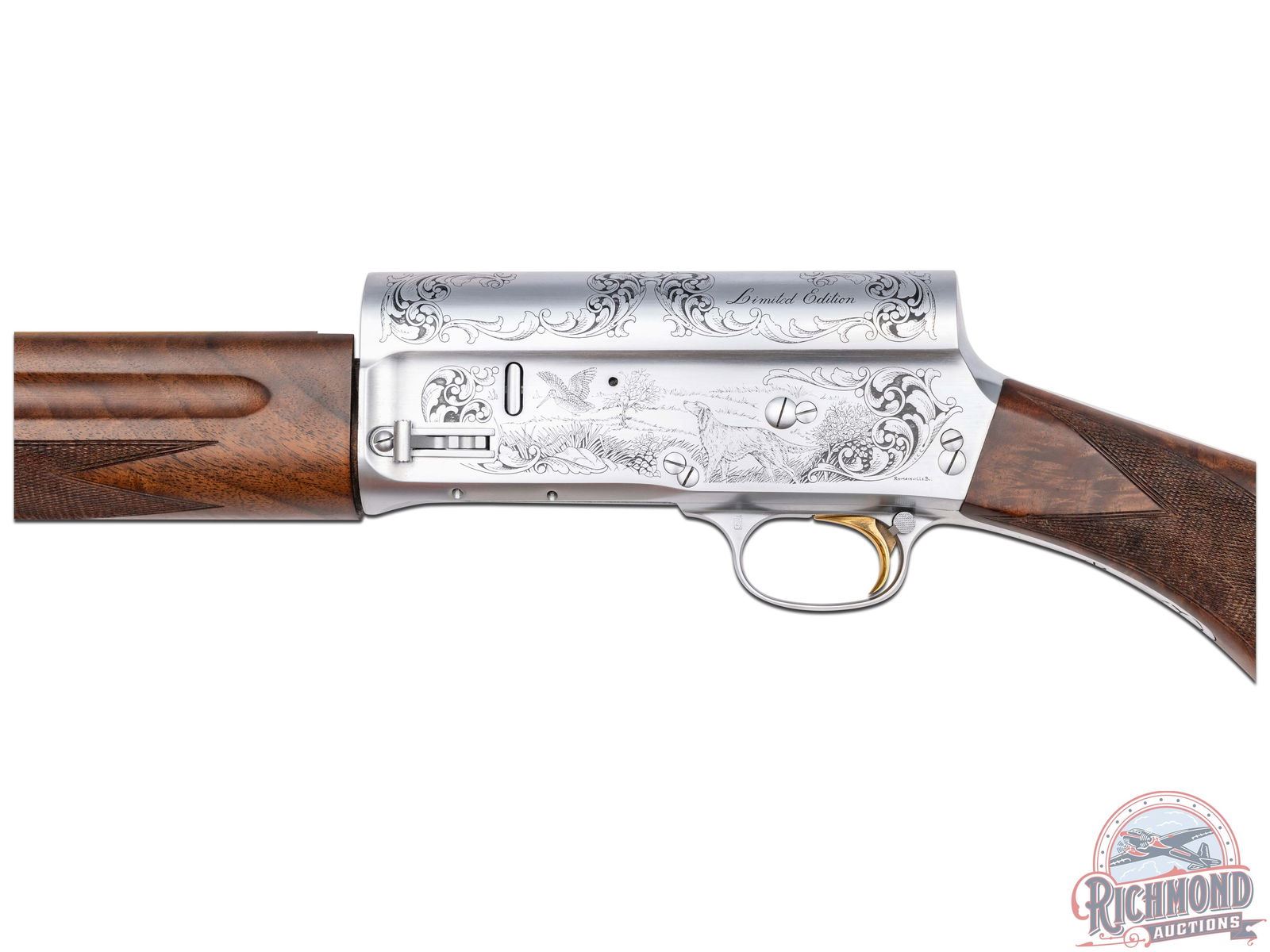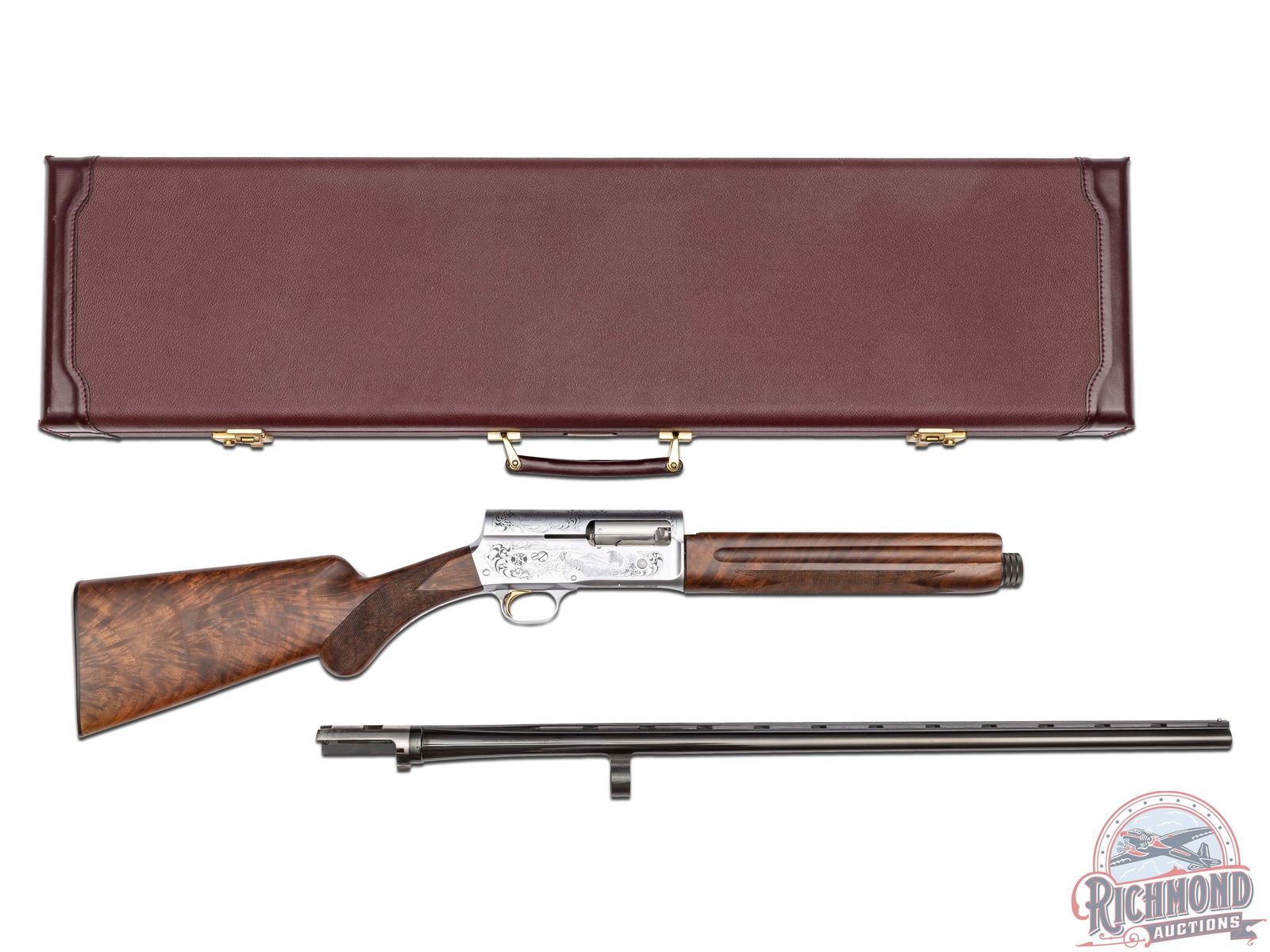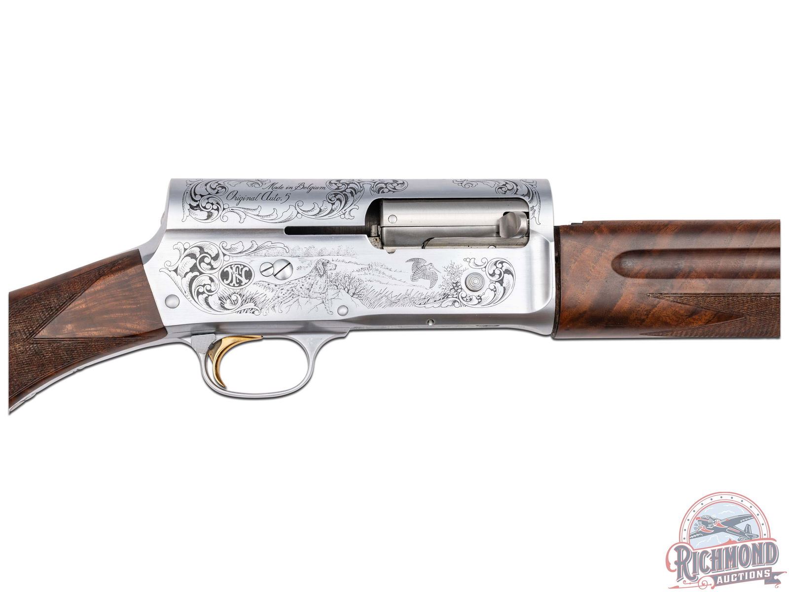 Manufactured in Belgium FN Custom Shop for Browning. Features a 28" blued ventilated rib barrel chambered for 3" shells with Improved Cylinder choke and nickel bead front sight. Coin finished receiver with Browning Custom Shop engraving. Top of the receiver features floral scroll designs with the left stamped "LIMITED EDITION" and the right stamped "ORIGINAL AUTO 5 / MADE IN BELGIUM". Left side features a woodcock in flight and setter in a field scene with floral scroll design on each side and signed by engraver at the bottom "ROMAINVILLE B.". Right side features a woodcock in flight and setter in a field scene with floral scroll design on each side along with a large FN logo. Crossbolt safety and gold washed trigger. Grade IV walnut round knob, long tang stock with checkered pistol grip and matching skeet style forearm with checkering. Fitted with a factory butt plate. Comes in a nice Emmebi burgundy velvet lined leather Browning Custom Shop take-down case with factory paperwork. Includes original Browning box as well. LOP: 14". DAC: 1-1/2". DAH: 2-1/4". CALIBER: 20 GA. S/N: 161CS01643. FFL STATUS: Modern.