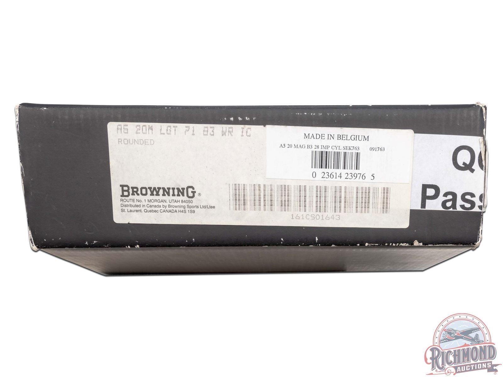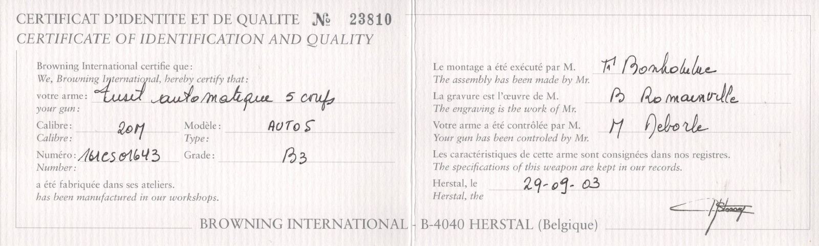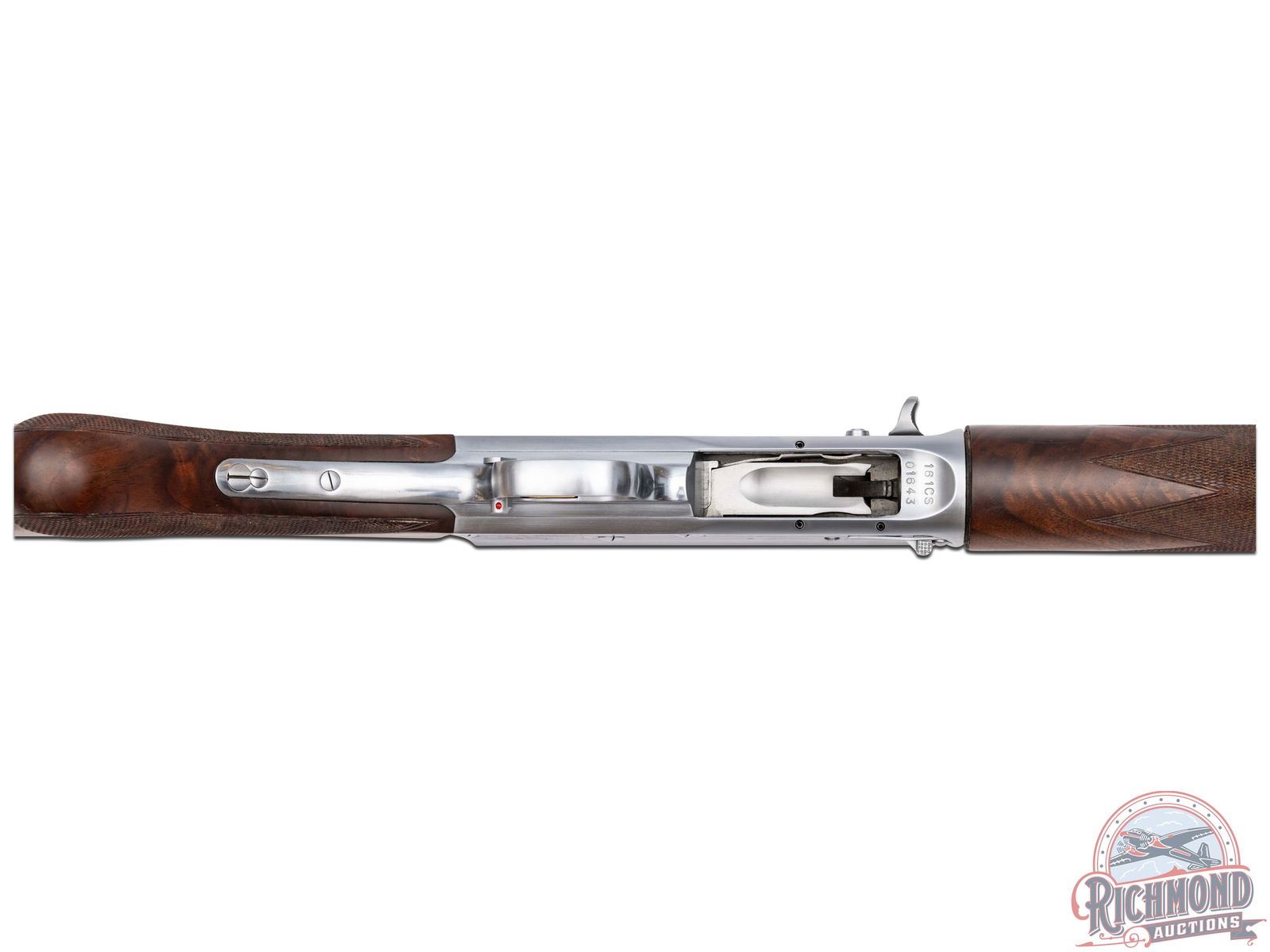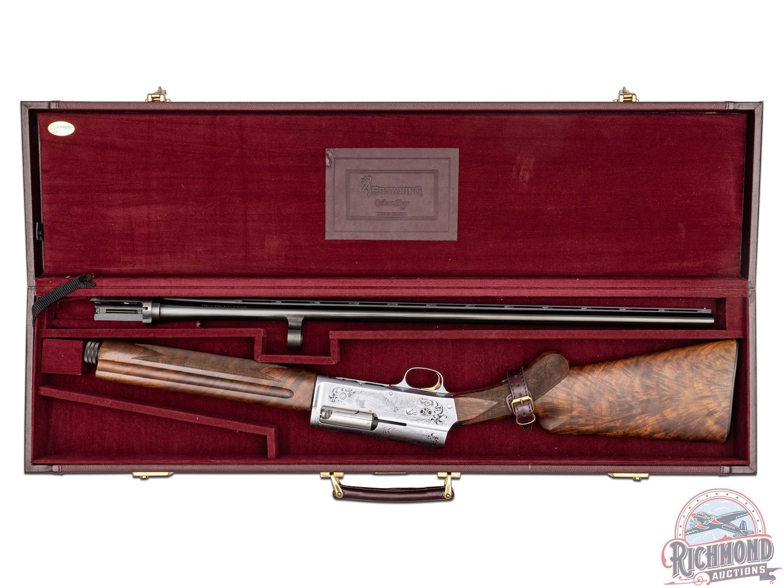 Manufactured in Belgium FN Custom Shop for Browning. Features a 28" blued ventilated rib barrel chambered for 3" shells with Improved Cylinder choke and nickel bead front sight. Coin finished receiver with Browning Custom Shop engraving. Top of the receiver features floral scroll designs with the left stamped "LIMITED EDITION" and the right stamped "ORIGINAL AUTO 5 / MADE IN BELGIUM". Left side features a woodcock in flight and setter in a field scene with floral scroll design on each side and signed by engraver at the bottom "ROMAINVILLE B.". Right side features a woodcock in flight and setter in a field scene with floral scroll design on each side along with a large FN logo. Crossbolt safety and gold washed trigger. Grade IV walnut round knob, long tang stock with checkered pistol grip and matching skeet style forearm with checkering. Fitted with a factory butt plate. Comes in a nice Emmebi burgundy velvet lined leather Browning Custom Shop take-down case with factory paperwork. Includes original Browning box as well. LOP: 14". DAC: 1-1/2". DAH: 2-1/4". CALIBER: 20 GA. S/N: 161CS01643. FFL STATUS: Modern.