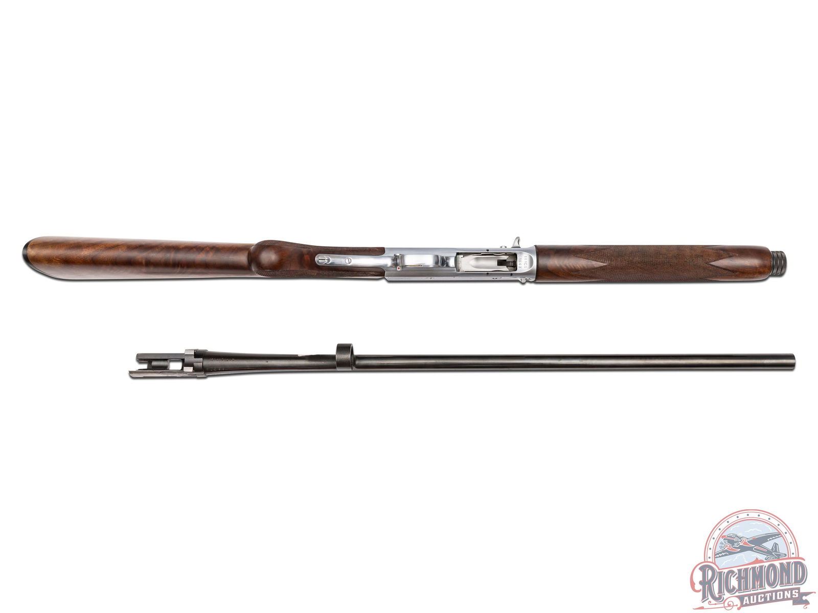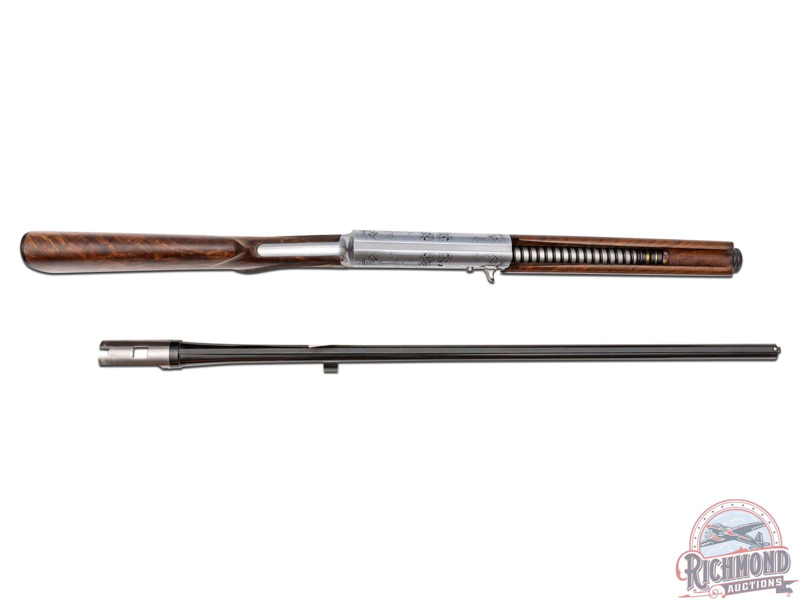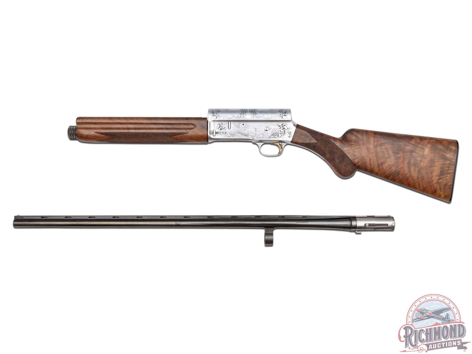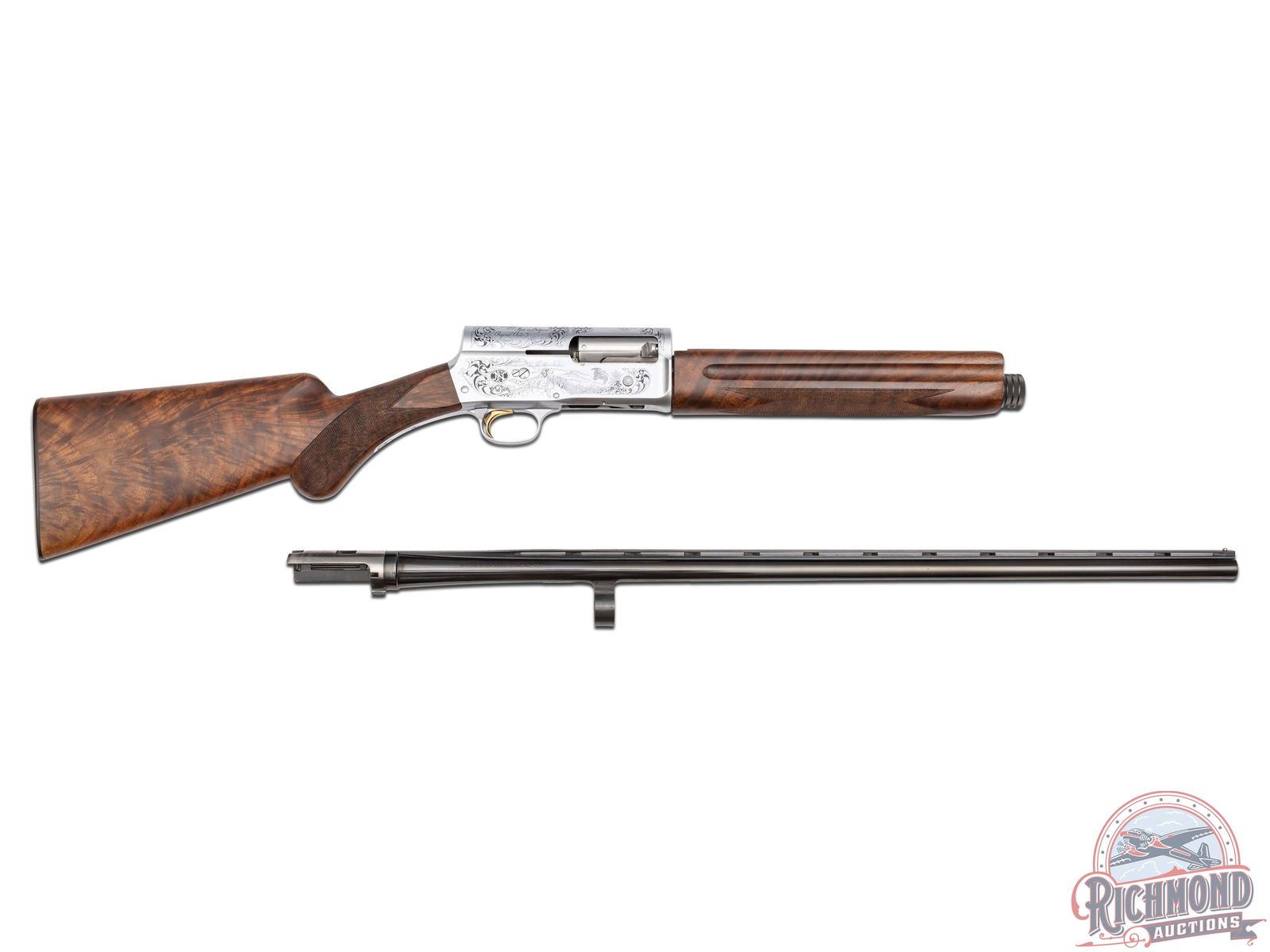 Lots 590 through 596 are scarce and mysterious examples of one of the company’s most legendary shotguns, the Auto-5, which John Browning even called his greatest achievement. After A5 production ended in 1998, it is believed that some spare parts were uncovered, leading Browning’s Custom Shop to create a very limited quantity of these A5 models. The only known examples are in 20 Gauge and 12 Gauge, each available in a Light and Magnum variation. To add more mystery, these variations were engraved with B3 and B4 patterns. While exact production numbers remain uncertain and are a topic of discussion among serious collectors, it is rumored that some of the gauge and engraving patterns featured here may have fewer than five known existing examples. If only eight total gauge and engraving patterns were produced, this offering of seven presents the most complete collection to hit the market at one time.