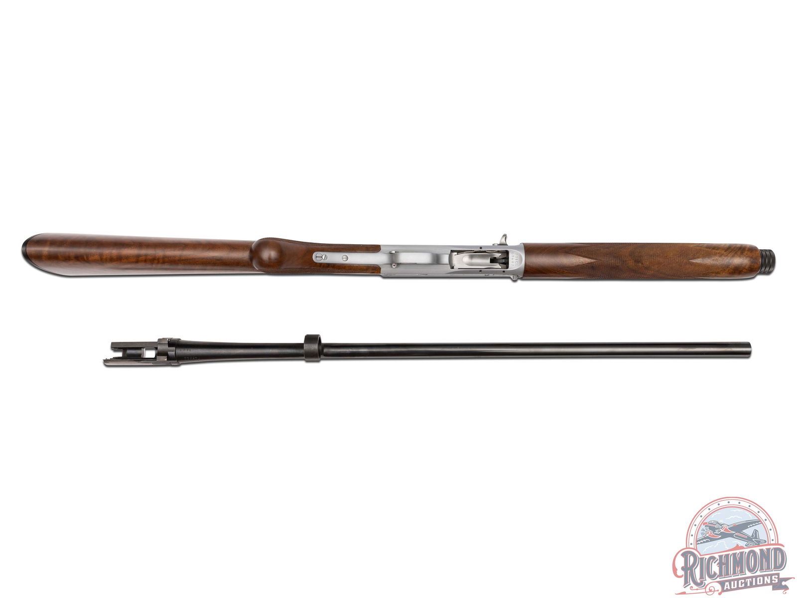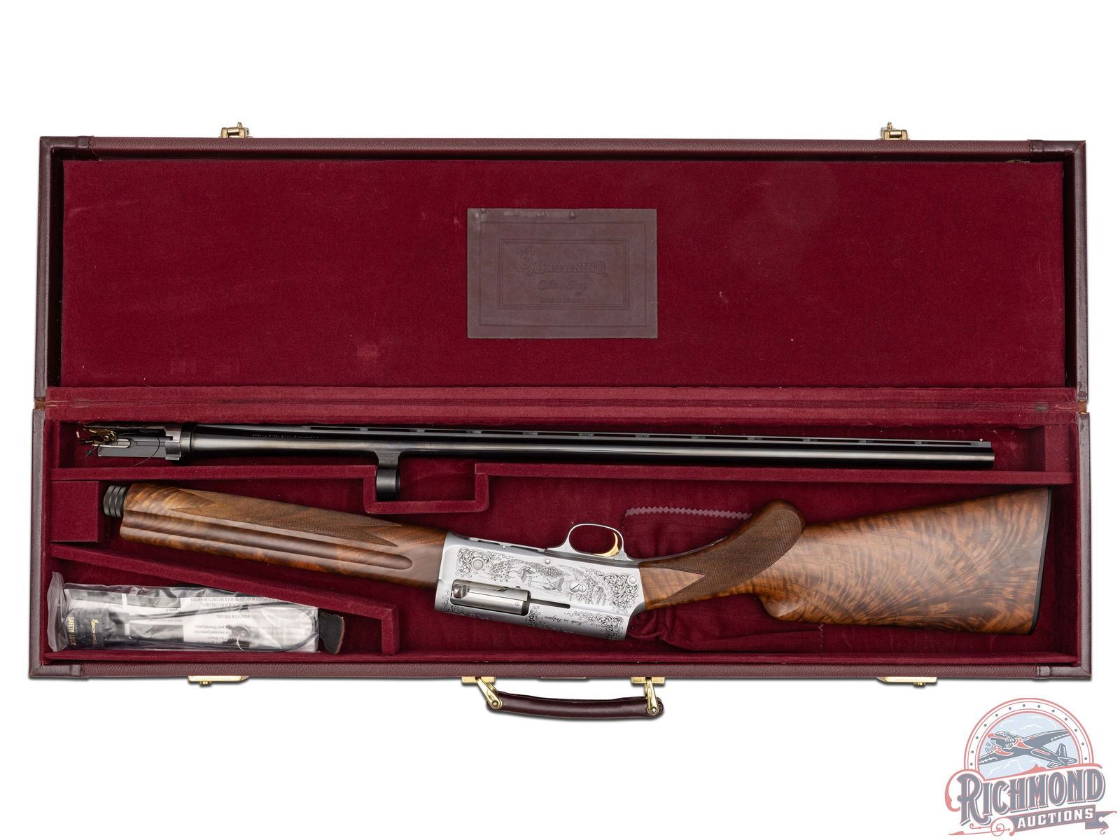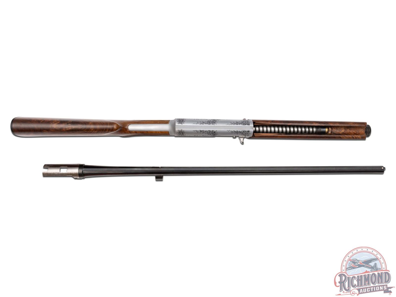 Lots 590 through 596 are scarce and mysterious examples of one of the company’s most legendary shotguns, the Auto-5, which John Browning even called his greatest achievement. After A5 production ended in 1998, it is believed that some spare parts were uncovered, leading Browning’s Custom Shop to create a very limited quantity of these A5 models. The only known examples are in 20 Gauge and 12 Gauge, each available in a Light and Magnum variation. To add more mystery, these variations were engraved with B3 and B4 patterns. While exact production numbers remain uncertain and are a topic of discussion among serious collectors, it is rumored that some of the gauge and engraving patterns featured here may have fewer than five known existing examples. If only eight total gauge and engraving patterns were produced, this offering of seven presents the most complete collection to hit the market at one time.