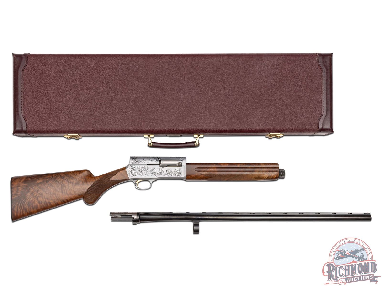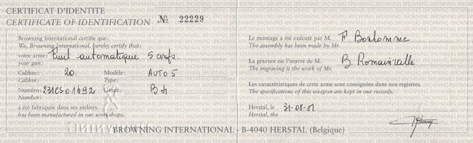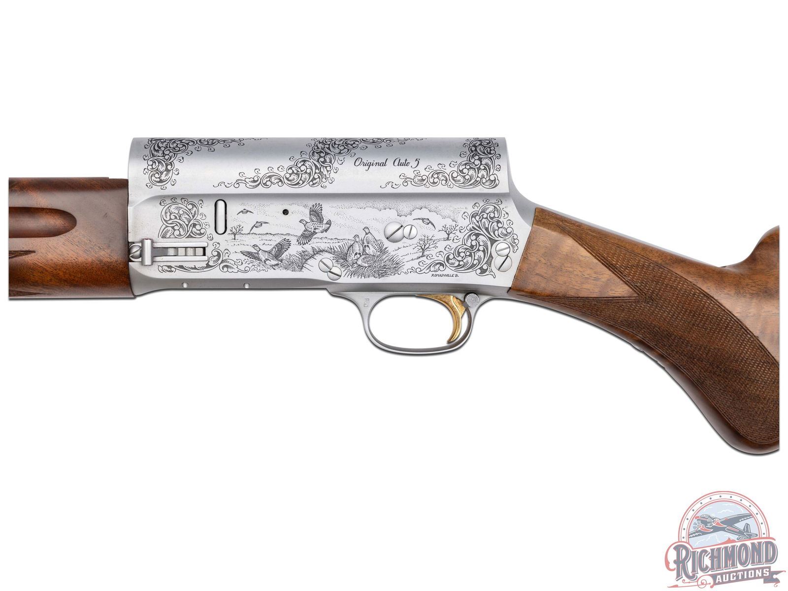 Manufactured in Belgium FN Custom Shop for Browning. Features a 28" blued ventilated rib barrel chambered for 2-3/4" shells with Improved Modified choke and nickel bead front sight. Coin finished receiver with Browning Custom Shop engraving. Top of the receiver features floral scroll designs with the left stamped "ORIGINAL AUTO 5" and right "MADE IN BELGIUM". Left side features several grouse in a field scene with a floral scroll design on each side and signed by engraver at the bottom "ROMAINVILLE B.". Right side features two woodcocks in flight in a woodland scene with floral scroll design on each side. Crossbolt safety and gold washed trigger. Grade IV walnut round knob, long tang stock with checkered pistol grip and matching skeet style forearm with checkering and satin oil finish. Fitted with a factory black plastic checkered butt plate. Comes in a nice Emmebi burgundy velvet lined leather Browning Custom Shop take-down case with factory Custom Shop paperwork and cable lock. Includes original Browning box and shipping box as well. LOP: 14". DAC: 1-1/2". DAH: 2-1/4". CALIBER: 20 GA. S/N: 231CS01492. FFL STATUS: Modern.