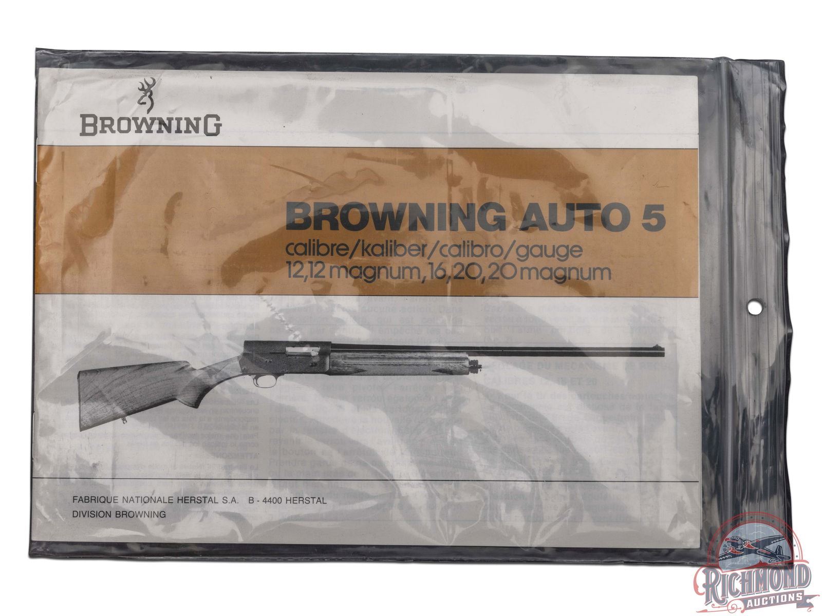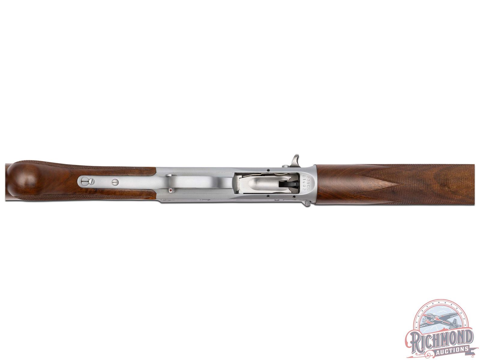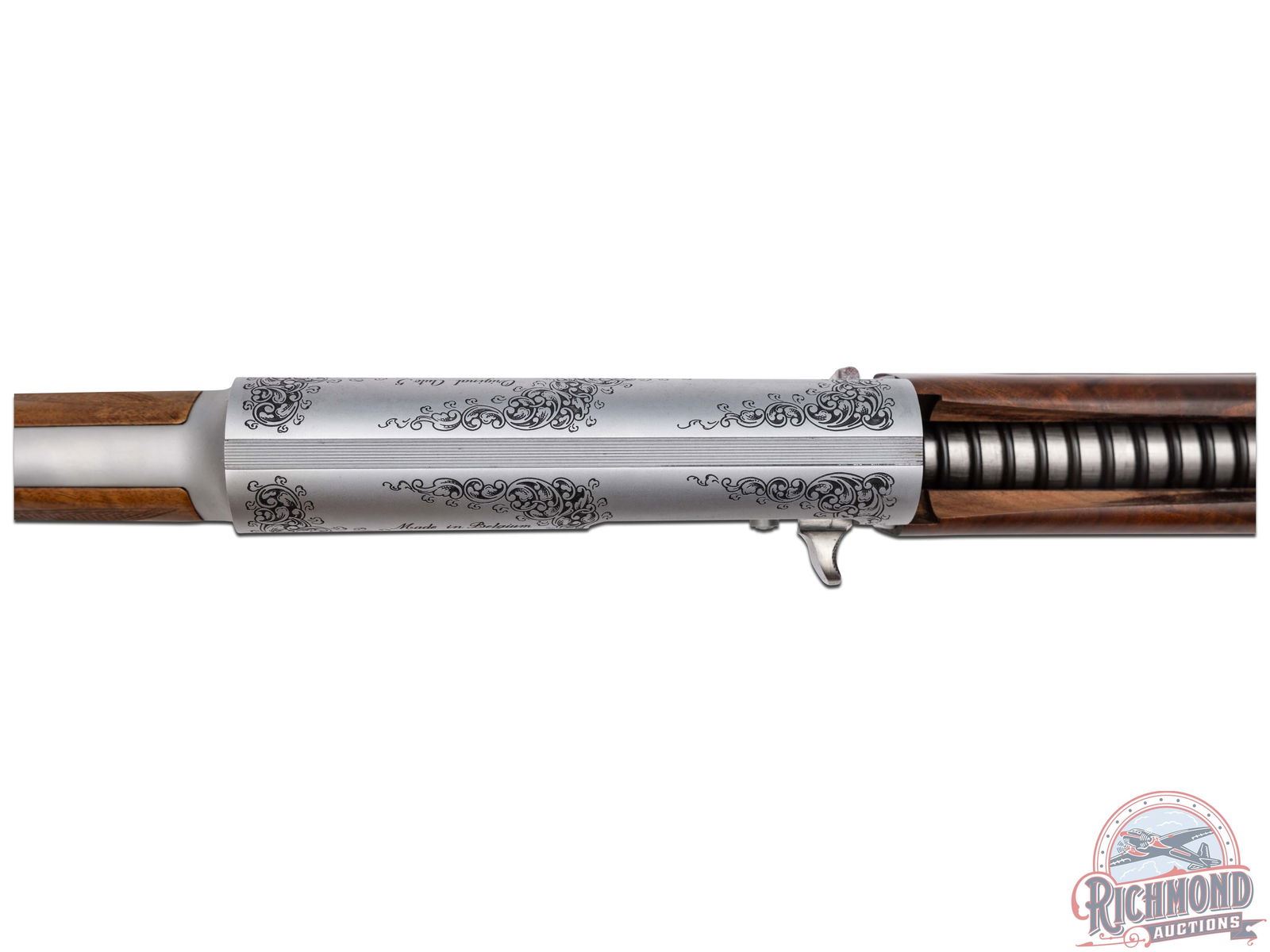 Manufactured in Belgium FN Custom Shop for Browning. Features a 28" blued ventilated rib barrel chambered for 2-3/4" shells with Improved Modified choke and nickel bead front sight. Coin finished receiver with Browning Custom Shop engraving. Top of the receiver features floral scroll designs with the left stamped "ORIGINAL AUTO 5" and right "MADE IN BELGIUM". Left side features several grouse in a field scene with a floral scroll design on each side and signed by engraver at the bottom "ROMAINVILLE B.". Right side features two woodcocks in flight in a woodland scene with floral scroll design on each side. Crossbolt safety and gold washed trigger. Grade IV walnut round knob, long tang stock with checkered pistol grip and matching skeet style forearm with checkering and satin oil finish. Fitted with a factory black plastic checkered butt plate. Comes in a nice Emmebi burgundy velvet lined leather Browning Custom Shop take-down case with factory Custom Shop paperwork and cable lock. Includes original Browning box and shipping box as well. LOP: 14". DAC: 1-1/2". DAH: 2-1/4". CALIBER: 20 GA. S/N: 231CS01492. FFL STATUS: Modern.
