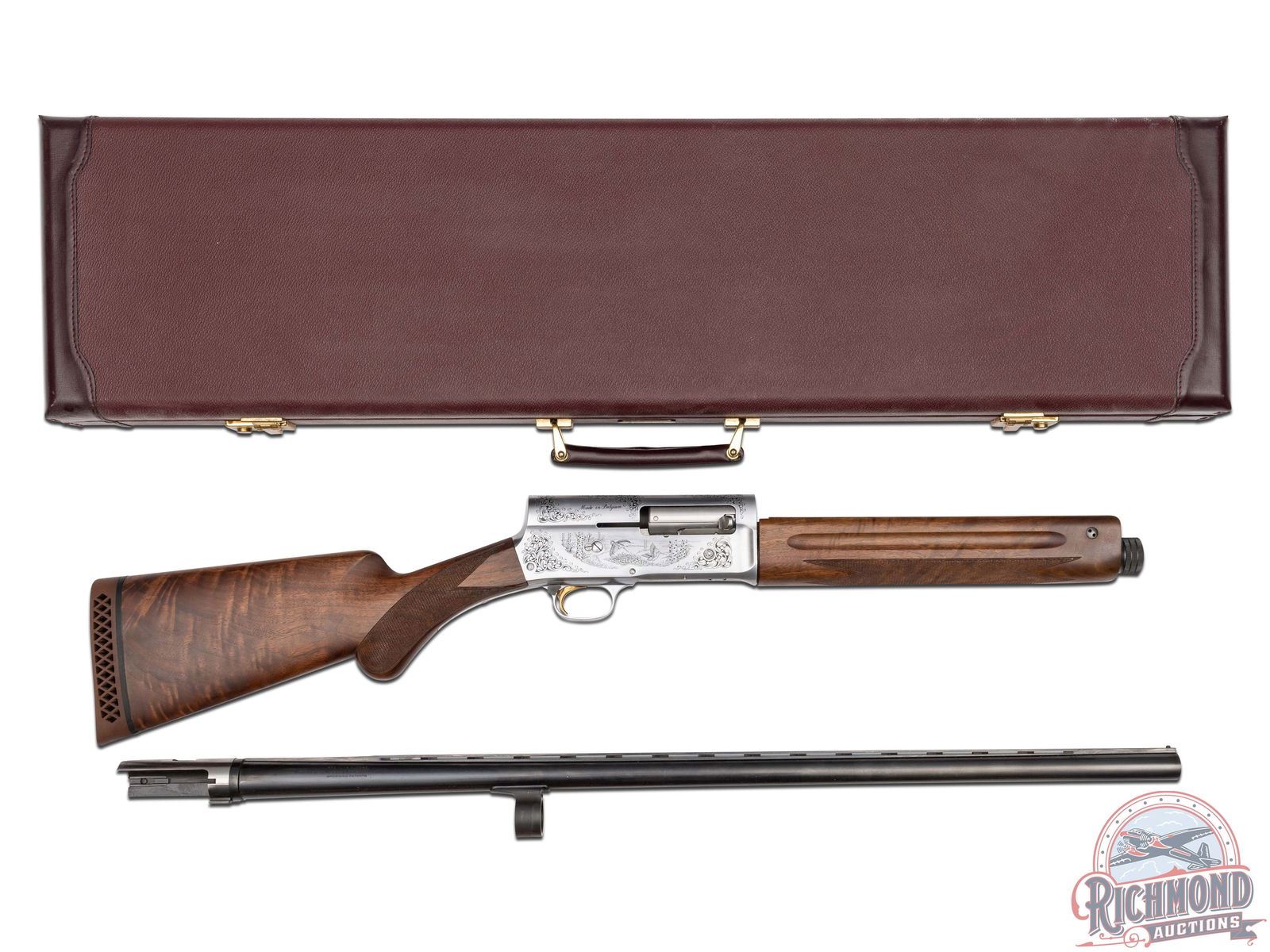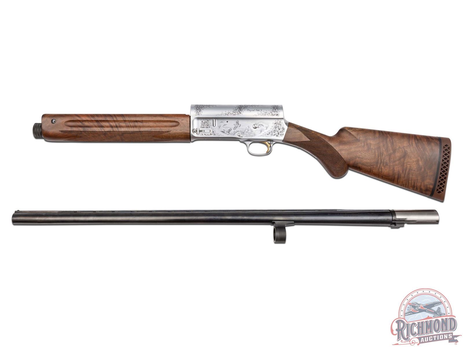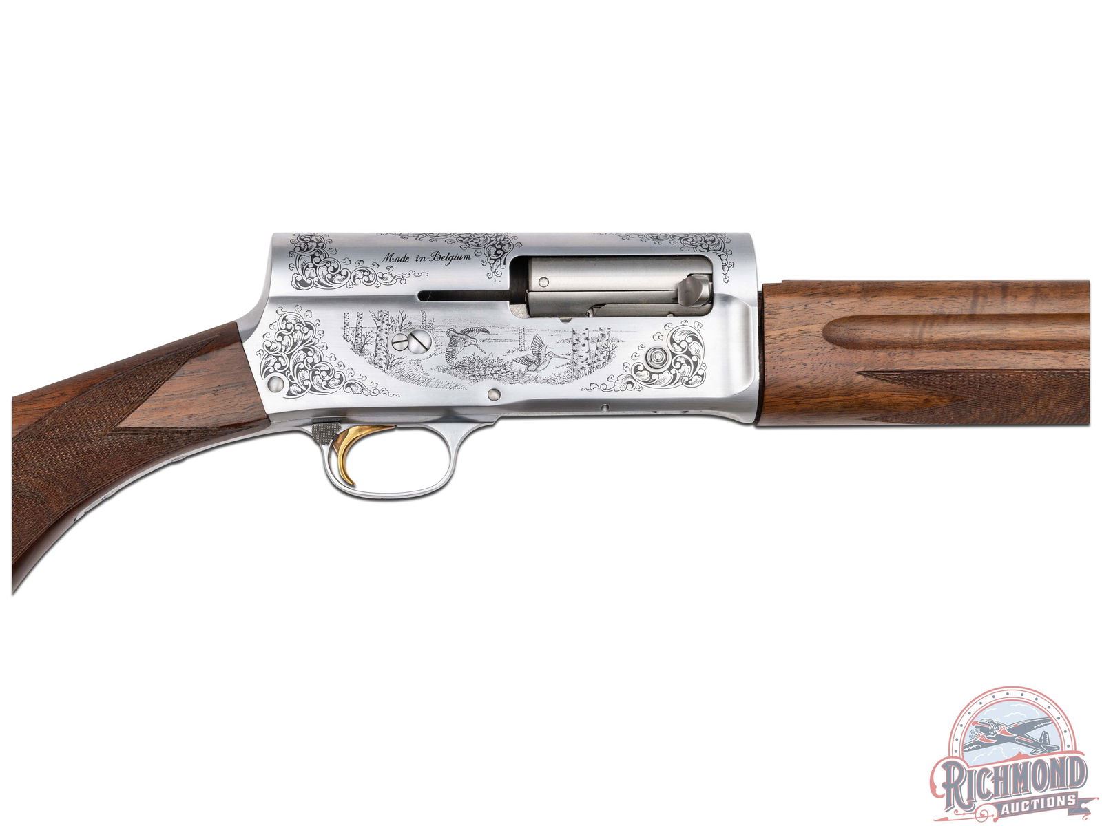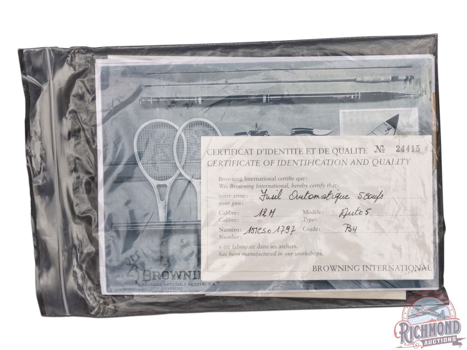 Manufactured in Belgium FN Custom Shop for Browning. Features a 30" blued ventilated rib barrel chambered for 3" magnum shells with Improved choke and nickel bead front sight. Coin finished receiver with Browning Custom Shop engraving. Top of the receiver features floral scroll designs with the left stamped "ORIGINAL AUTO 5" and right "MADE IN BELGIUM". Left side features several grouse in a field scene with a floral scroll design on each side and signed by engraver at the bottom "ROMAINVILLE B.". Right side features two woodcocks in flight in a woodland scene with a floral scroll design on each side. Crossbolt safety and gold washed trigger with Browning Buck logo stamped on the bottom of the guard. Grade IV walnut round knob, long tang stock with checkered pistol grip and matching skeet style forearm with checkering, all in a satin oil finish. Fitted with a factory brown ventilated recoil pad. Comes in a nice Emmebi burgundy velvet lined leather Browning Custom Shop take-down case. Includes original Browning paperwork, box and shipping box as well. LOP: 14". DAC: 1-5/8". DAH: 2-1/2". CALIBER: 12 GA. S/N: 151CS01797. FFL STATUS: Modern.