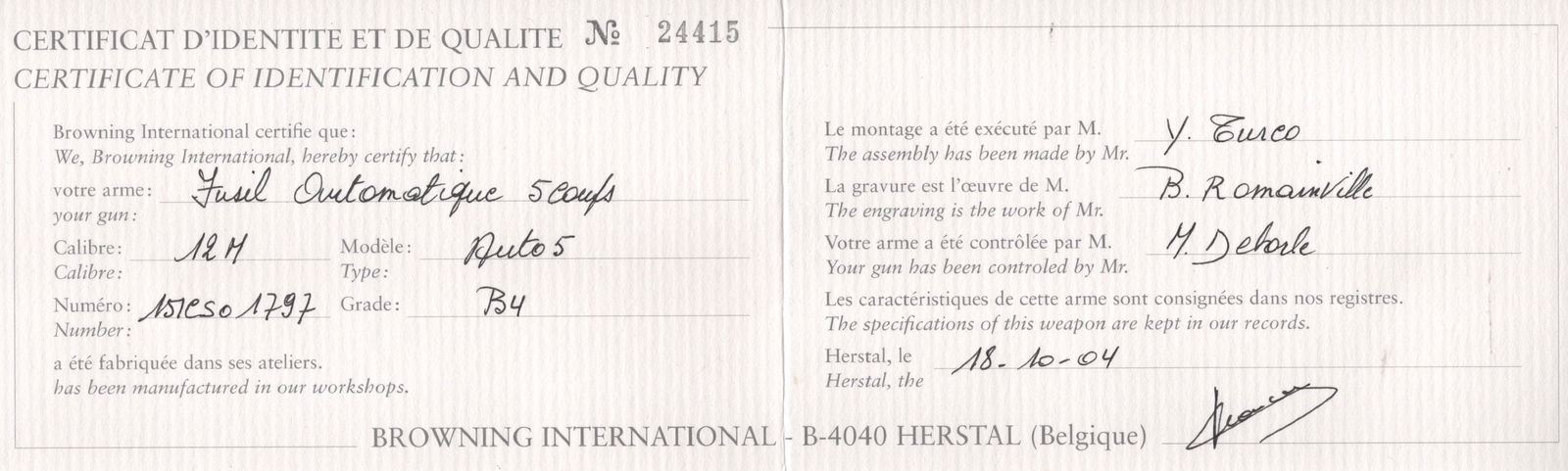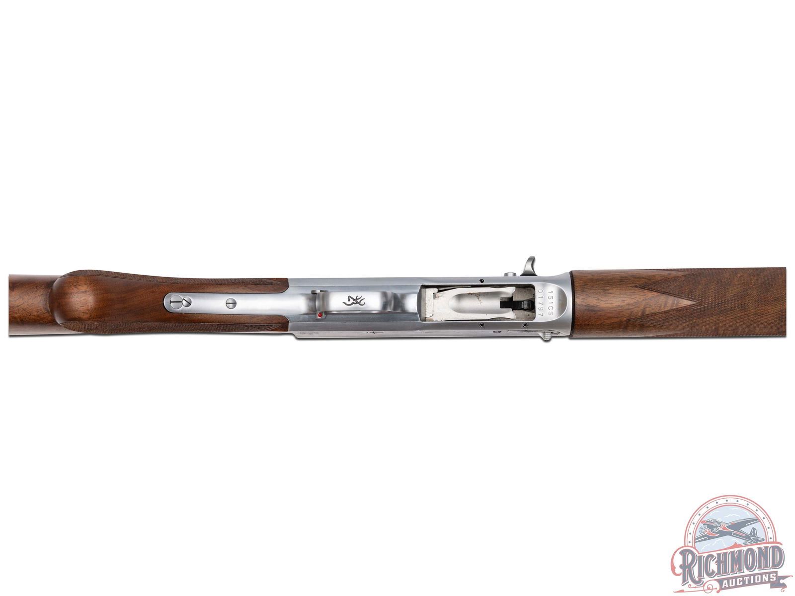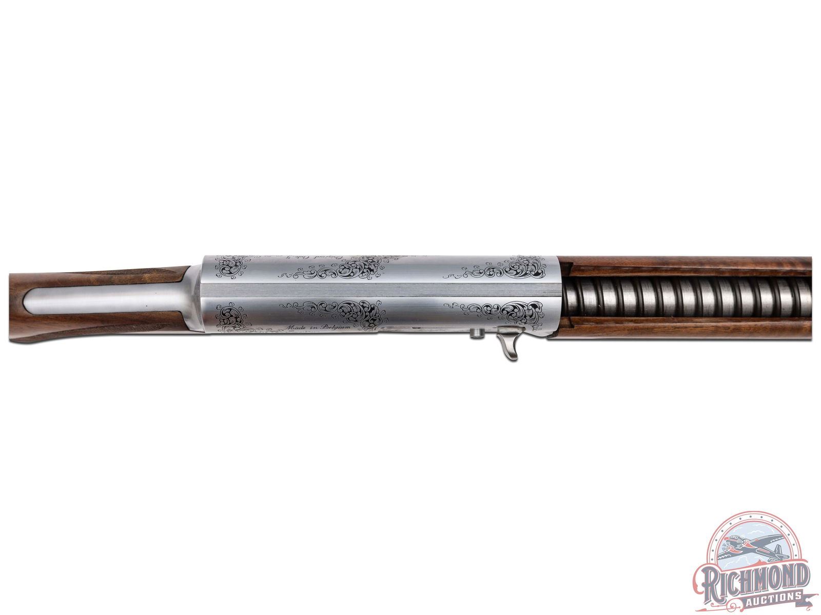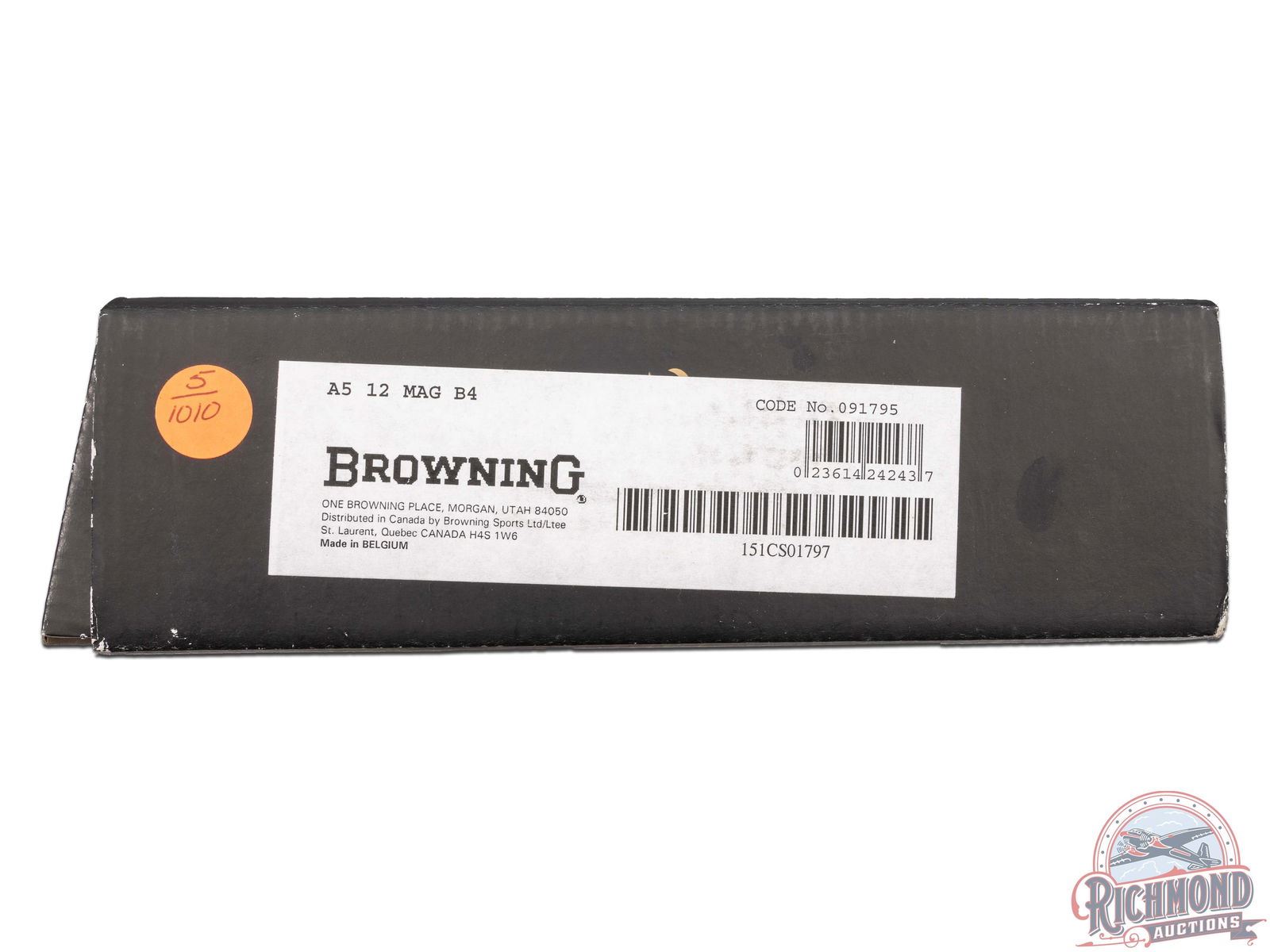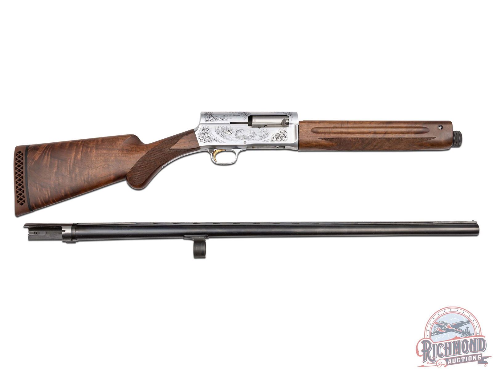 Manufactured in Belgium FN Custom Shop for Browning. Features a 30" blued ventilated rib barrel chambered for 3" magnum shells with Improved choke and nickel bead front sight. Coin finished receiver with Browning Custom Shop engraving. Top of the receiver features floral scroll designs with the left stamped "ORIGINAL AUTO 5" and right "MADE IN BELGIUM". Left side features several grouse in a field scene with a floral scroll design on each side and signed by engraver at the bottom "ROMAINVILLE B.". Right side features two woodcocks in flight in a woodland scene with a floral scroll design on each side. Crossbolt safety and gold washed trigger with Browning Buck logo stamped on the bottom of the guard. Grade IV walnut round knob, long tang stock with checkered pistol grip and matching skeet style forearm with checkering, all in a satin oil finish. Fitted with a factory brown ventilated recoil pad. Comes in a nice Emmebi burgundy velvet lined leather Browning Custom Shop take-down case. Includes original Browning paperwork, box and shipping box as well. LOP: 14". DAC: 1-5/8". DAH: 2-1/2". CALIBER: 12 GA. S/N: 151CS01797. FFL STATUS: Modern.