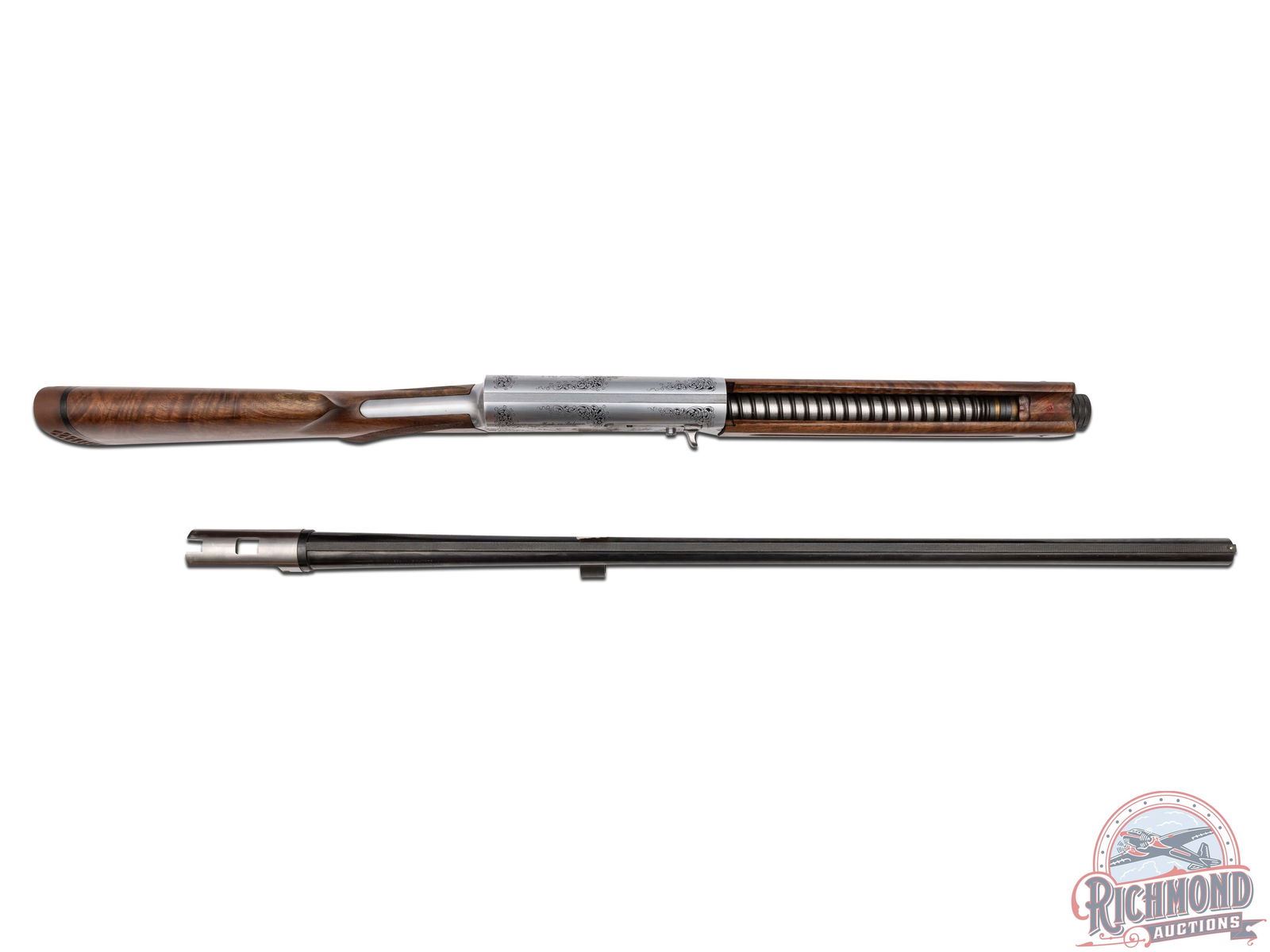 Lots 590 through 596 are scarce and mysterious examples of one of the company’s most legendary shotguns, the Auto-5, which John Browning even called his greatest achievement. After A5 production ended in 1998, it is believed that some spare parts were uncovered, leading Browning’s Custom Shop to create a very limited quantity of these A5 models. The only known examples are in 20 Gauge and 12 Gauge, each available in a Light and Magnum variation. To add more mystery, these variations were engraved with B3 and B4 patterns. While exact production numbers remain uncertain and are a topic of discussion among serious collectors, it is rumored that some of the gauge and engraving patterns featured here may have fewer than five known existing examples. If only eight total gauge and engraving patterns were produced, this offering of seven presents the most complete collection to hit the market at one time.