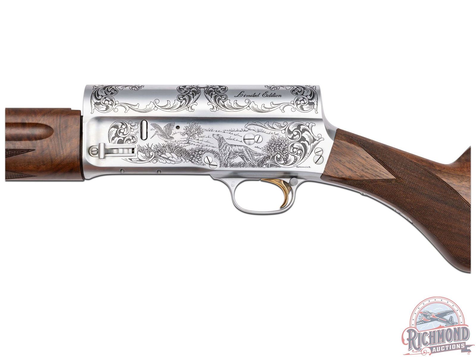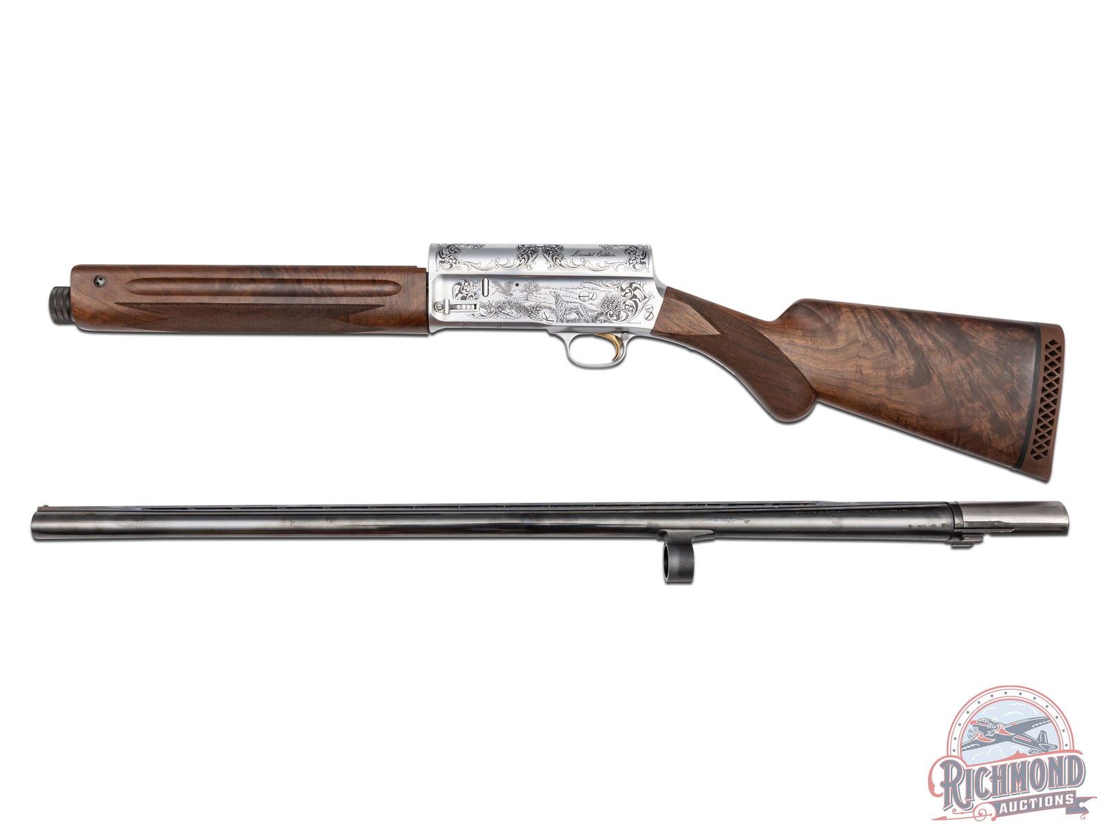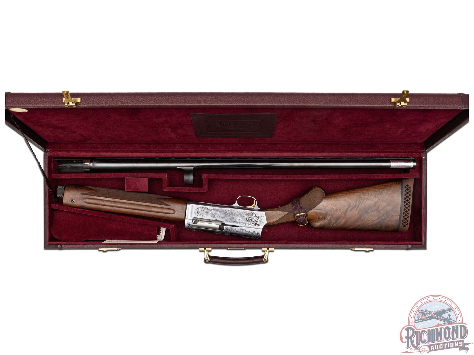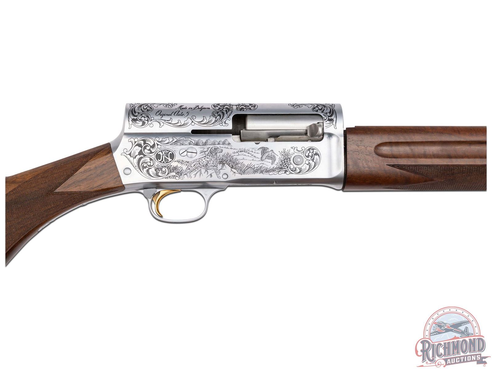 Manufactured in Belgium FN Custom Shop for Browning. Features a 30" blued ventilated rib barrel chambered for 3" magnum shells with Improved choke and nickel bead front sight. Coin finished receiver with Browning Custom Shop engraving. Top of the receiver features floral scroll designs with the left stamped "LIMITED EDITION" and the right stamped "ORIGINAL AUTO 5 / MADE IN BELGIUM". Left side features a woodcock in flight and setter in a field scene with floral scroll design on each side and signed by engraver at the bottom "ROMAINVILLE B.". Right side features a woodcock in flight and setter in a field scene with floral scroll design on each side along with a large FN logo. Crossbolt safety and gold washed trigger with Browning Buck logo stamped on the bottom of the guard. Grade IV walnut round knob, long tang stock with checkered pistol grip and matching skeet style forearm with checkering, all in a satin oil finish. Fitted with a factory brown ventilated recoil pad. Comes in a nice Emmebi burgundy velvet lined leather Browning Custom Shop take-down case. Includes original Browning box and shipping box as well. LOP: 14". DAC: 1-5/8". DAH: 2-1/2". CALIBER: 12 GA. S/N: 151CS01790. FFL STATUS: Modern.