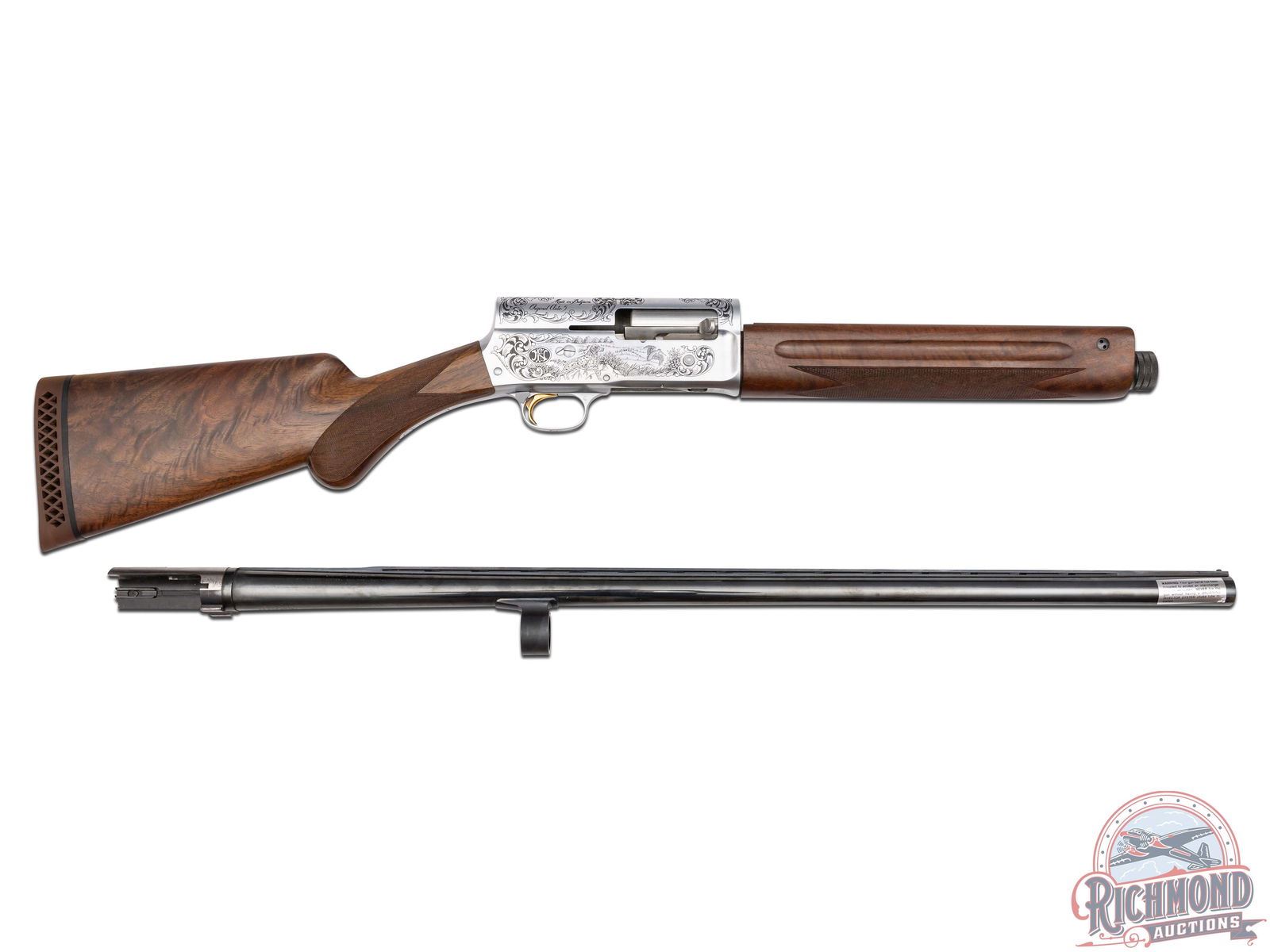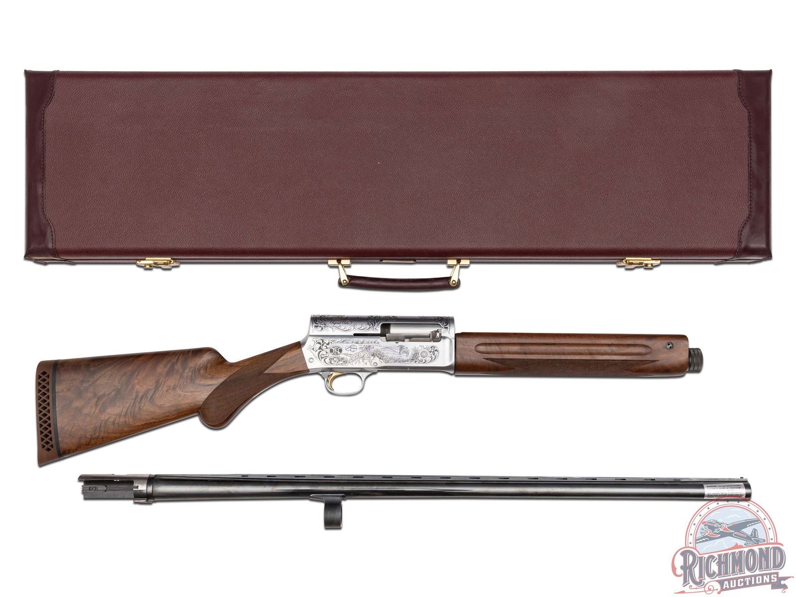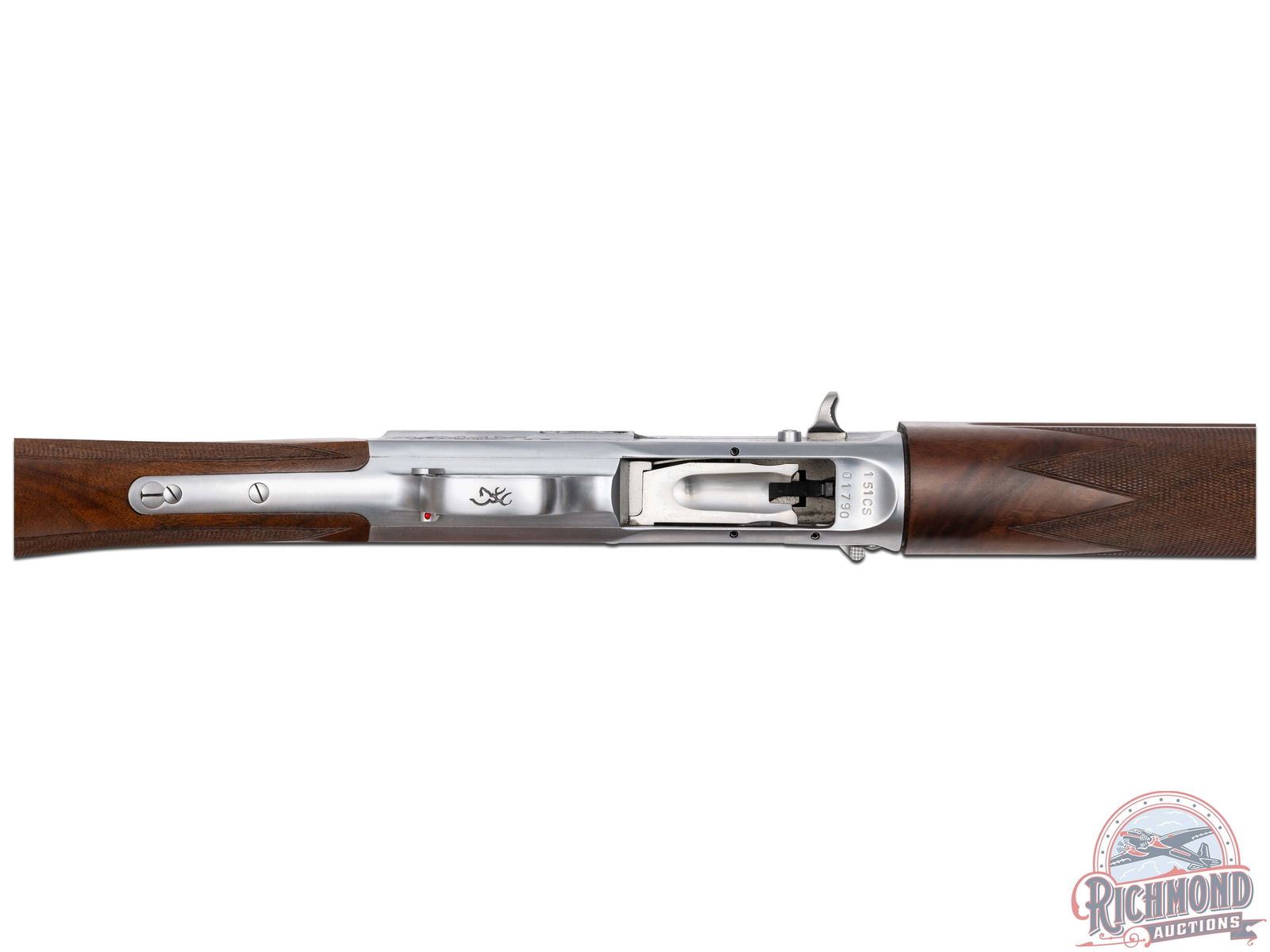 Manufactured in Belgium FN Custom Shop for Browning. Features a 30" blued ventilated rib barrel chambered for 3" magnum shells with Improved choke and nickel bead front sight. Coin finished receiver with Browning Custom Shop engraving. Top of the receiver features floral scroll designs with the left stamped "LIMITED EDITION" and the right stamped "ORIGINAL AUTO 5 / MADE IN BELGIUM". Left side features a woodcock in flight and setter in a field scene with floral scroll design on each side and signed by engraver at the bottom "ROMAINVILLE B.". Right side features a woodcock in flight and setter in a field scene with floral scroll design on each side along with a large FN logo. Crossbolt safety and gold washed trigger with Browning Buck logo stamped on the bottom of the guard. Grade IV walnut round knob, long tang stock with checkered pistol grip and matching skeet style forearm with checkering, all in a satin oil finish. Fitted with a factory brown ventilated recoil pad. Comes in a nice Emmebi burgundy velvet lined leather Browning Custom Shop take-down case. Includes original Browning box and shipping box as well. LOP: 14". DAC: 1-5/8". DAH: 2-1/2". CALIBER: 12 GA. S/N: 151CS01790. FFL STATUS: Modern.