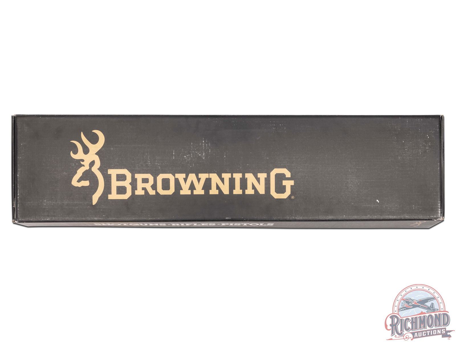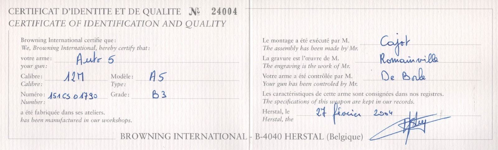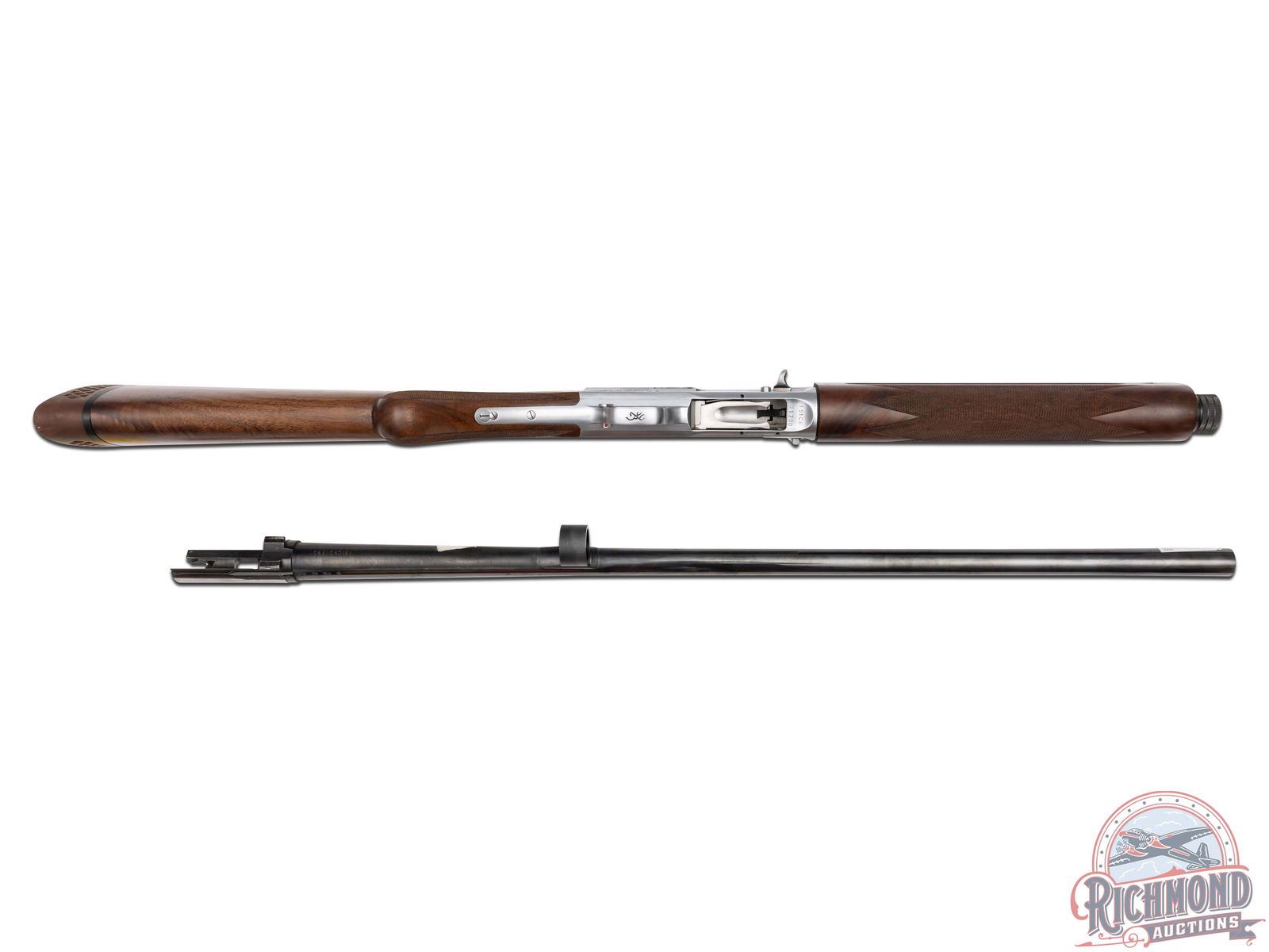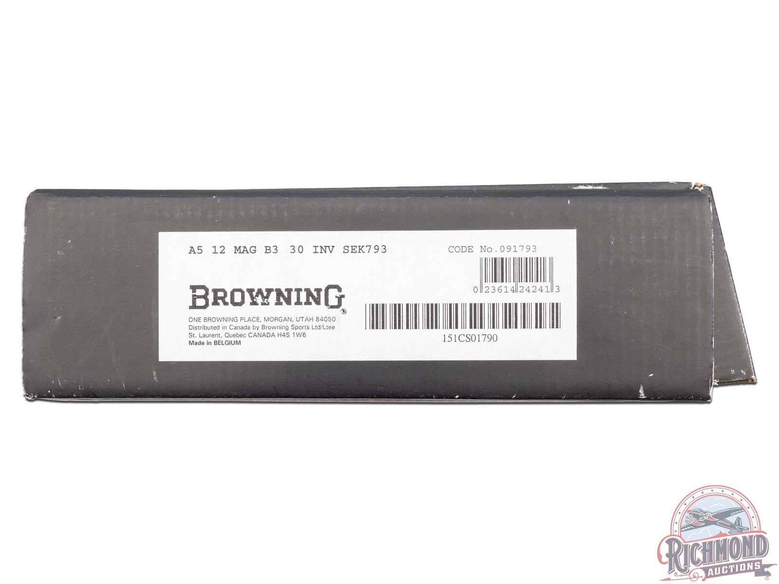 Manufactured in Belgium FN Custom Shop for Browning. Features a 30" blued ventilated rib barrel chambered for 3" magnum shells with Improved choke and nickel bead front sight. Coin finished receiver with Browning Custom Shop engraving. Top of the receiver features floral scroll designs with the left stamped "LIMITED EDITION" and the right stamped "ORIGINAL AUTO 5 / MADE IN BELGIUM". Left side features a woodcock in flight and setter in a field scene with floral scroll design on each side and signed by engraver at the bottom "ROMAINVILLE B.". Right side features a woodcock in flight and setter in a field scene with floral scroll design on each side along with a large FN logo. Crossbolt safety and gold washed trigger with Browning Buck logo stamped on the bottom of the guard. Grade IV walnut round knob, long tang stock with checkered pistol grip and matching skeet style forearm with checkering, all in a satin oil finish. Fitted with a factory brown ventilated recoil pad. Comes in a nice Emmebi burgundy velvet lined leather Browning Custom Shop take-down case. Includes original Browning box and shipping box as well. LOP: 14". DAC: 1-5/8". DAH: 2-1/2". CALIBER: 12 GA. S/N: 151CS01790. FFL STATUS: Modern.