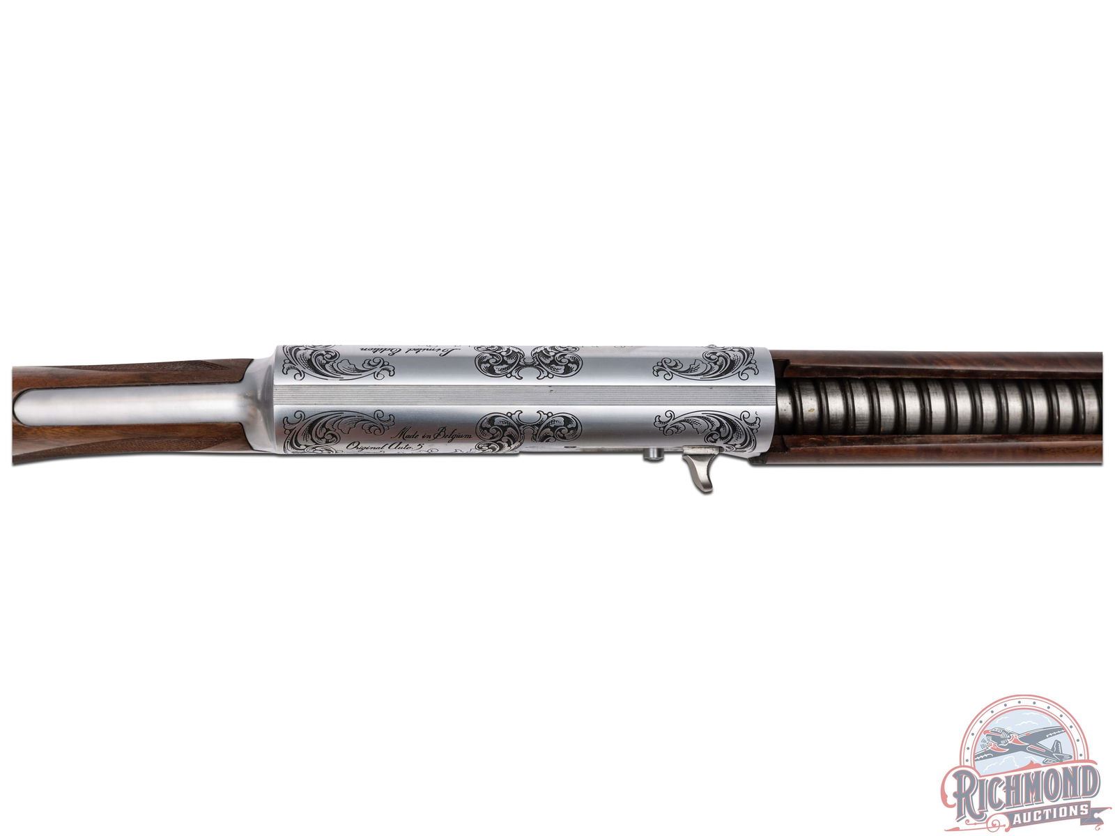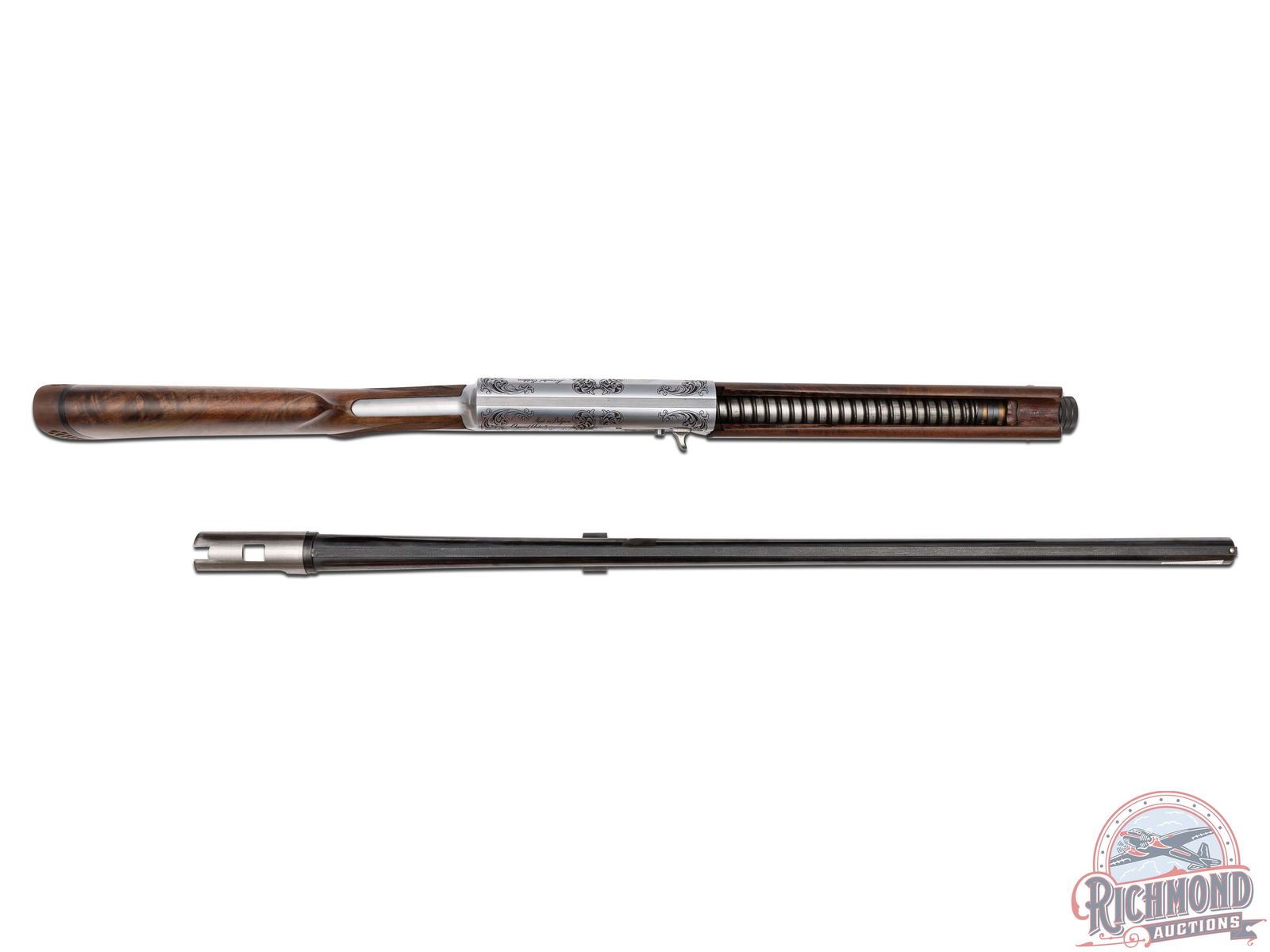 Lots 590 through 596 are scarce and mysterious examples of one of the company’s most legendary shotguns, the Auto-5, which John Browning even called his greatest achievement. After A5 production ended in 1998, it is believed that some spare parts were uncovered, leading Browning’s Custom Shop to create a very limited quantity of these A5 models. The only known examples are in 20 Gauge and 12 Gauge, each available in a Light and Magnum variation. To add more mystery, these variations were engraved with B3 and B4 patterns. While exact production numbers remain uncertain and are a topic of discussion among serious collectors, it is rumored that some of the gauge and engraving patterns featured here may have fewer than five known existing examples. If only eight total gauge and engraving patterns were produced, this offering of seven presents the most complete collection to hit the market at one time.