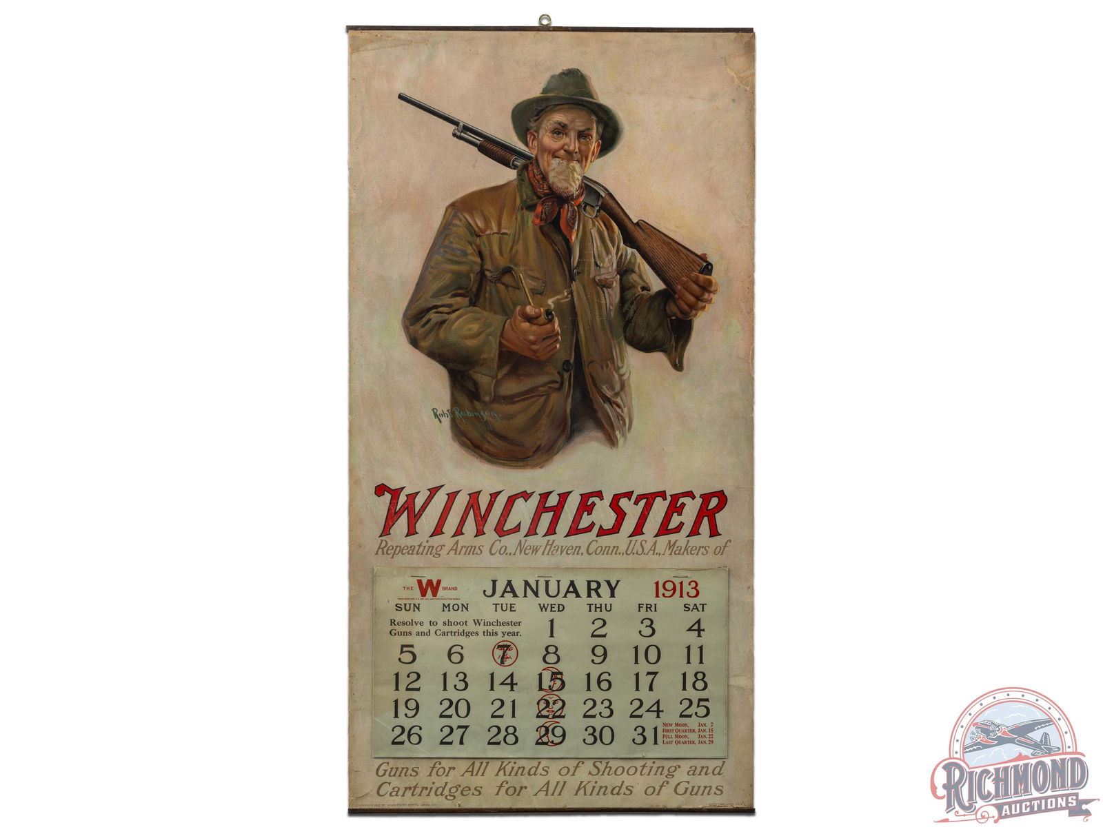 Desired Winchester calendar featuring the pipe smoking hunter and his Model 12 shotgun scene, by Robert Robinson. Reads "Guns for All Kinds of Shooting and Cartridges for All Kinds of Guns." Exhibits with wear, tears, and creases throughout but heavier along the top third. An iconic calendar with what appears to be a complete 1913 pad. Shrink wrapped and secured to foamboard. Presents with top and bottom bands. Marked Copyright 1912 by Winchester Reptg Arms Co, American Litho Co NY. 30" H x 15.5" W.