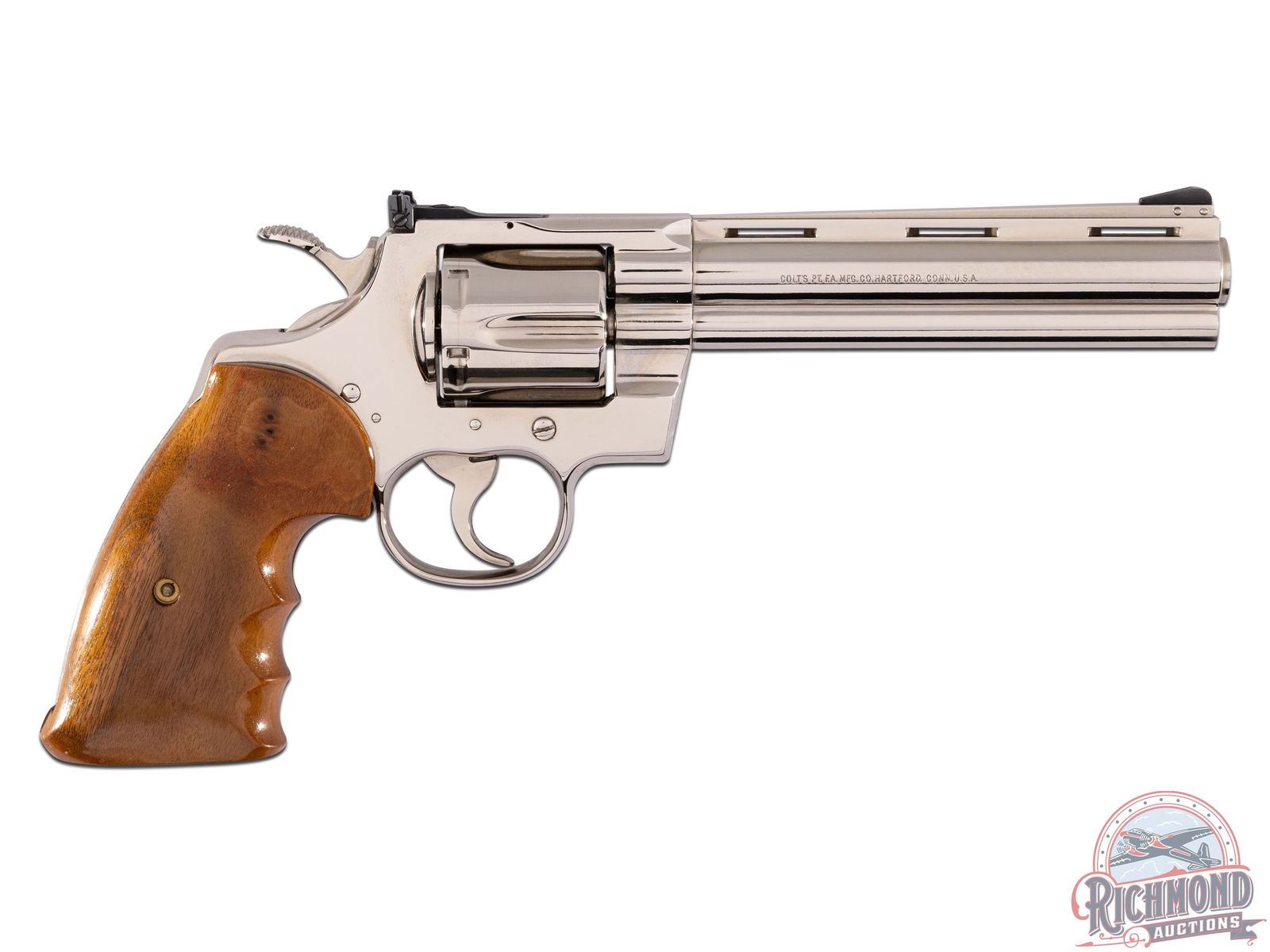 Manufactured in 1979. This early snake gun features a 6" ventilated rib barrel with full length ejector shroud. Rear adjustable notch with front ramp sights. Left side of the barrel is stamped "PYTHON .357 /* 357 MAGNUM CTG*". Right side of barrel is stamped with a single line Colt address. Left side of the frame is stamped with the Rampant Colt logo. Nickel plated finish with a six round fluted, swing-out cylinder chambered for 357 Magnum or 38 Special cartridges. Fitted with smooth wood finger grooved grips. Includes a Boyt brand soft case. CALIBER: 357 MAG. S/N: V69495. FFL STATUS: Modern.
