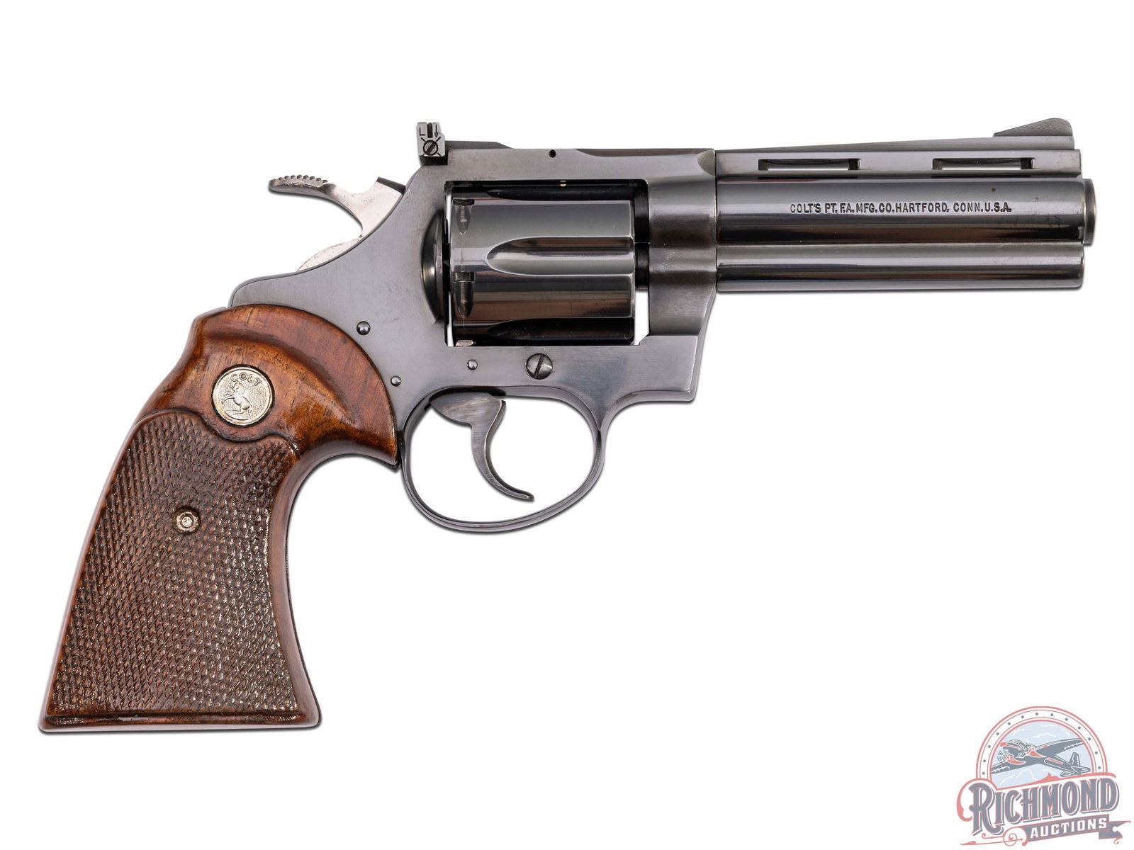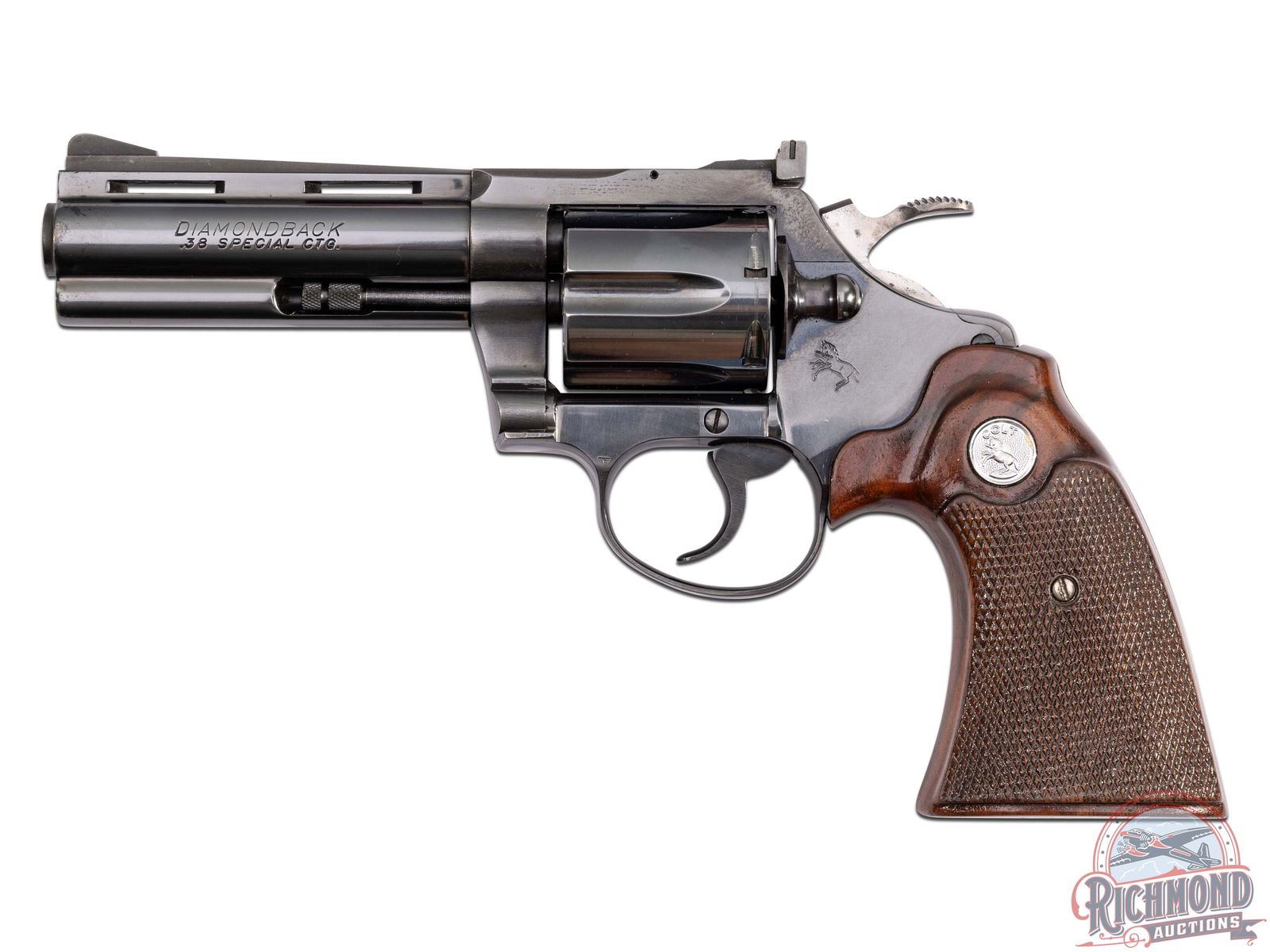 Manufactured in 1978. This beautiful snake gun features a 4" ventilated barrel with full length ejector shroud. Rear adjustable notch with front ramp sights. Left side of the barrel is stamped "DIAMONDBACK / .38 SPECIAL CTG". Right side of barrel is stamped with a single line Colt address. Left side of the frame is stamped with the Rampant Colt logo. Blued finish with a six round fluted, swing-out cylinder chambered for 38 Special cartridges. Fitted with beautiful factory Colt checkered walnut wood grips with silver tone Colt medallions. CALIBER: 38 SPL. S/N: R38047. FFL STATUS: Modern.