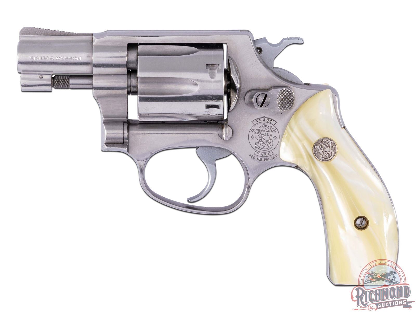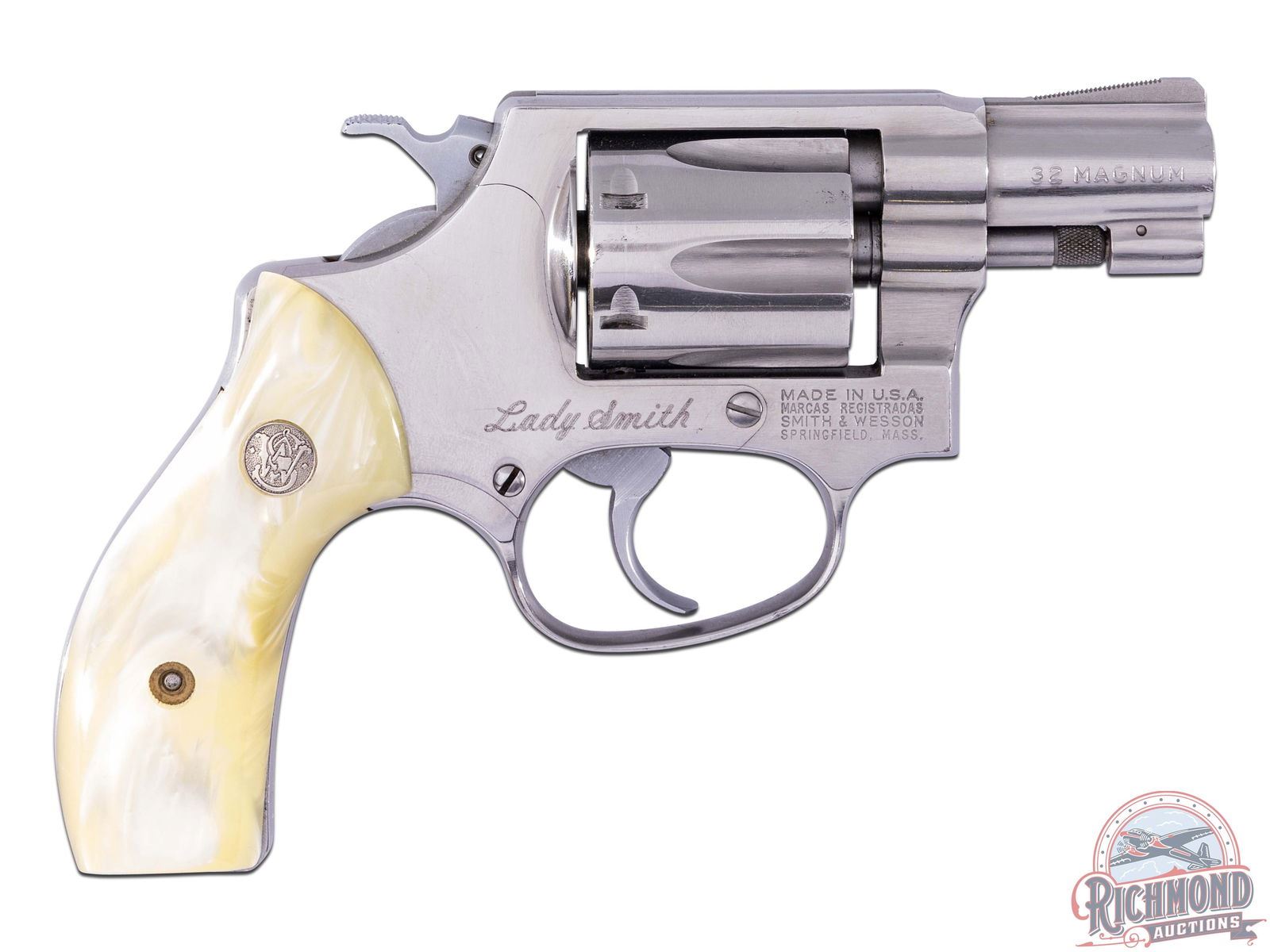 Manufactured in 1990 with only 190 given the laser etched "LadySmith" moniker. This little beauty features a 2" snub nose barrel with integrated rear notch sight and ramp front sight. Left side of the barrel is stamped "SMITH & WESSON" and the right "32 MAGNUM". Right side of the frame is laser etched "LADY SMITH" in cursive script and four-line S&W address. Left side of the frame is stamped with the S&W trademark. Stainless steel finish with a 6-round fluted, swing-out cylinder. Fitted with factory J-frame pearl acrylic grips with S&W silver tone medallions. CALIBER: 32 H&R Mag. S/N: BEY4138. FFL STATUS: Modern.