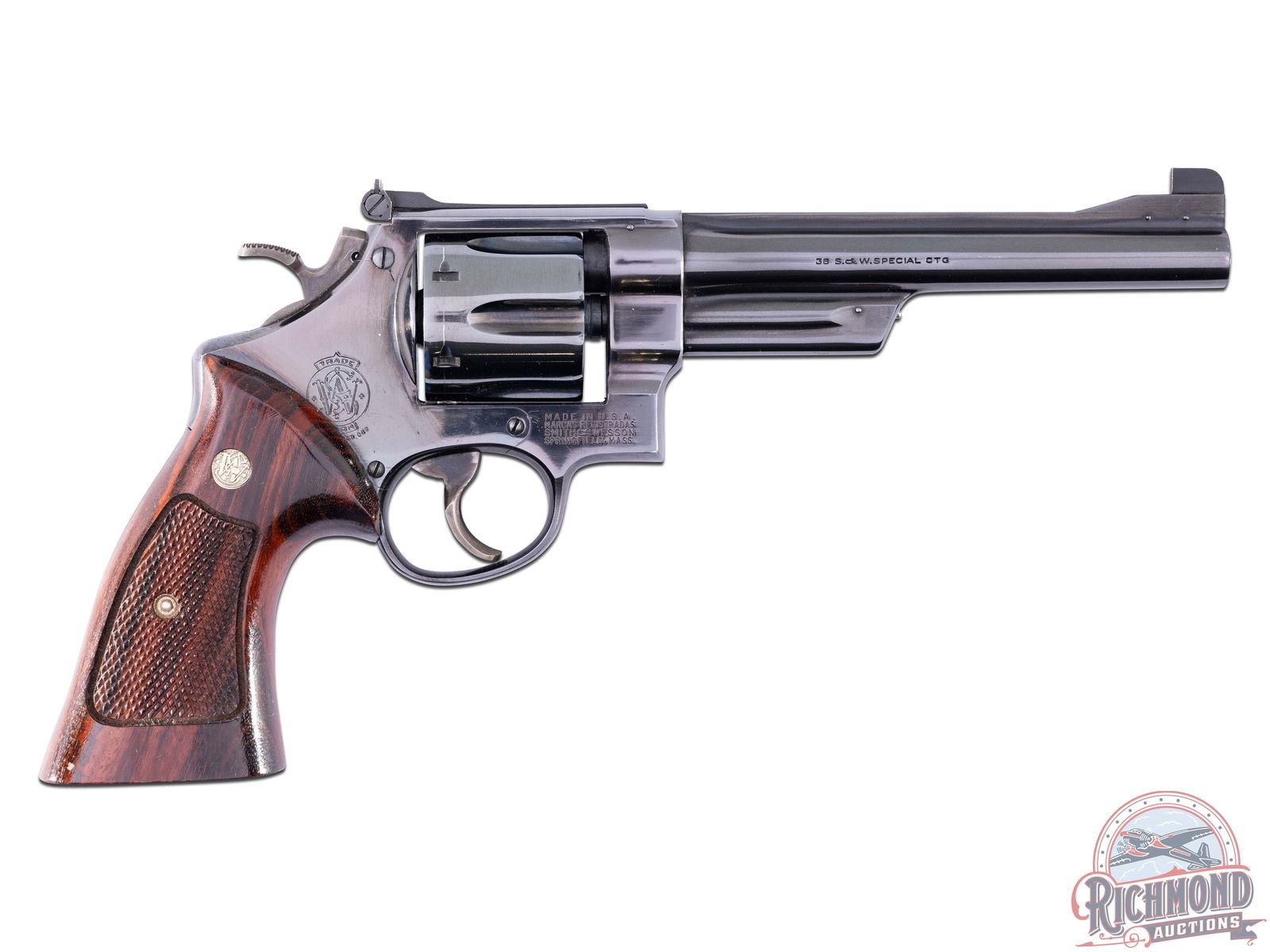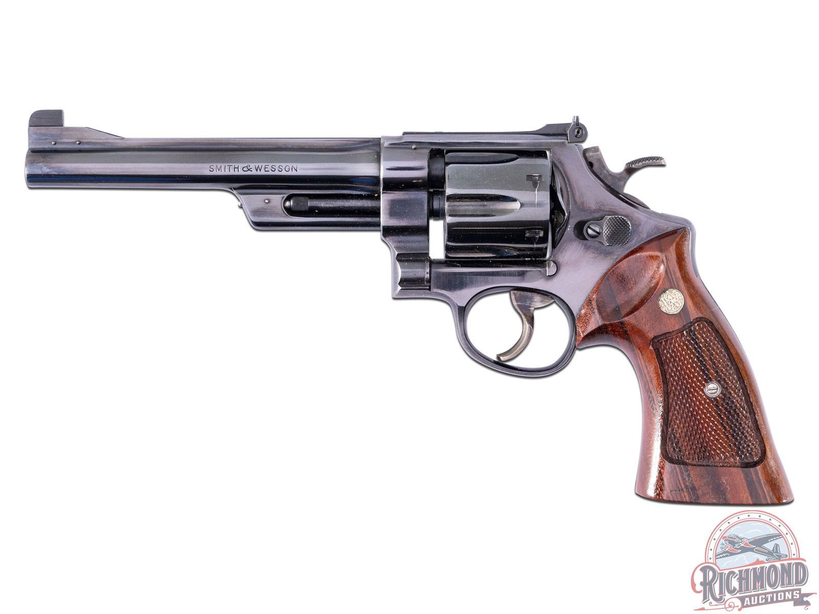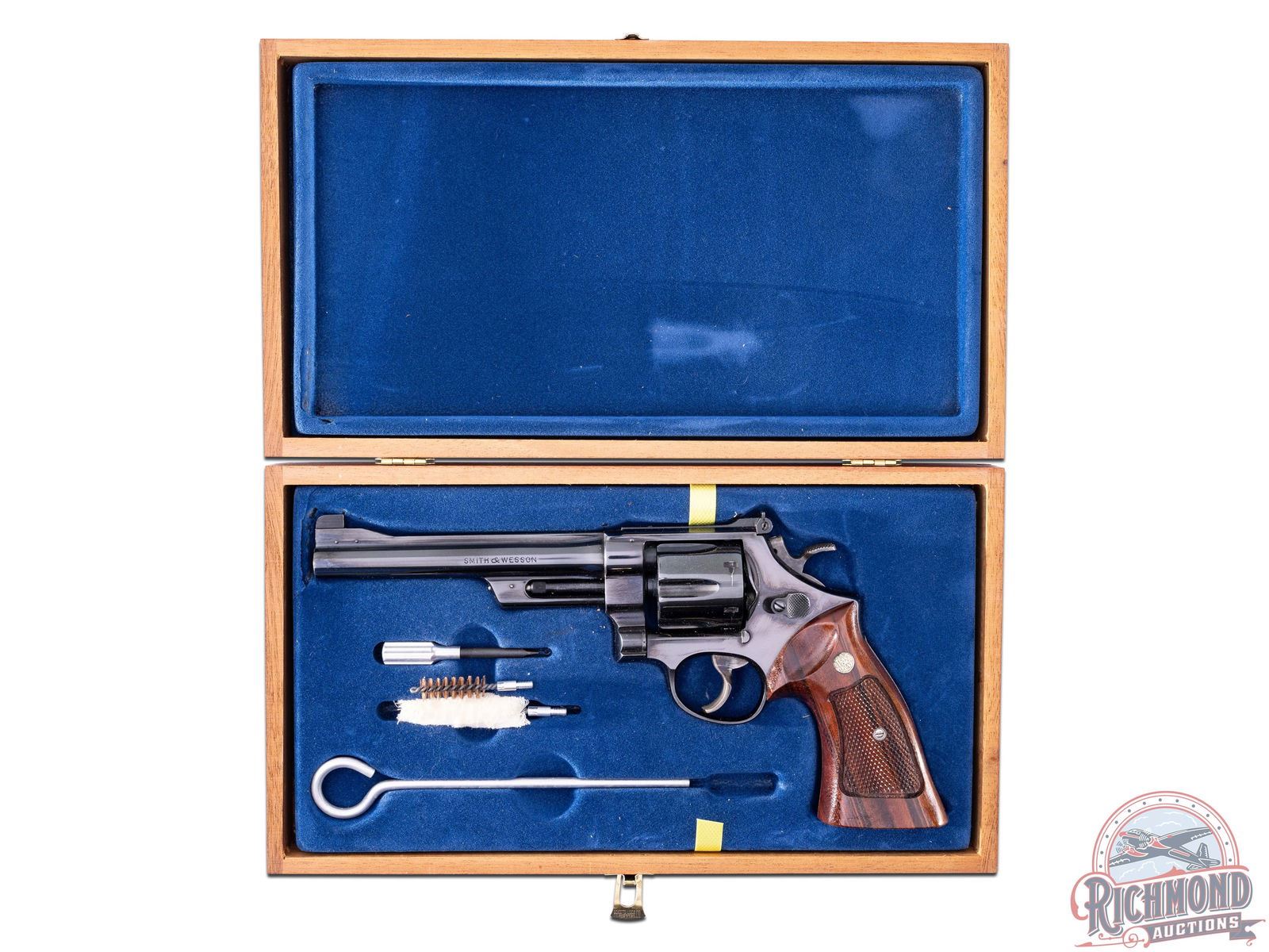 According to the Smith & Wesson Historical Foundation, this N-frame revolver shipped from the factory in March 1960. Features a blued finish, 6-1/2" solid rib barrel with ramp blade front sight and rear adjustable notch. Six round swing-out fluted cylinder chambered for the 38 Special cartridge. case-hardened trigger and hammer. Factory checkered walnut grips with gold tone S&W medallions. Comes in a factory wood case with S&W factory wax paper, cleaning tools and factory wrench. CALIBER: 38 SPL. S/N: 147059. FFL STATUS: Curio & Relic.