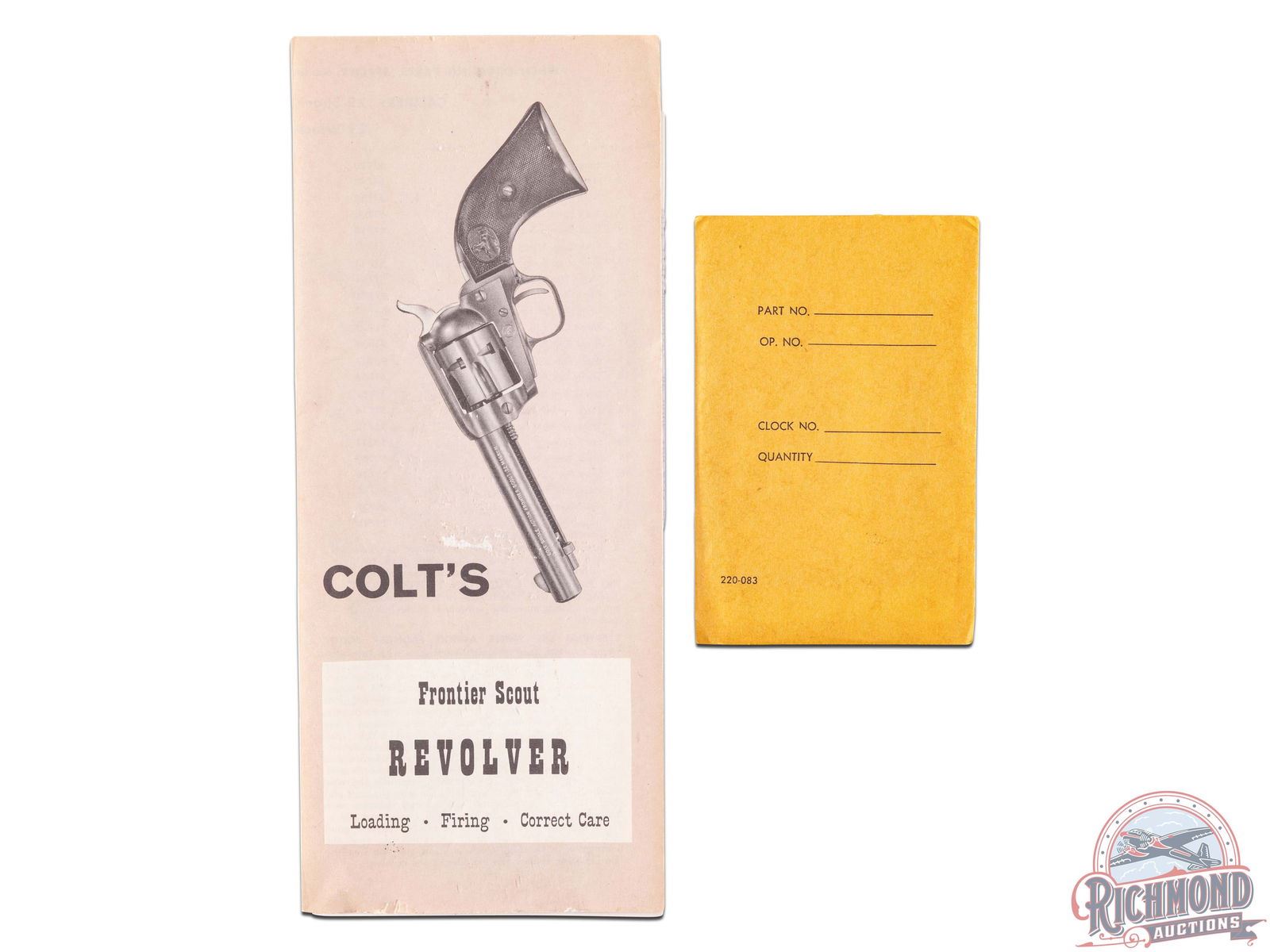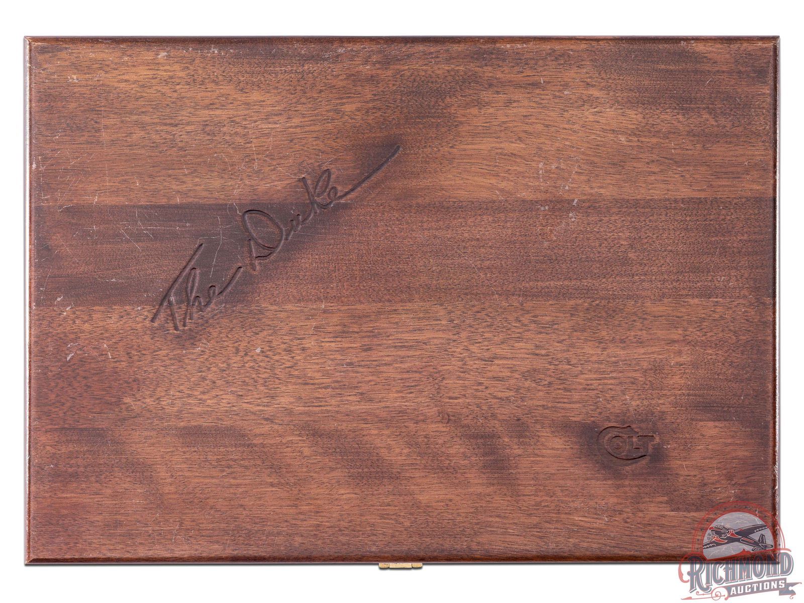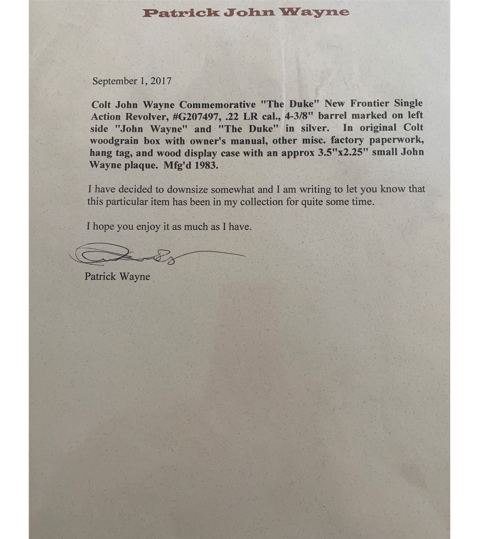Previously owned by Patrick Wayne, actor and son of John Wayne. Includes a copy of a signed letter by Patrick Wayne. Manufactured in 1983, this beautiful Single Action Army revolver features a 4-3/8" blued barrel with blade front sight and rear adjustable notch sight. Barrel is stamped with the single line Colt address on top, "NEW FRONTIER" on the right side and "JOHN WAYNE / The Duke" in a silver relief banner on the left side. Six shot blued fluted cylinder chambered for 22LR cartridges. Case-hardened receiver and blued frame. Nickel plated hammer, trigger, ejector, base pin and base latch. Factory logo black checkered synthetic grips with the E Pluribus unum eagle. Comes in a red velvet lined wood display case with a brass etched plaque depicting "The Duke", his Iowa birthplace home and "BORN / WINTERSET IOWA / MAY 26, 1907". Also includes Colt factory Frontier brochure and copy of signed letter from Patrick Wayne. CALIBER: 22 LR. S/N: G207497. FFL STATUS: Modern.