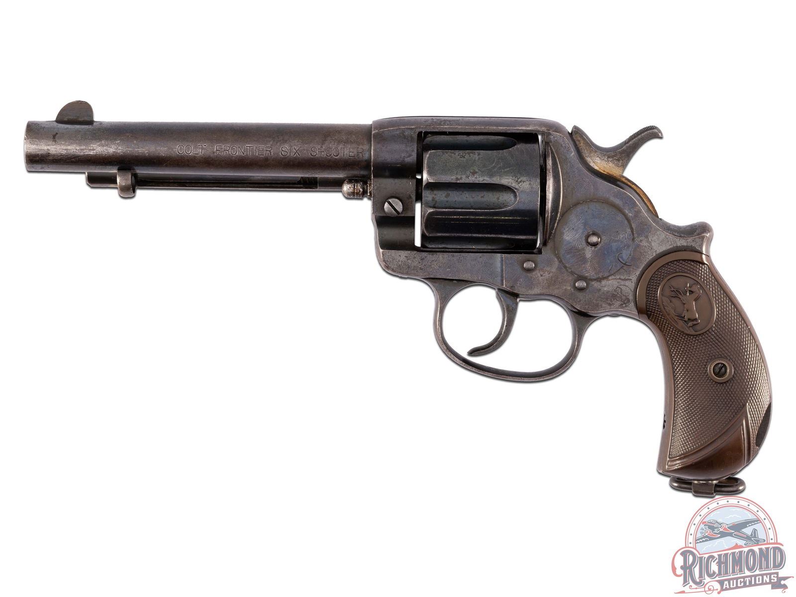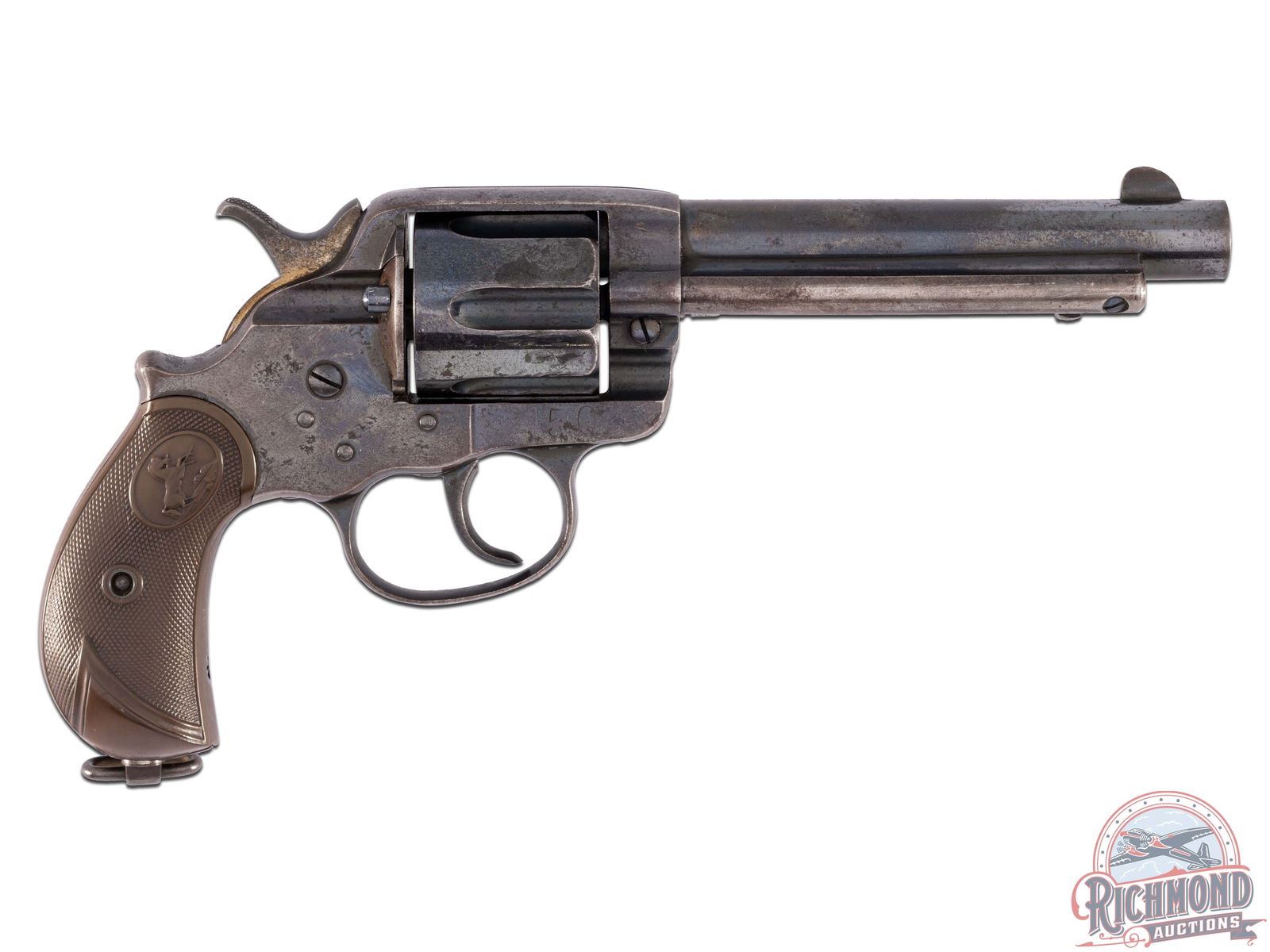 Manufactured in 1898. This large frame revolver features a 5-1/2" barrel with integrated rear notch sight and blade front sight. Top of the barrel is stamped with a single line Colt address and the left side is stamped "COLT FRONTIER SIX SHOOTER". No patent dates or caliber markings but appears to be chambered for the 45 Colt. Left side of the frame is stamped with the Rampant Colt logo. The number "50" is stamped on the left side of the frame at an angle and on the right side below the cylinder. Six-shot fluted cylinder with thin hinged loading gate. Cylinder serial number matches the serial number on the base of the grip. Birdshead style grip with original factory Colt synthetic grips with oval Rampant Colt embossed. Swivel lanyard loop on the base. CALIBER: 45 LC. S/N: 38423. FFL STATUS: Antique.