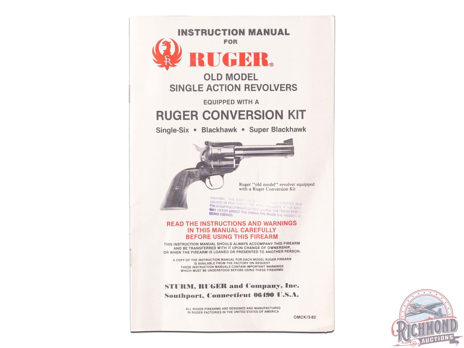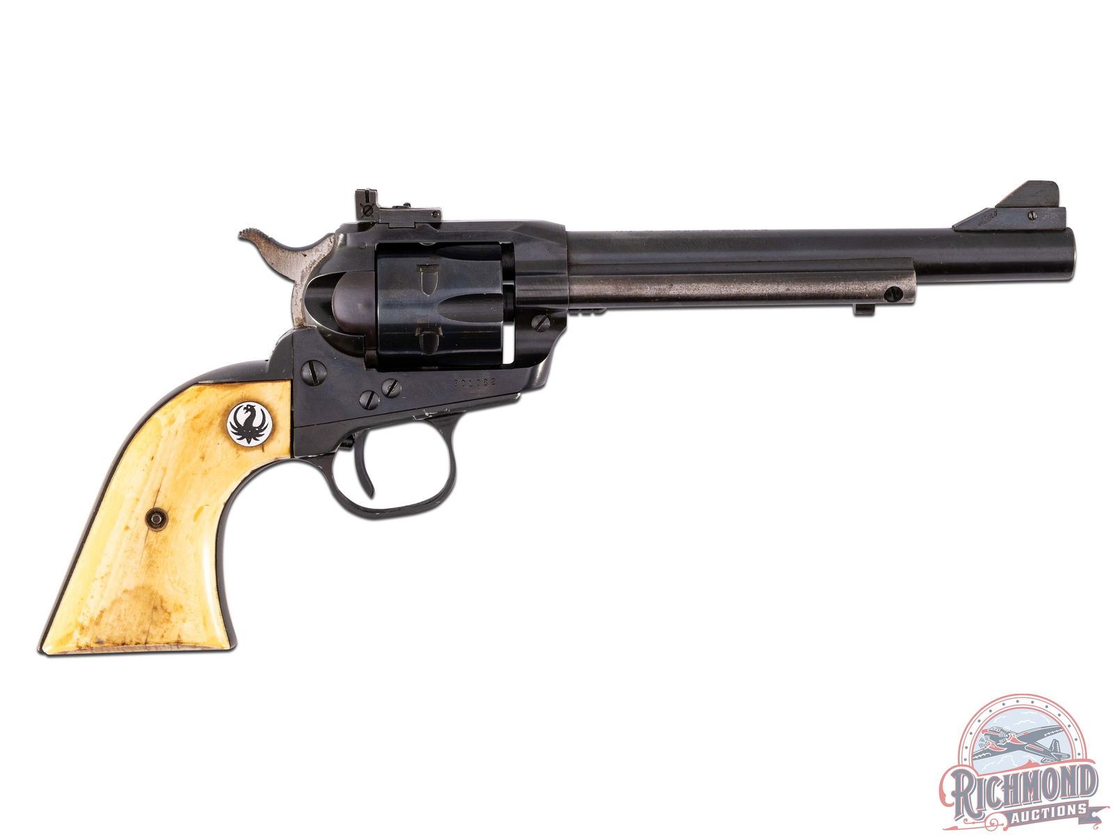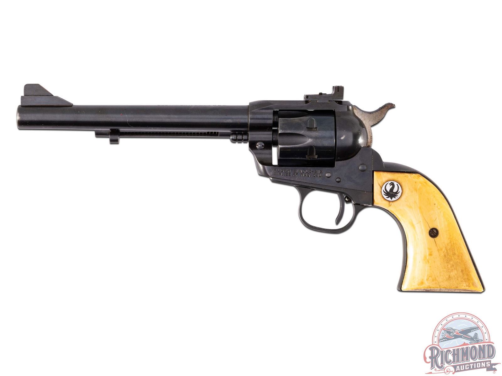 Manufactured in 1959, this first year Single Six Magnum model has NOT been converted with a transfer bar. Features a 6-1/2" barrel with Micro brand front ramp sight and rear adjustable notch sight. Blued six round fluted cylinder for magnum loads. Fitted with Factory Ruger bone grips with silver tone Phoenix medallions. Comes in a factory yellow box with conversion kit paperwork. CALIBER: 22 RF WIN MAG. S/N: 301082. FFL STATUS: Curio & Relic.