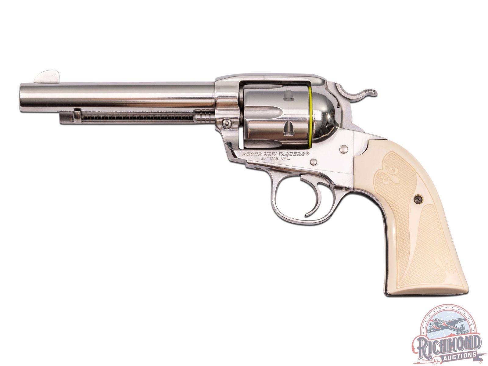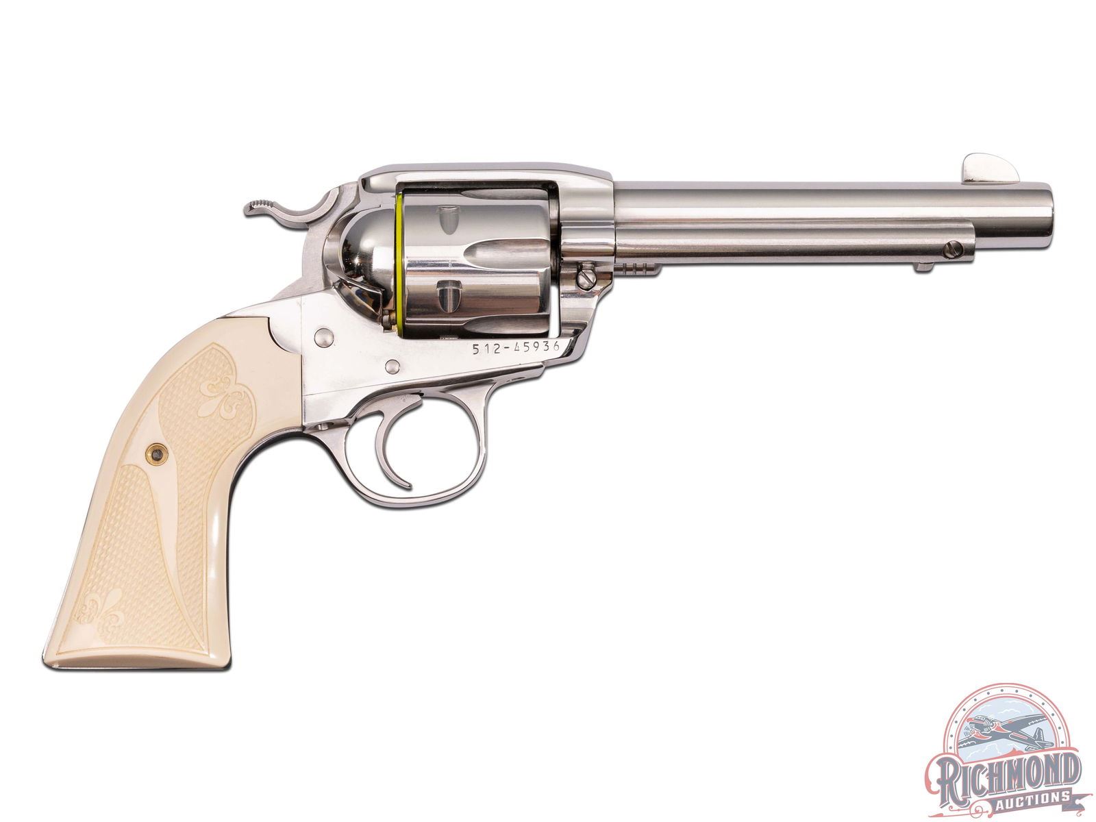 Manufactured in 2013 with the same original old west single action look, size and feel. Features a 5-1/2" barrel with integrated rear notch and front blade sight. High gloss stainless steel finish on the Bisley frame - larger grip and lower hammer. Six round fluted cylinder chambered for 357 magnum or 38 special cartridges. Fitted with classic bonded ivory checkered Fleur-de-Lis grips. Comes in the original factory case with factory cable lock and paperwork. A popular single action for S.A.S.S. shooters! CALIBER: 357 MAG. S/N: 512-45936. FFL STATUS: Modern.