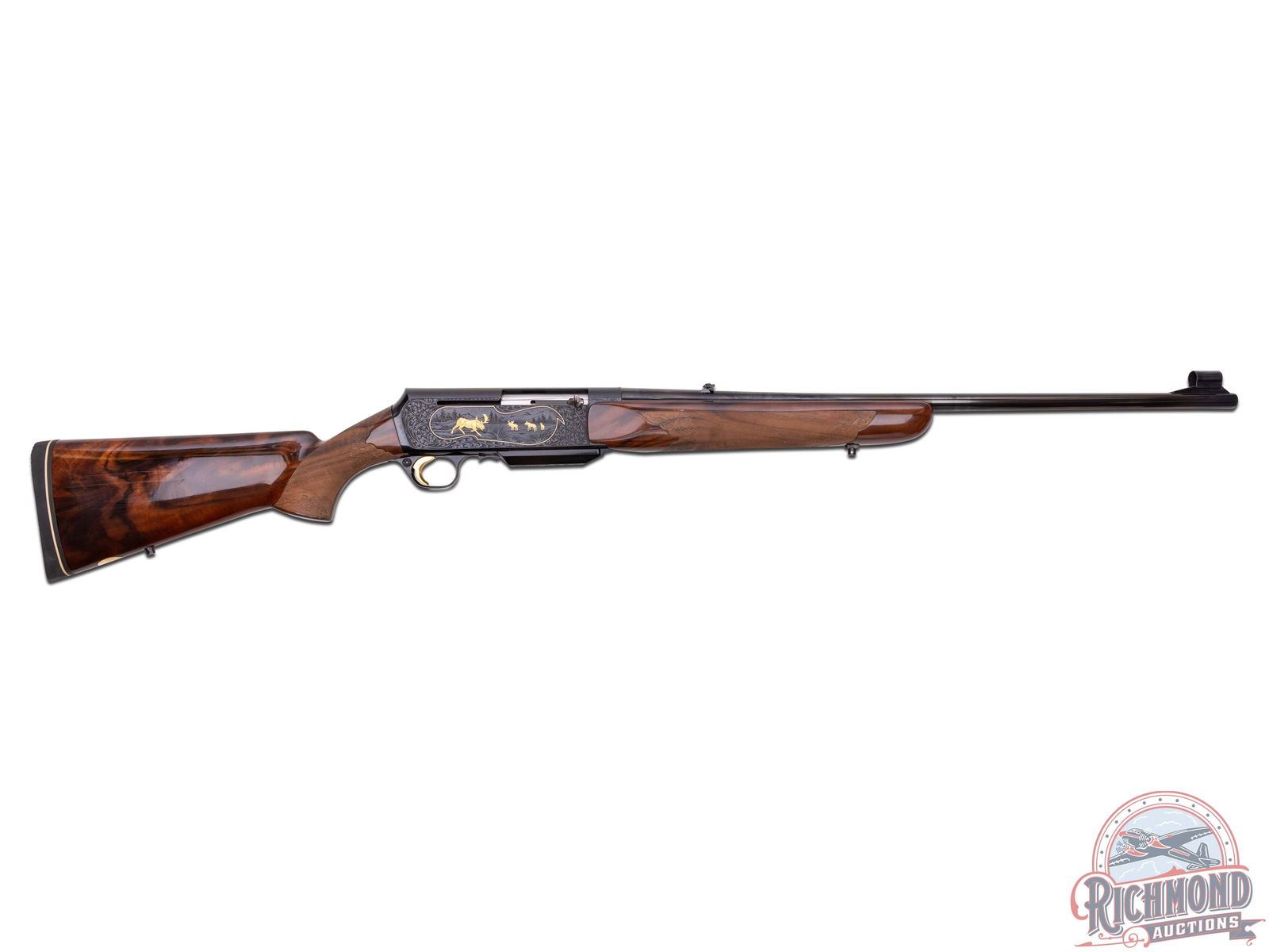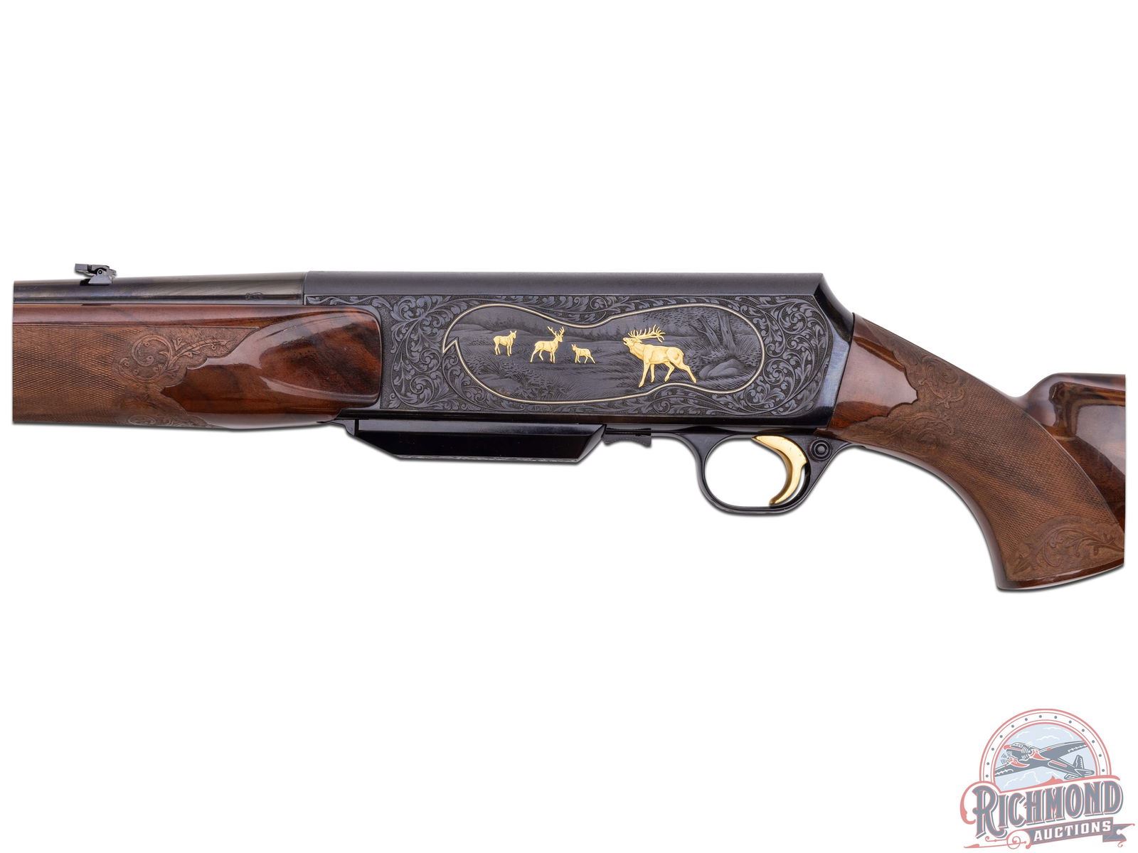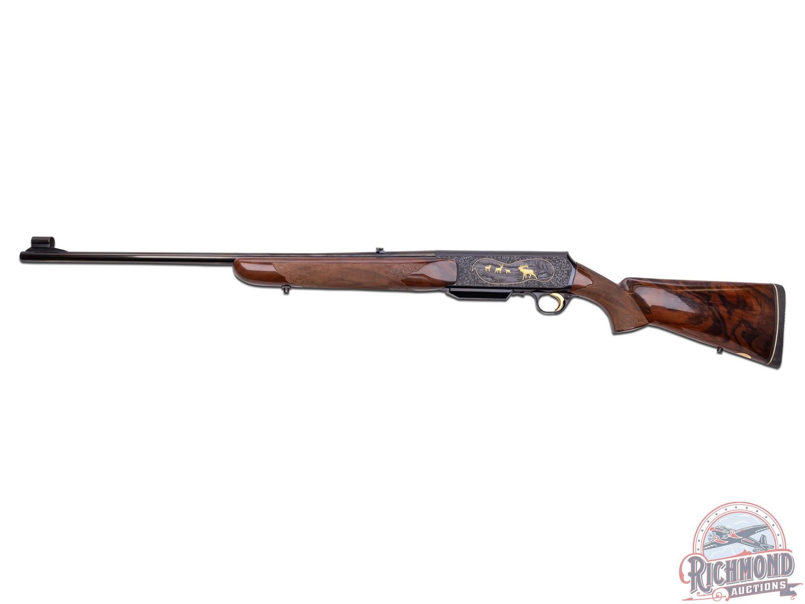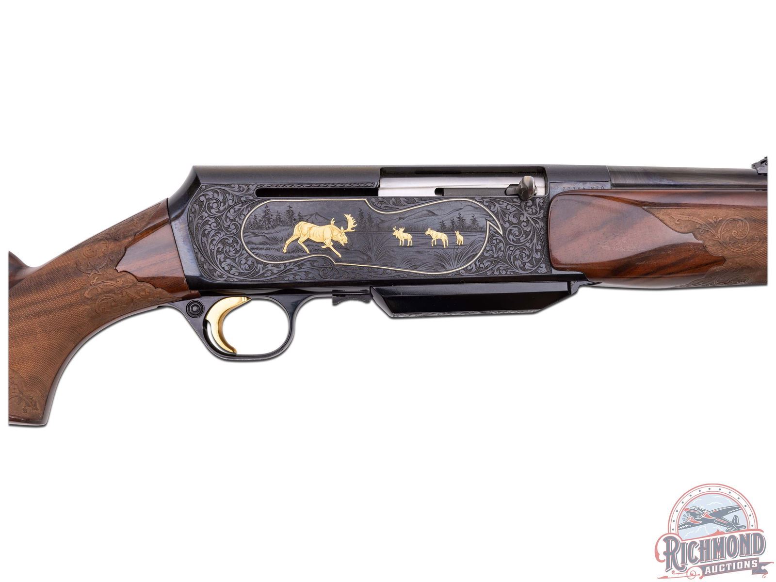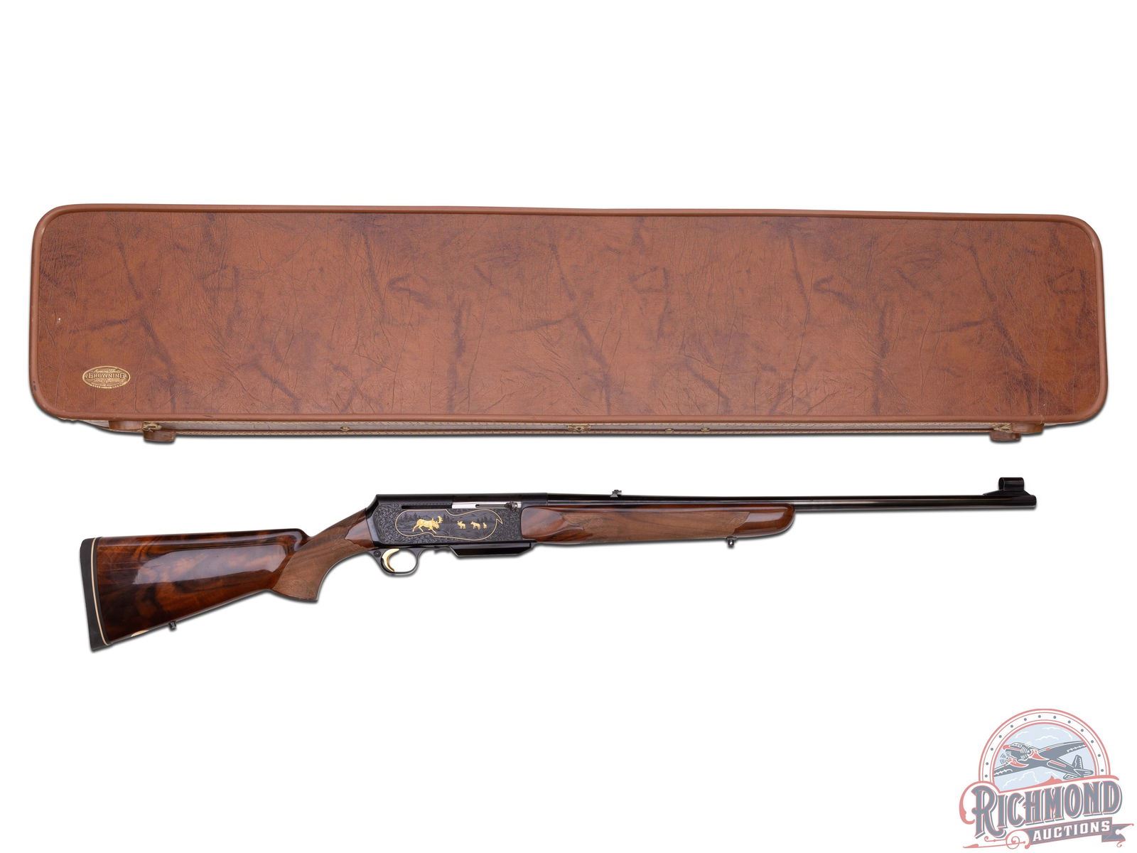 Made in Herstal, Belgium by Browning in 1970. 24" blued round barrel in 338 Winchester Magnum caliber with hooded ramp front sight and rear flip down sight. Barrel is marked with Belgium marking and Browning Patent and Address. Blued semi-automatic magnum receiver with frosted receiver top and full coverage moose scene in gold with a floral background engraved right side with left panel having a floral with gold elk scene and "A.Bee" signature. Action has gold washed trigger with push button safety and matching blued floral engraved detachable magazine. Figured walnut pistol grip stock with 18 lines per inch checkering surrounded by floral carving. butt stock is fitted with a "Browning" hard rubber recoil pad. Matching walnut forearm with same checkering and carving. Comes in Browning canvas fitted case. LOP: 13-5/8". DAC: 1-5/8". DAH: 2". CALIBER: 338 Win Mag. S/N: 77366M70. FFL STATUS: Curio & Relic.