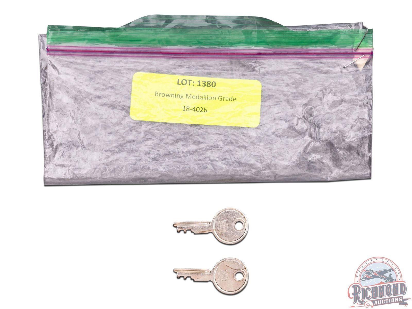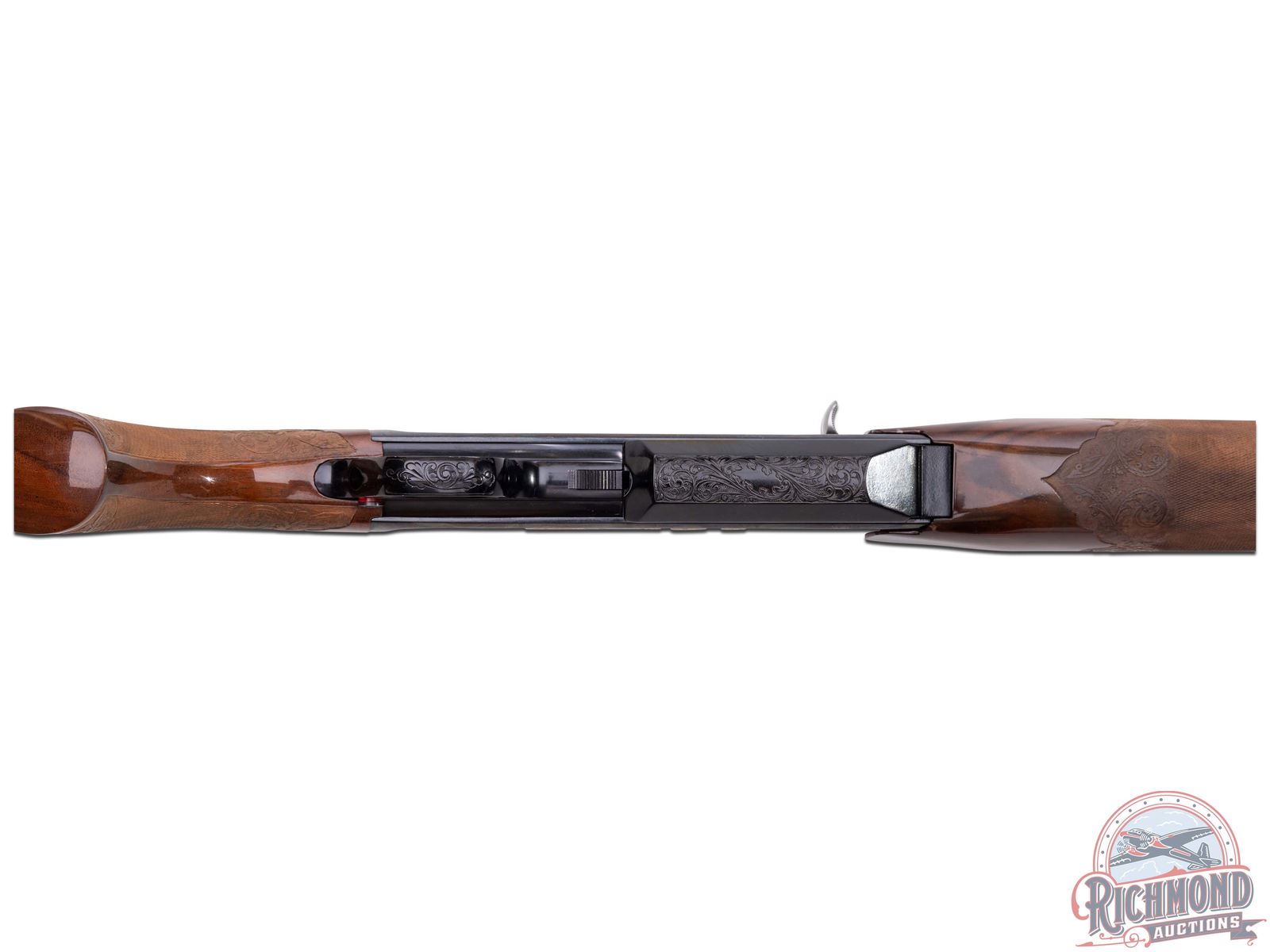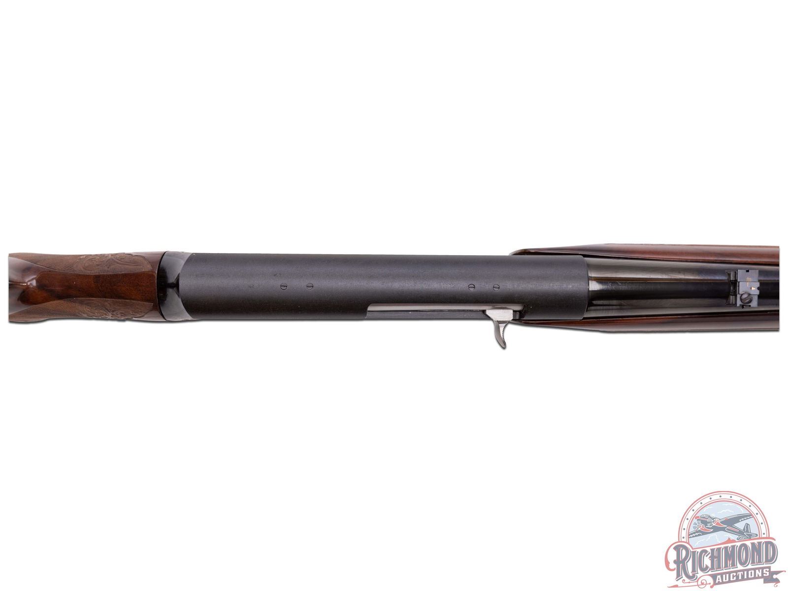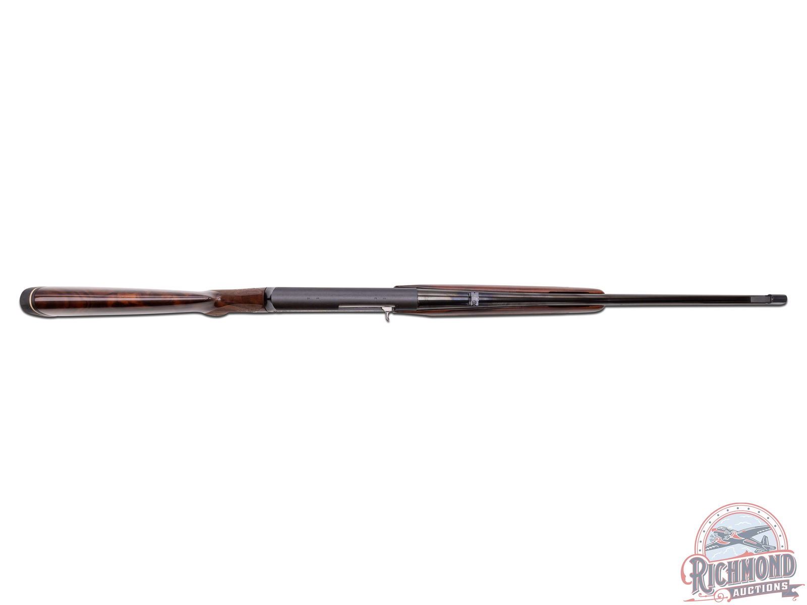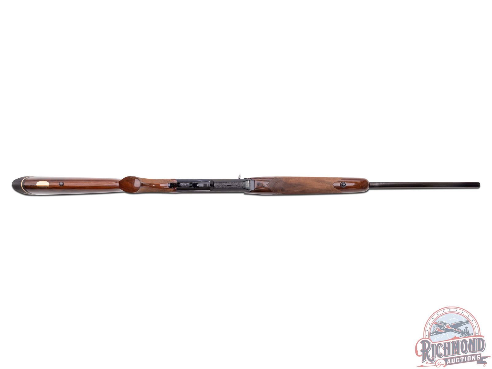 Made in Herstal, Belgium by Browning in 1970. 24" blued round barrel in 338 Winchester Magnum caliber with hooded ramp front sight and rear flip down sight. Barrel is marked with Belgium marking and Browning Patent and Address. Blued semi-automatic magnum receiver with frosted receiver top and full coverage moose scene in gold with a floral background engraved right side with left panel having a floral with gold elk scene and "A.Bee" signature. Action has gold washed trigger with push button safety and matching blued floral engraved detachable magazine. Figured walnut pistol grip stock with 18 lines per inch checkering surrounded by floral carving. butt stock is fitted with a "Browning" hard rubber recoil pad. Matching walnut forearm with same checkering and carving. Comes in Browning canvas fitted case. LOP: 13-5/8". DAC: 1-5/8". DAH: 2". CALIBER: 338 Win Mag. S/N: 77366M70. FFL STATUS: Curio & Relic.