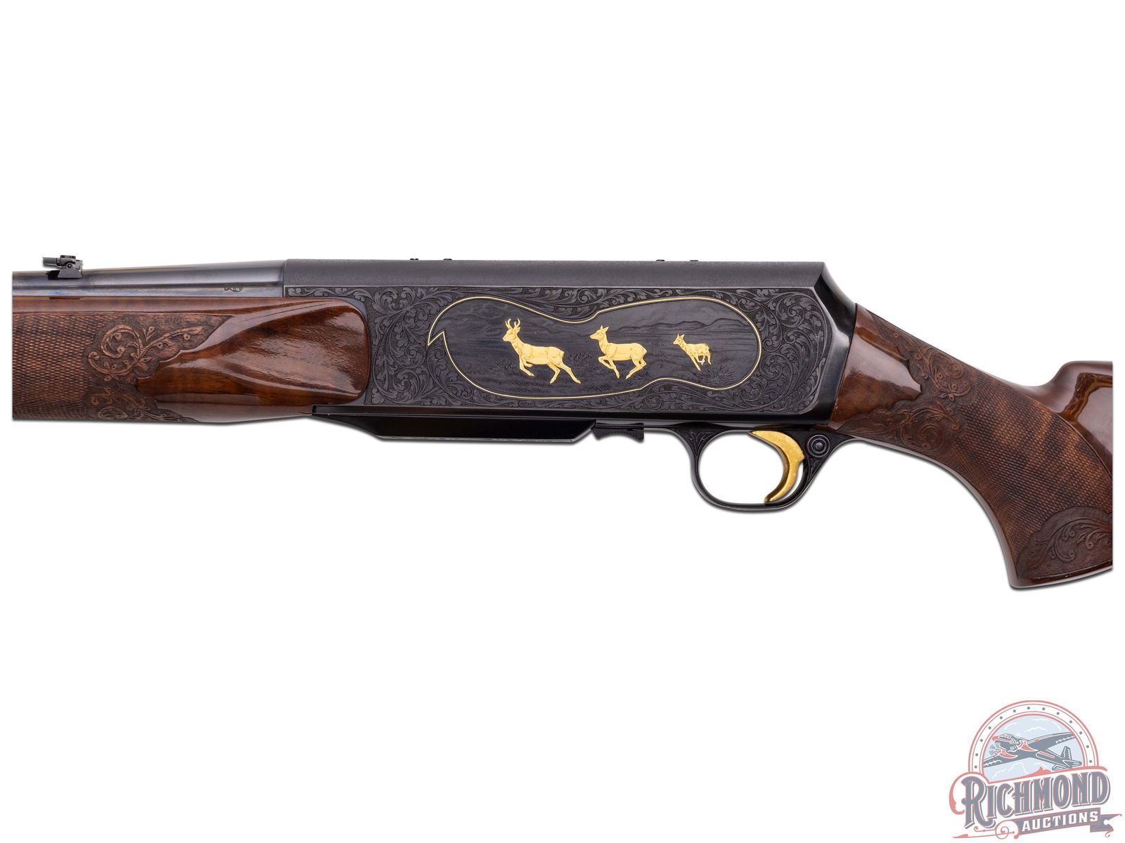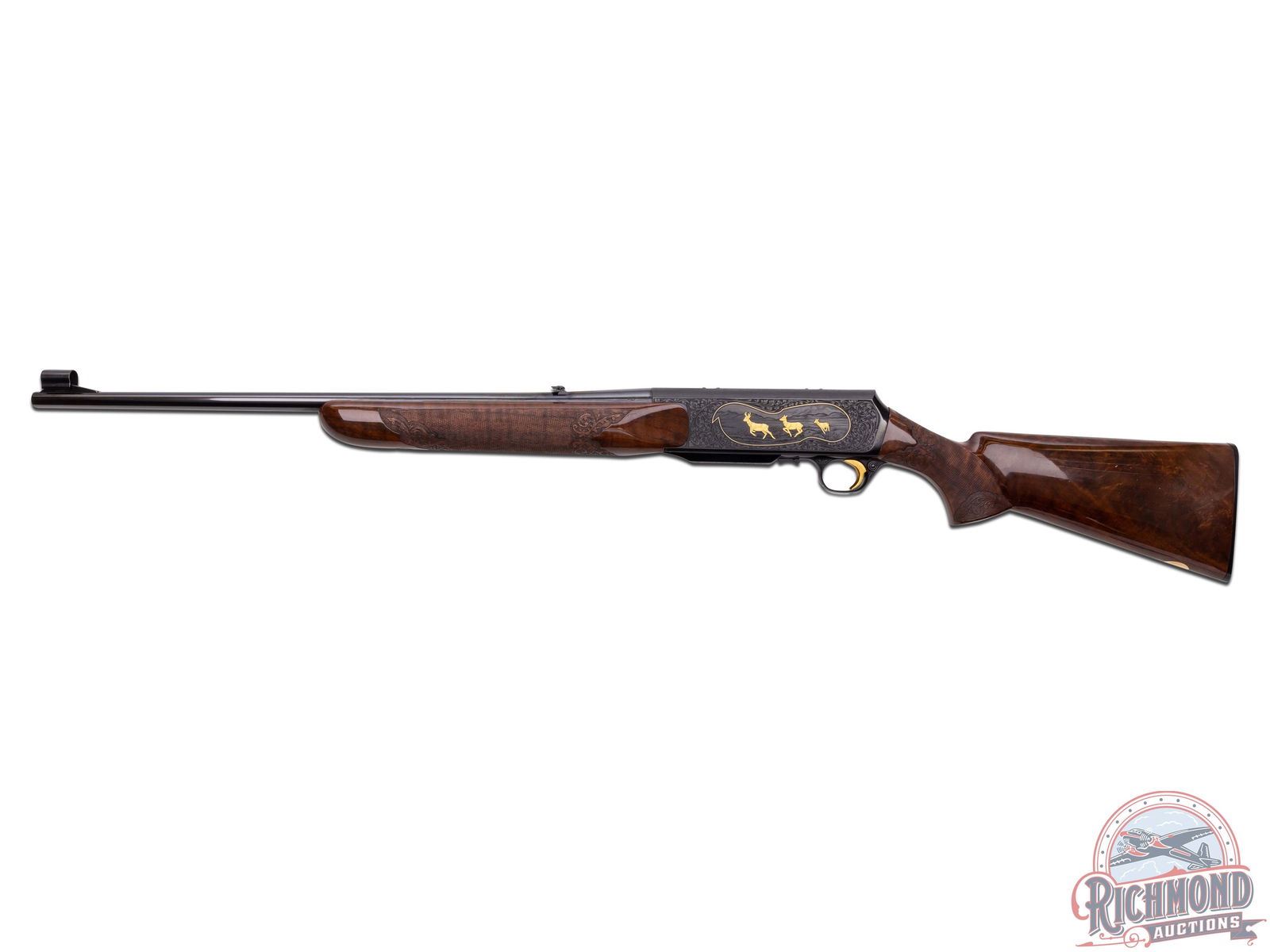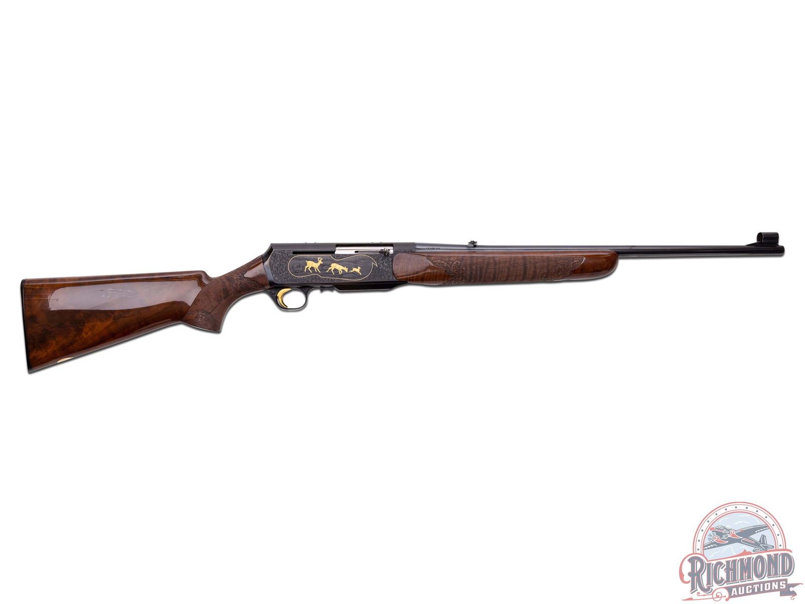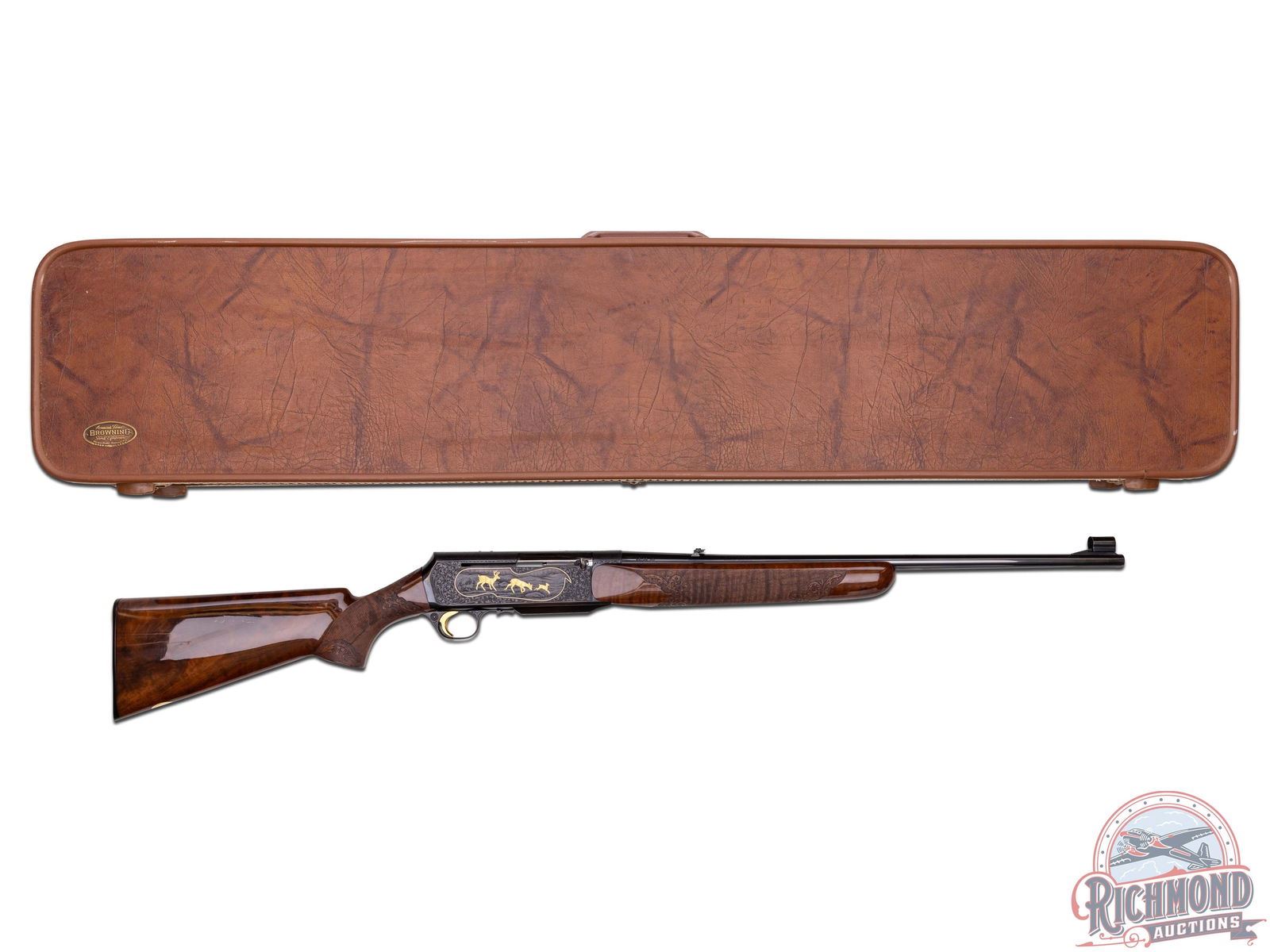 Made in Herstal, Belgium by Browning in 1968. A unique note is that this gun is marked on left scene with Angelo Bee signature and on a "rock" in the scene is the name "Gino" indicating a possible custom collaboration on this Grade V pattern between Angelo Bee and Gino Cargnel. More research is needed here. Rifle is fitted with blued round 22" steel tapered with hooded ramp front sight and fold down rear sight. Barrel is marked with Belgium Patent Pending marking, caliber, serial number "46120M8", and Browning Company marking. Blued semi-automatic action with stippled top with gold deer scene on right with floral background. Left side has gold antelope scene with "Gino" on a rock and a floral background signed lower dead center "A. Bee". Action has gold washed trigger and floral engraved detachable magazine. Feathercrotch walnut pistol grip stock with checkered grip with floral border carving and fitted with "Browning" hard rubber butt plate. Matching walnut forearm with no sling swivel provisions. This rifle will be pictured in the up and coming Angelo Bee Engraving Book. Comes with Browning tan luggage case. LOP: 13-5/8". DAC: 1-5/8". DAH: 2". CALIBER: 308 Winchester. S/N: 46120M8. FFL STATUS: Curio & Relic.