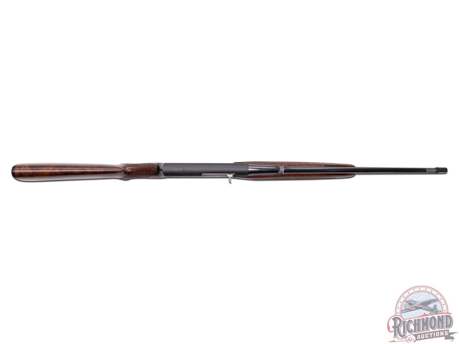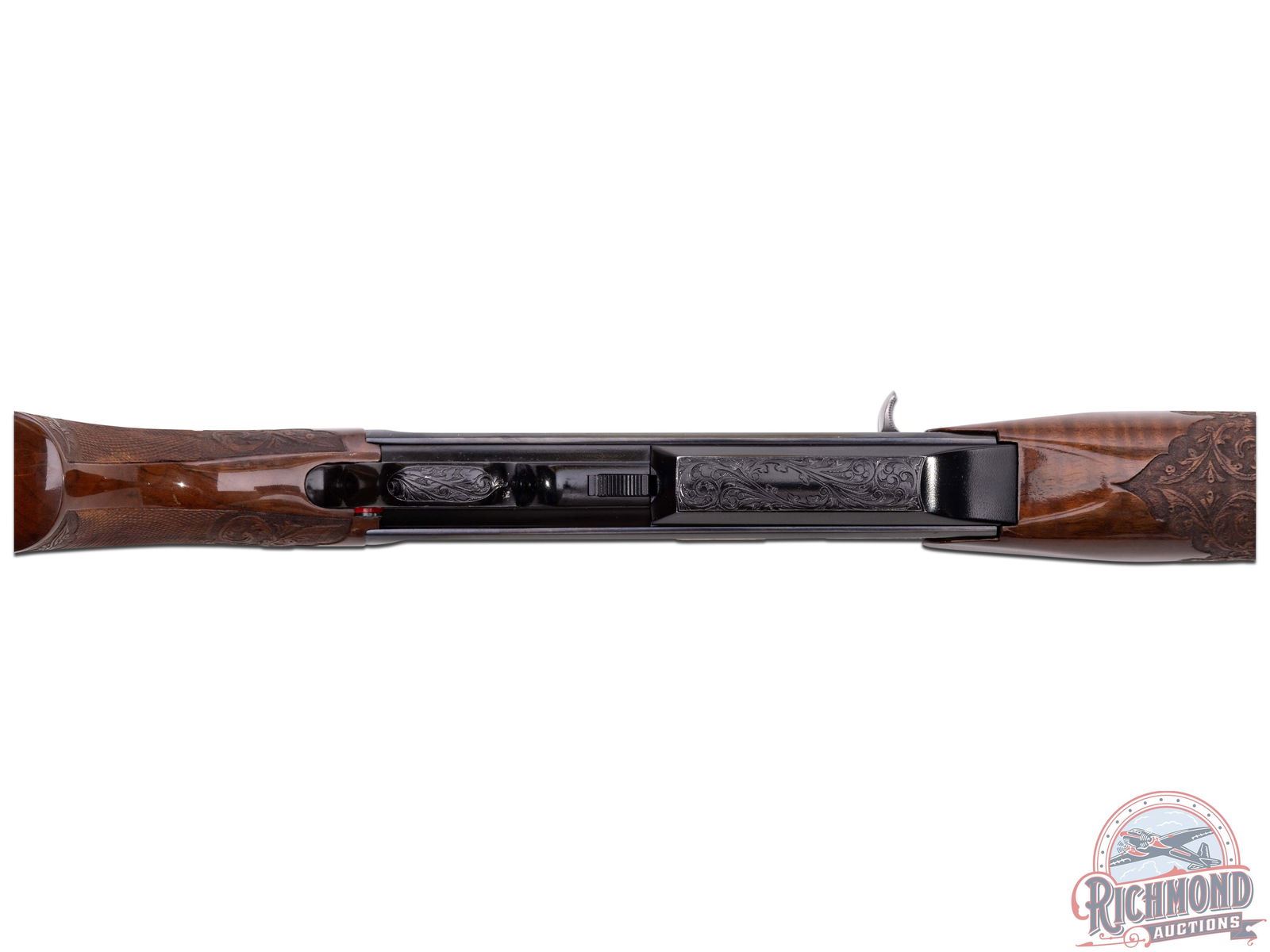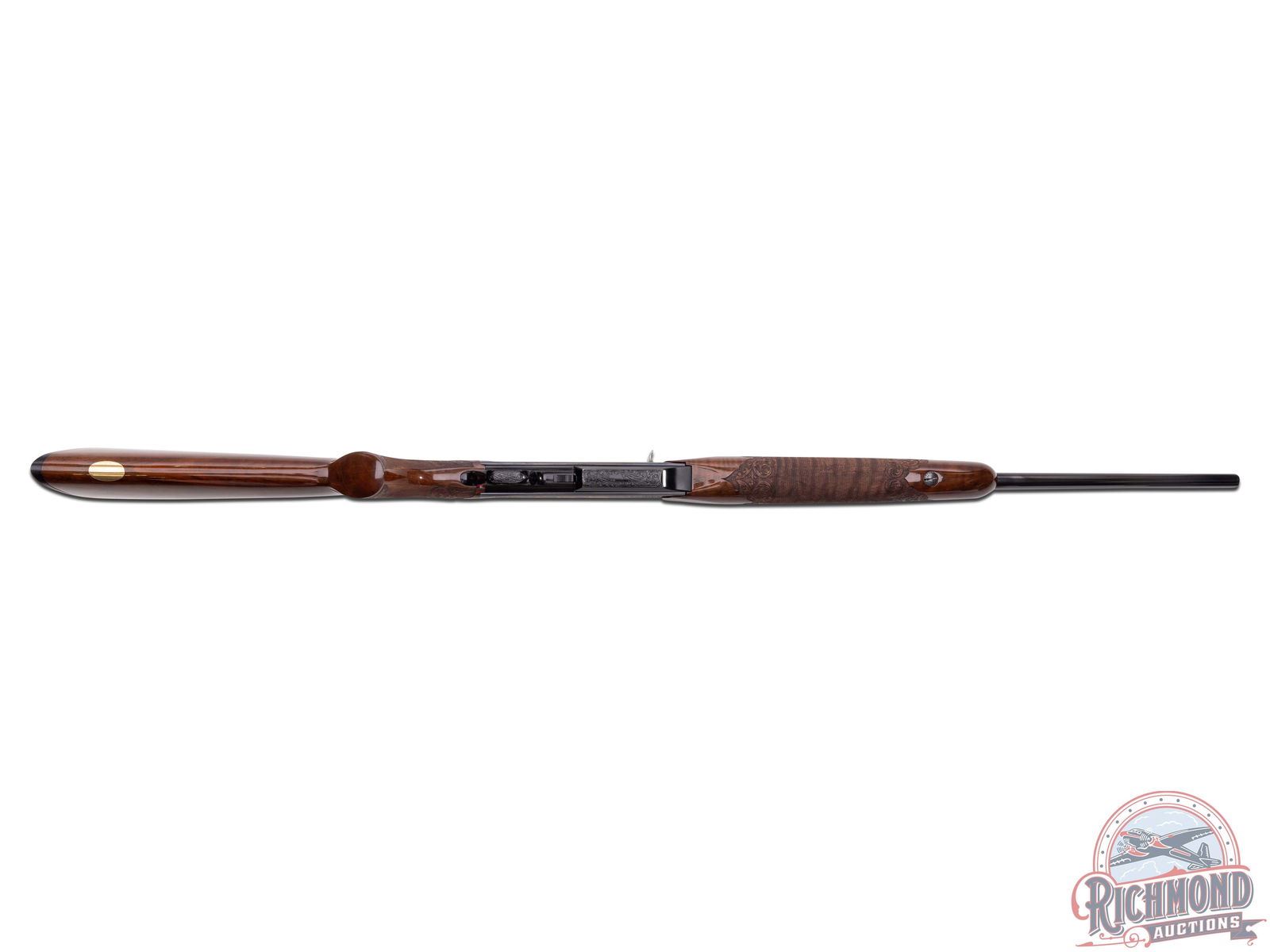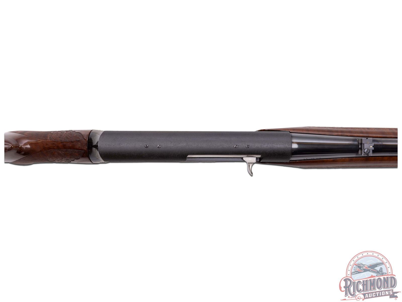 Made in Herstal, Belgium by Browning in 1968. A unique note is that this gun is marked on left scene with Angelo Bee signature and on a "rock" in the scene is the name "Gino" indicating a possible custom collaboration on this Grade V pattern between Angelo Bee and Gino Cargnel. More research is needed here. Rifle is fitted with blued round 22" steel tapered with hooded ramp front sight and fold down rear sight. Barrel is marked with Belgium Patent Pending marking, caliber, serial number "46120M8", and Browning Company marking. Blued semi-automatic action with stippled top with gold deer scene on right with floral background. Left side has gold antelope scene with "Gino" on a rock and a floral background signed lower dead center "A. Bee". Action has gold washed trigger and floral engraved detachable magazine. Feathercrotch walnut pistol grip stock with checkered grip with floral border carving and fitted with "Browning" hard rubber butt plate. Matching walnut forearm with no sling swivel provisions. This rifle will be pictured in the up and coming Angelo Bee Engraving Book. Comes with Browning tan luggage case. LOP: 13-5/8". DAC: 1-5/8". DAH: 2". CALIBER: 308 Winchester. S/N: 46120M8. FFL STATUS: Curio & Relic.