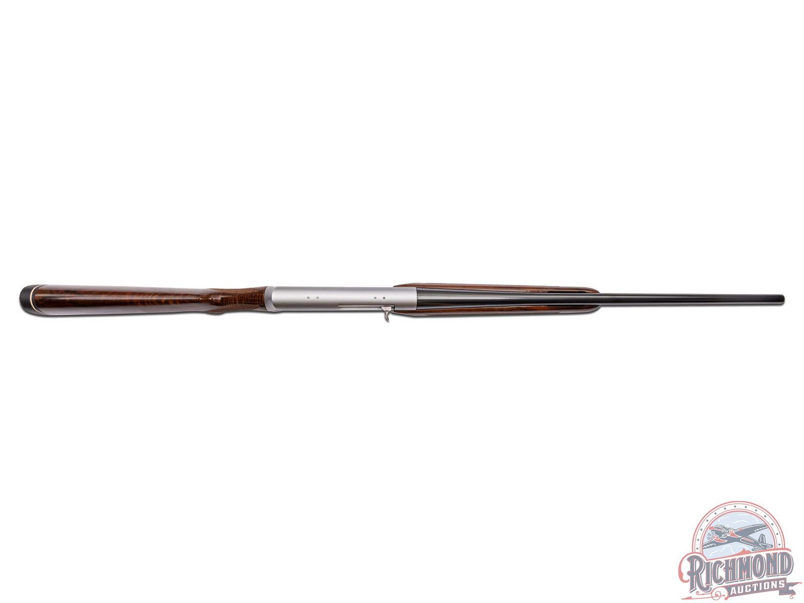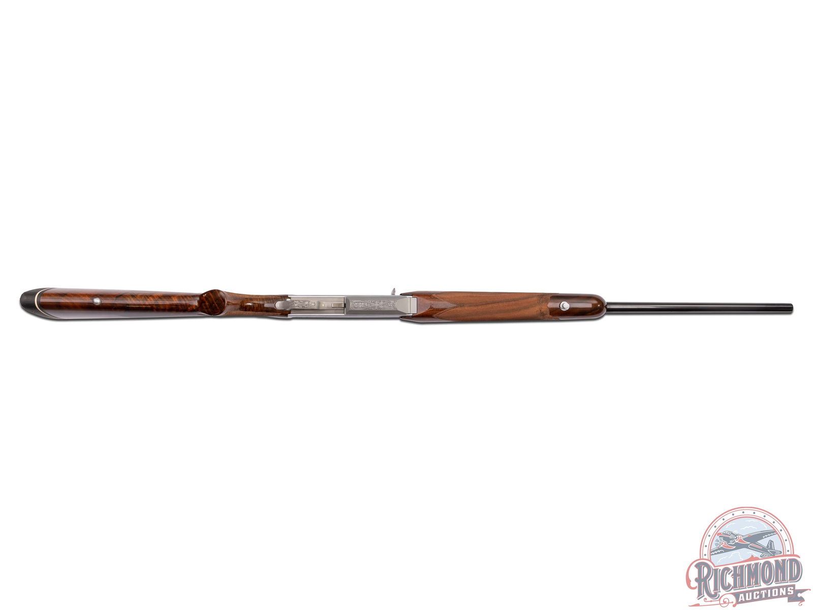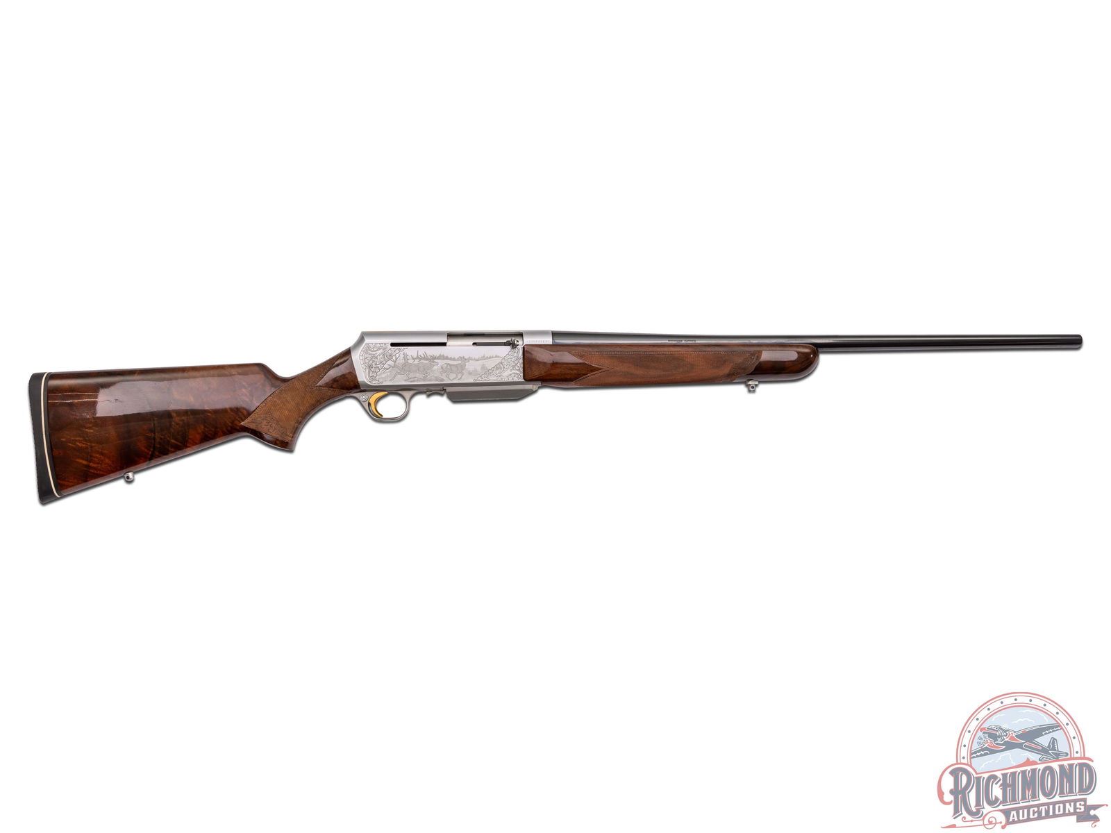 Made in Belgium by Browning in 1978. 24" blued tapered round sightless barrel in 7M/M Rem Mag caliber with Browning address and caliber markings. Satin finished full game scene engraved Grade IV semi-automatic action with engraved detachable magazine. Left side depicts moose scene with "J. Bague" signature with right depicting running elk. Action has gold washed trigger and push button safety. Figured walnut checkered pistol grip butt stock with carved checkering borders with factory Browning hard rubber pad. Matching floral carved border checkered walnut forearm. LOP: 13-5/8". DAC: 1-5/8". DAH: 2". CALIBER: 7M/M Rem Mag. S/N: 437RP02195. FFL STATUS: Modern.