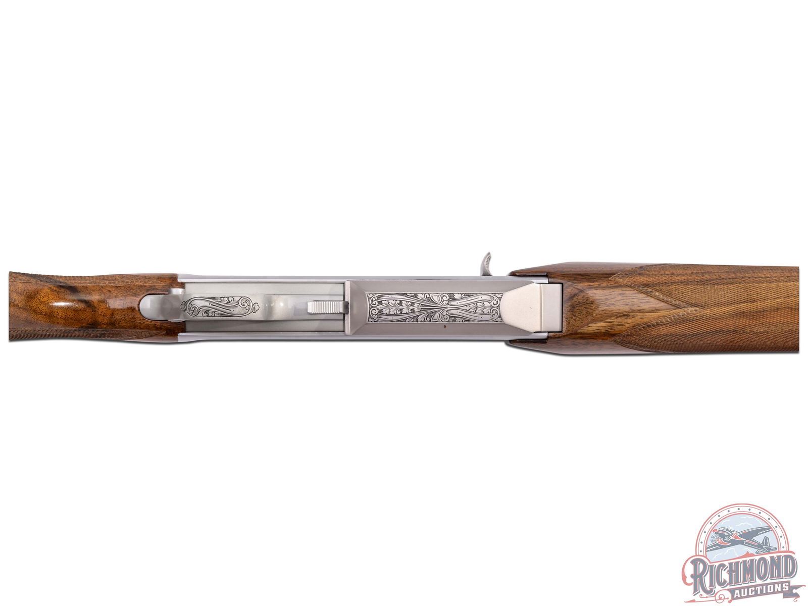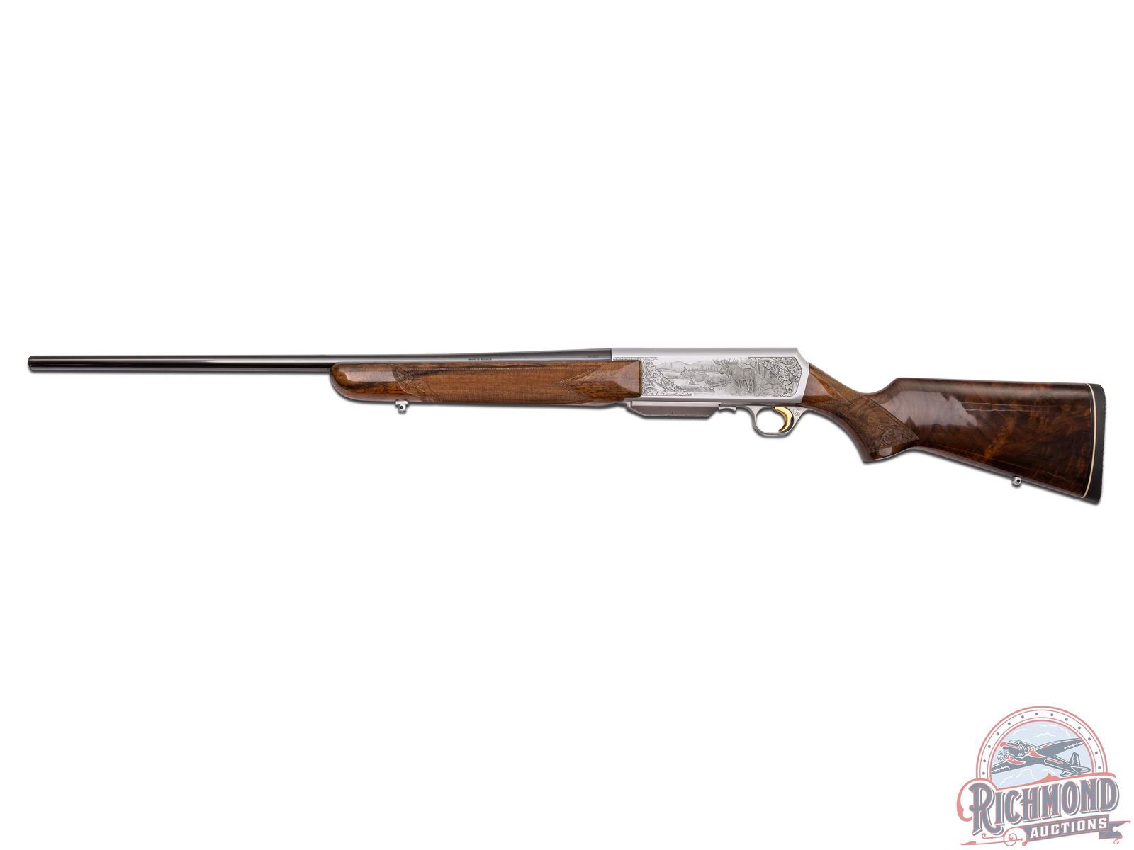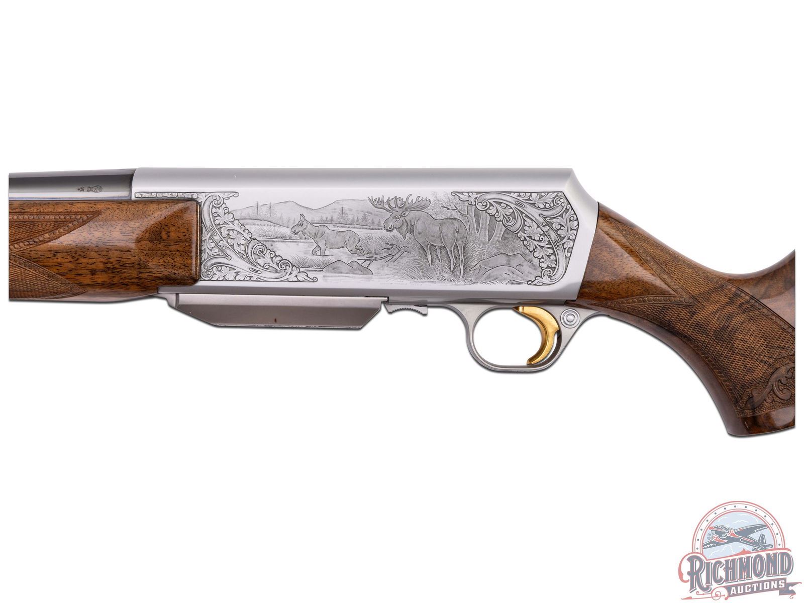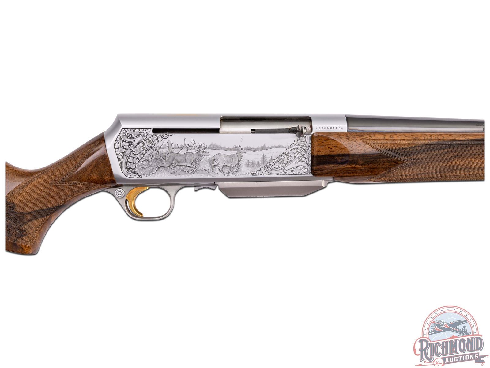 Made in Herstal, Belgium by Browning in 1979. 24" blued sightless round tapered steel barrel with Browning Utah and Montreal addresses in .300 Winchester Magnum caliber. Satin finish engraved receiver with elk scene on right panel and moose scene on left with floral scene on detachable magazine. No engraver's name visible. Action is factory drilled with plugged holes for scope mounting and has gold washed trigger and matching detachable magazine. Walnut checkered pistol grip stock with leaf and chain carved border with "Browning" hard rubber recoil pad. Matching walnut checkered forearm with floral and chain carved border. Stock is fitted with satin finished quick detachable sling swivel studs. LOP: 13-5/8". DAC: 1-5/8". DAH: 2". CALIBER: 300 WIN MAG. S/N: 437RN02135. FFL STATUS: Modern.