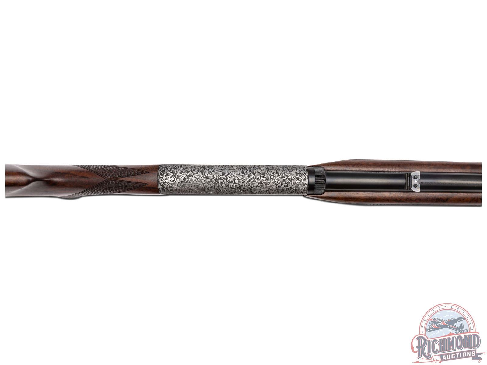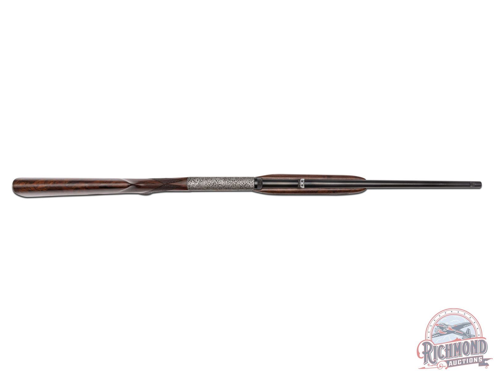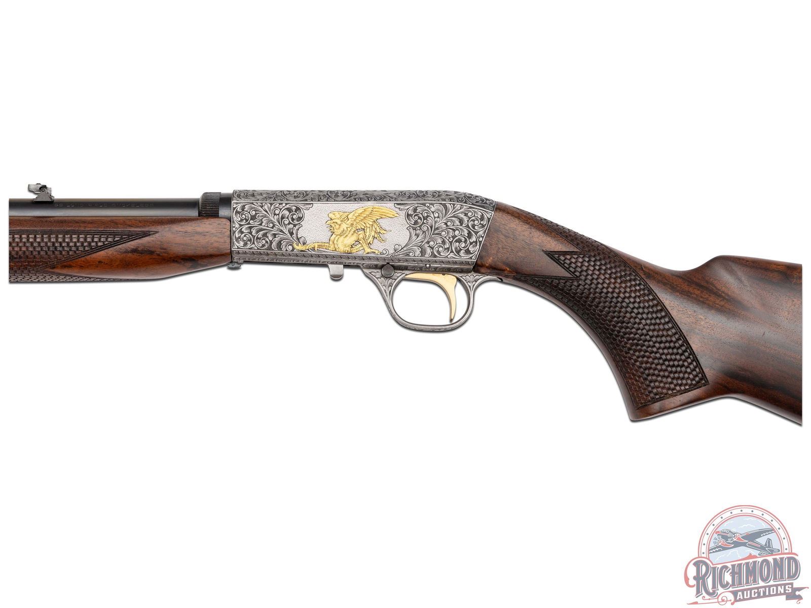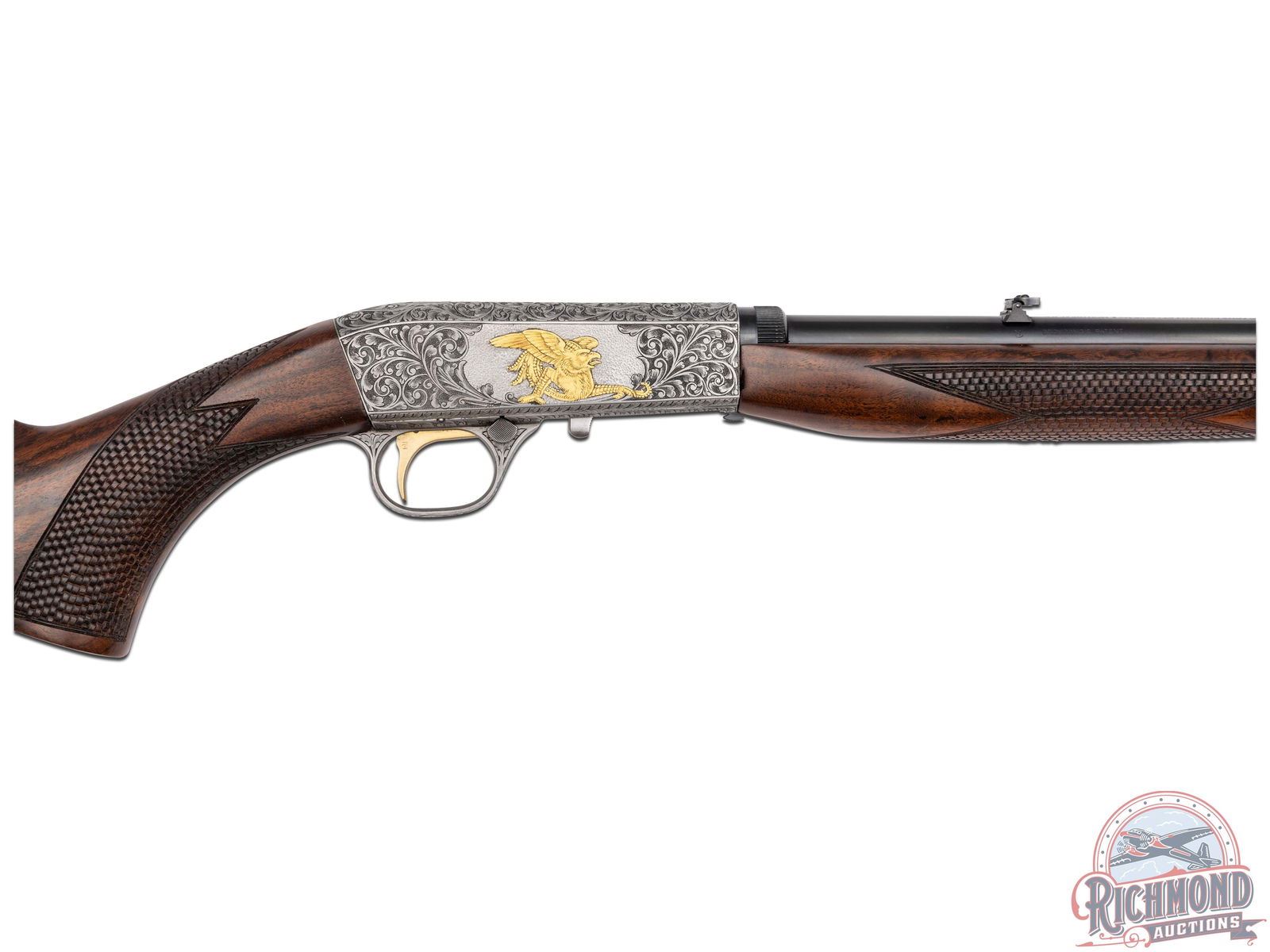 Manufactured in Belgium by FN, this unusual automatic does not have a letter pre or suffix in the serial number. Features a 19-1/4" blued barrel with rear adjustable leaf sight and blade with brass bead front sight. Coin finish receiver and trigger guard with 95% engraving of a beautiful floral scroll design with a gold embellished Gargoyle centered on both sides of the receiver. Left side of the receiver is signed "A.BEE". Gold washed trigger. Grade III figured walnut stock with side loading magazine and matching forearm with basketweave style checkering on the pistol grip and forearm. Fitted with a steel butt plate. Comes in a Browning factory canvas and leather case and includes an Angelo Bee Master Engraver signed COA serial numbered to this rifle. LOP: 13-3/4". CALIBER: 22 LR. S/N: 125647. FFL STATUS: Curio & Relic.