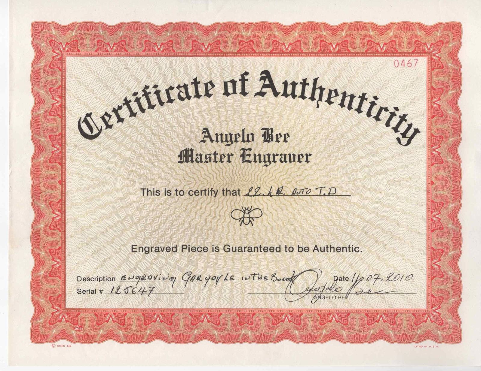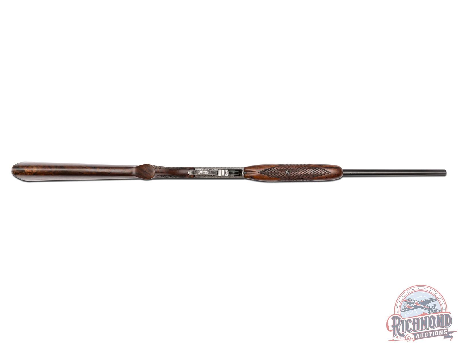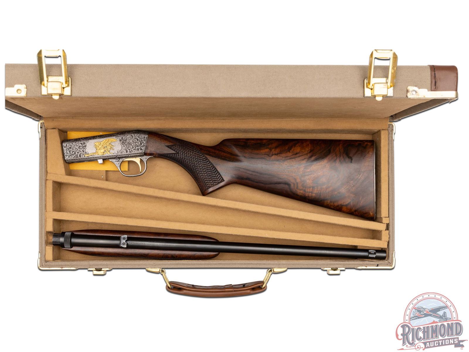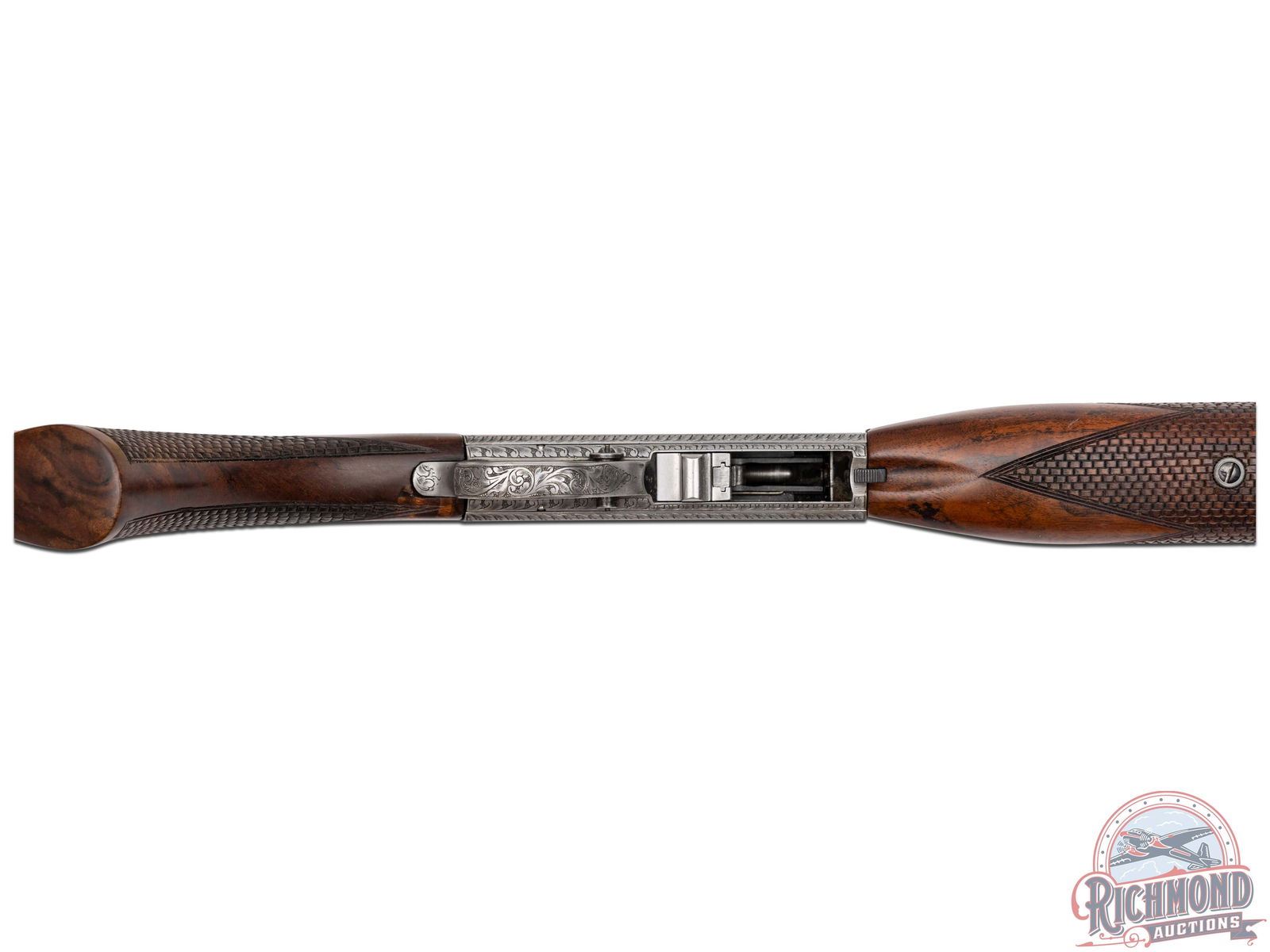 Manufactured in Belgium by FN, this unusual automatic does not have a letter pre or suffix in the serial number. Features a 19-1/4" blued barrel with rear adjustable leaf sight and blade with brass bead front sight. Coin finish receiver and trigger guard with 95% engraving of a beautiful floral scroll design with a gold embellished Gargoyle centered on both sides of the receiver. Left side of the receiver is signed "A.BEE". Gold washed trigger. Grade III figured walnut stock with side loading magazine and matching forearm with basketweave style checkering on the pistol grip and forearm. Fitted with a steel butt plate. Comes in a Browning factory canvas and leather case and includes an Angelo Bee Master Engraver signed COA serial numbered to this rifle. LOP: 13-3/4". CALIBER: 22 LR. S/N: 125647. FFL STATUS: Curio & Relic.